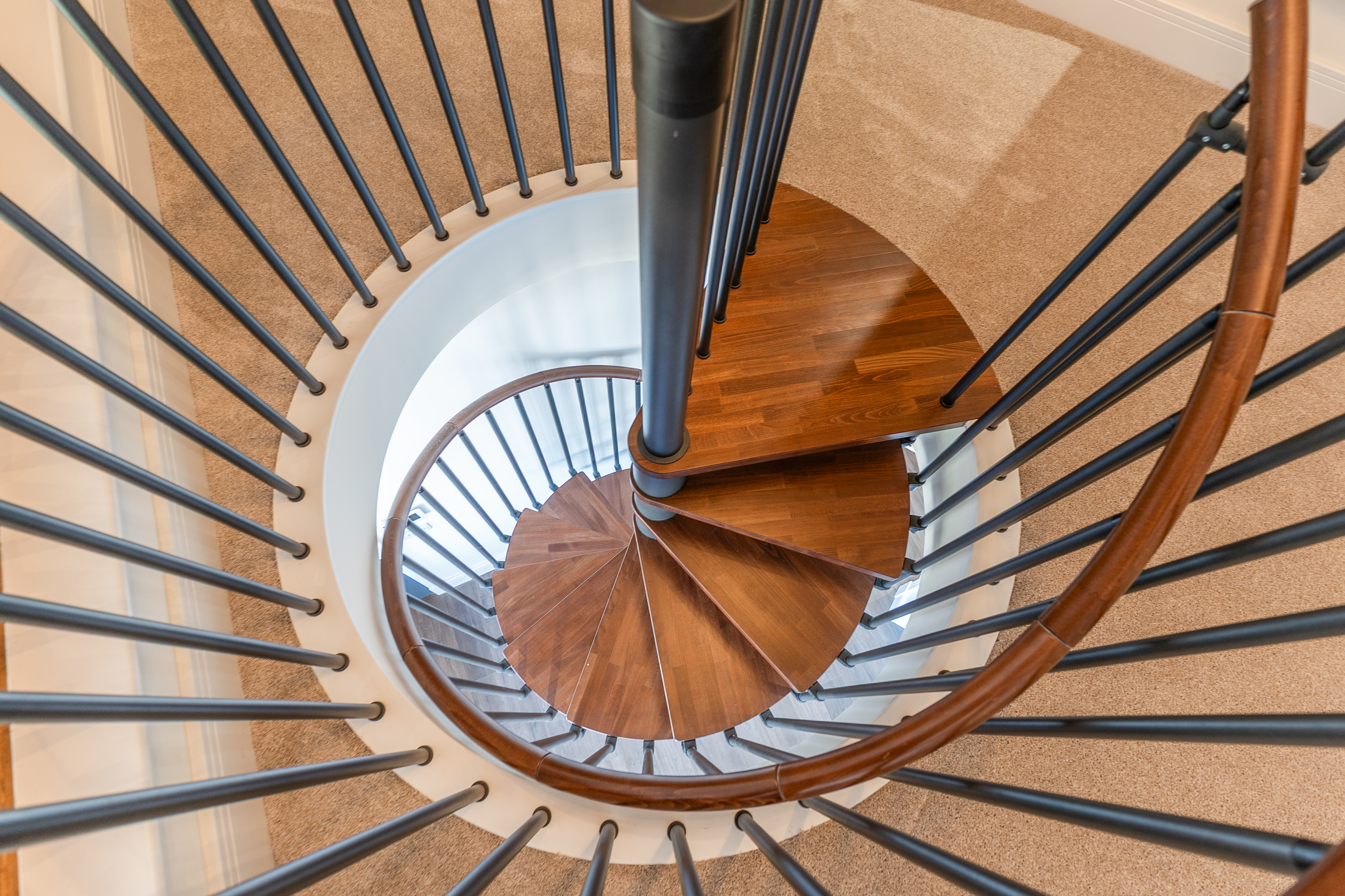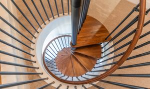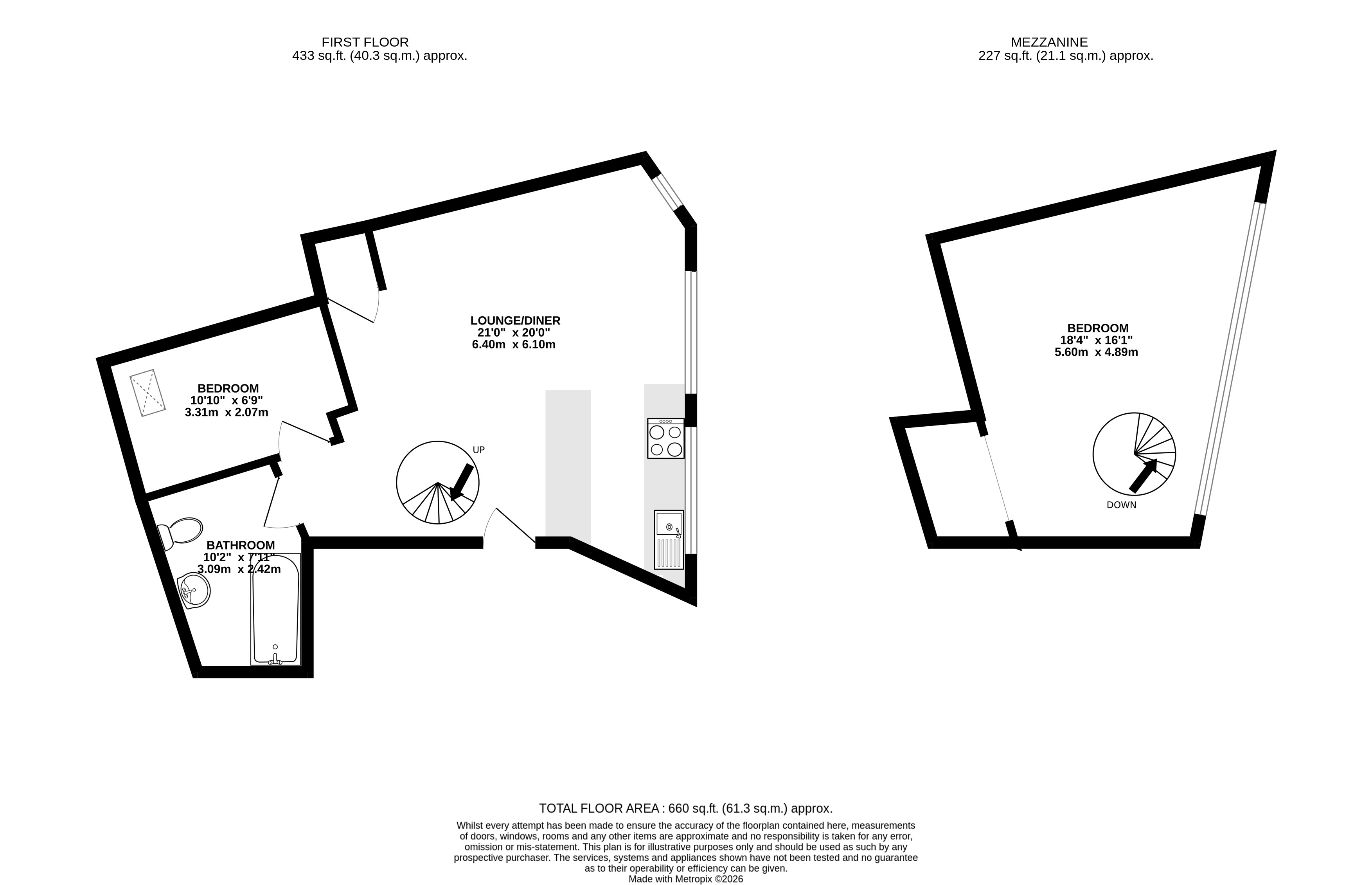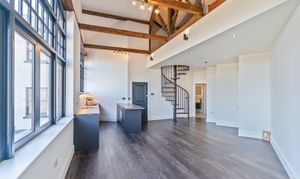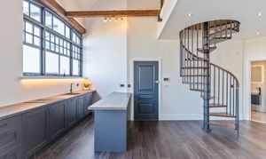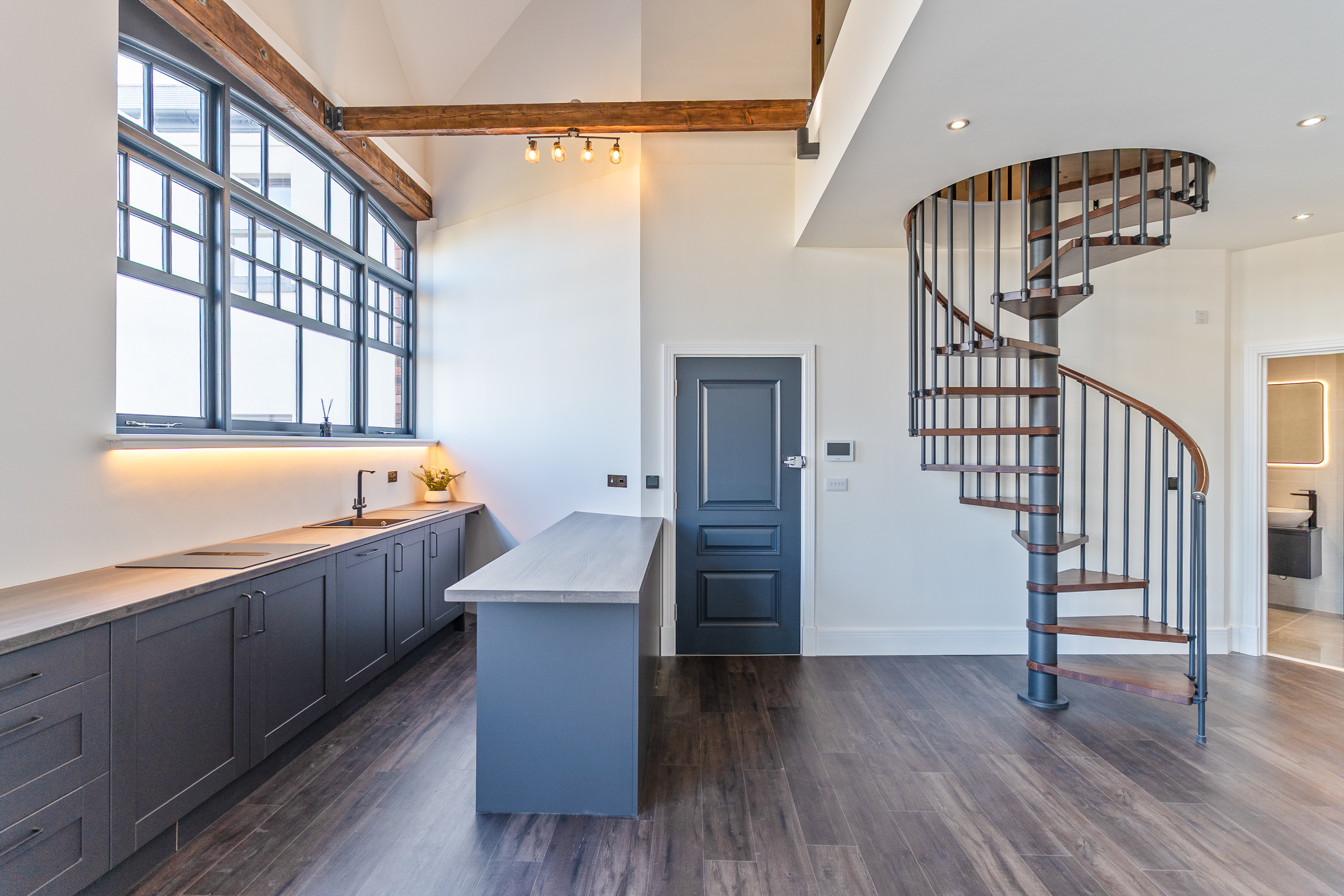 The apartment also benefits from a large mezzanine second bedroom, accessed via an elegant Italian spiral staircase, providing a unique and stylish sleeping area that overlooks the main living space.