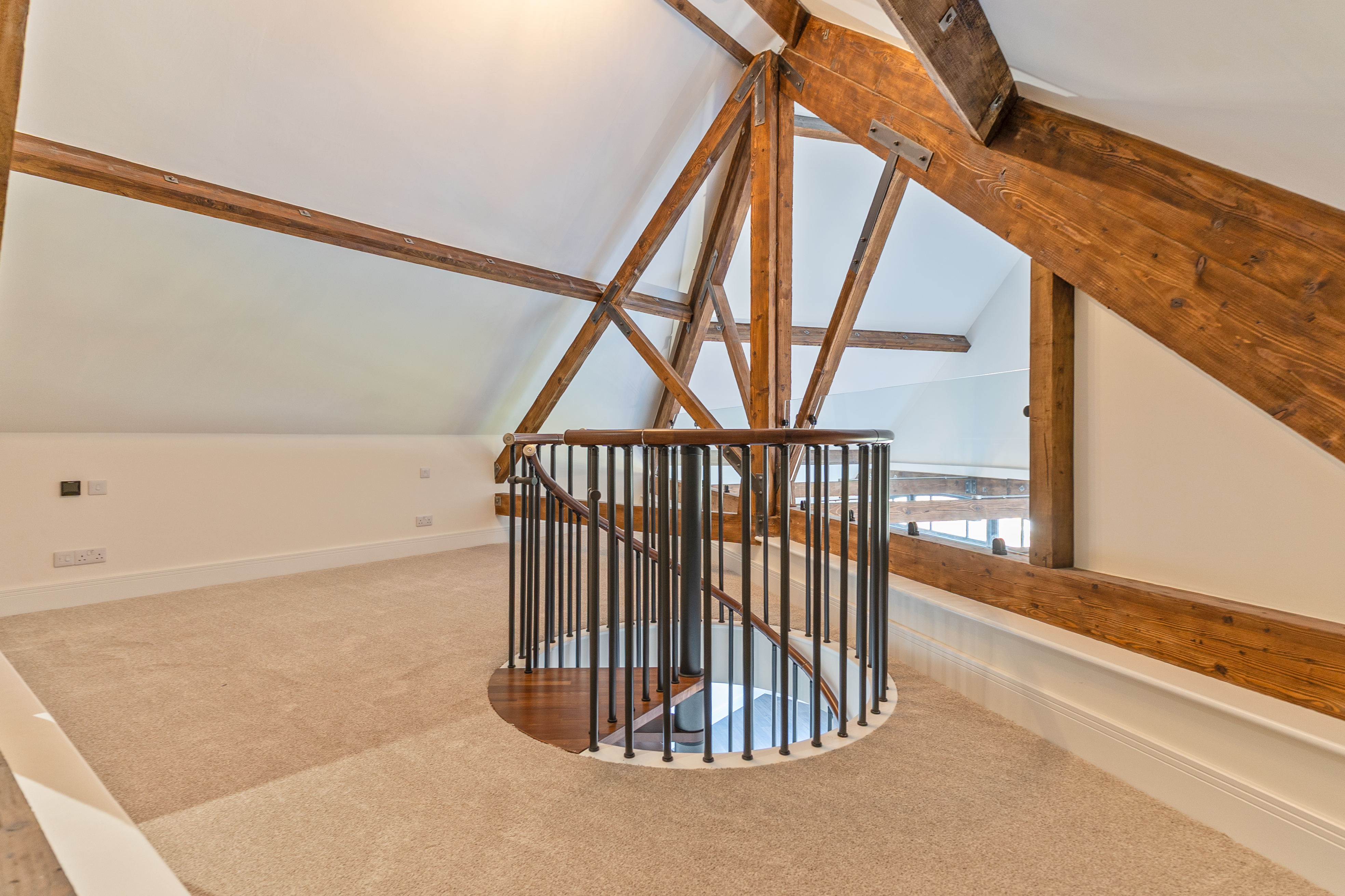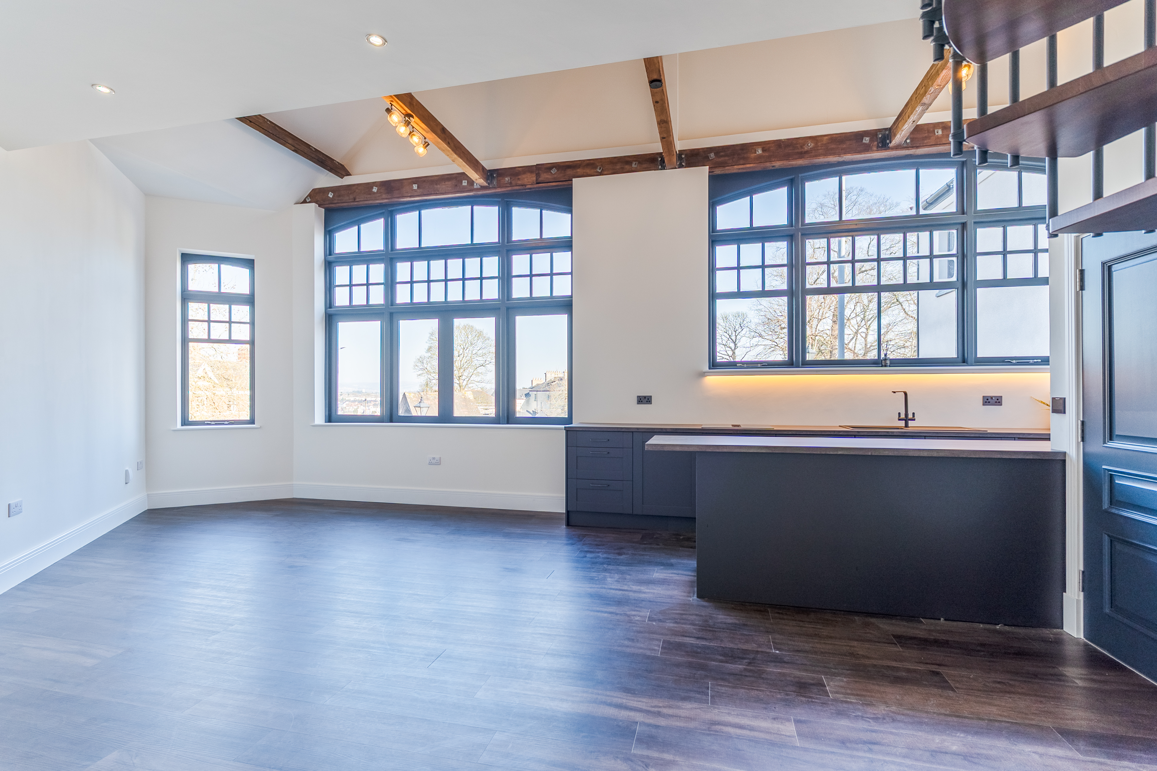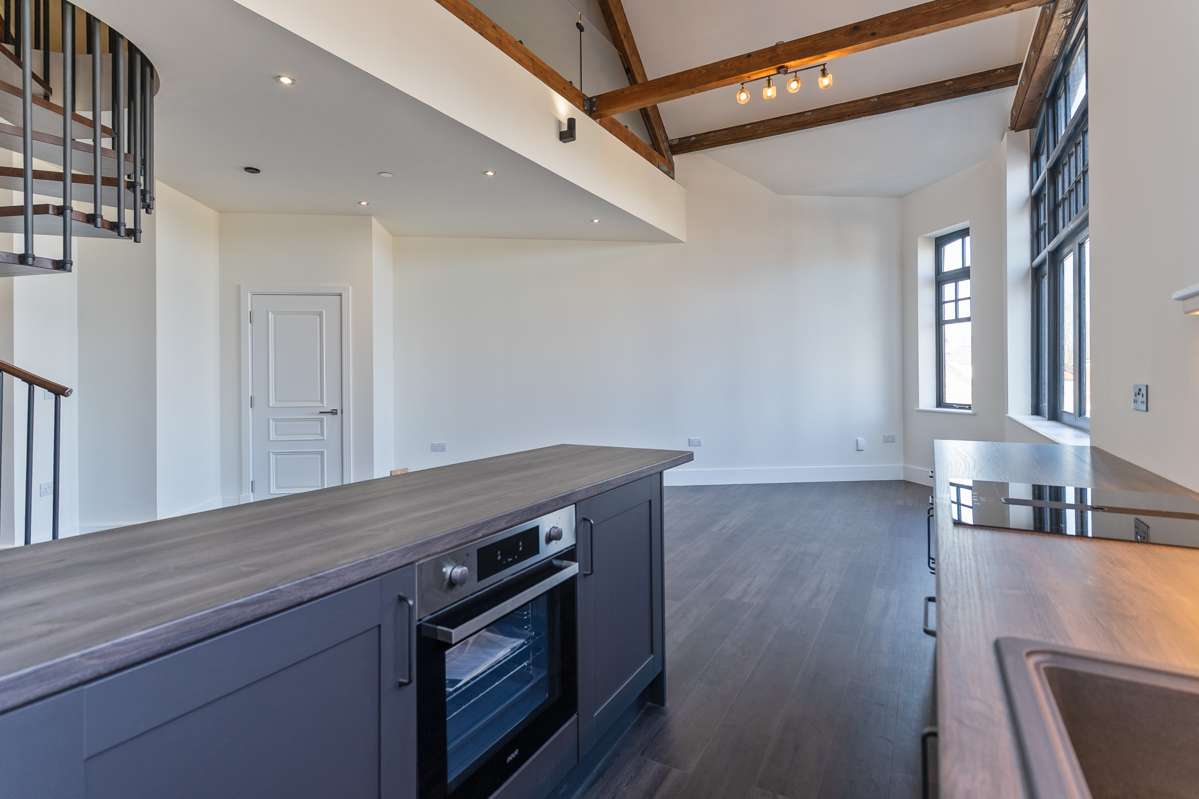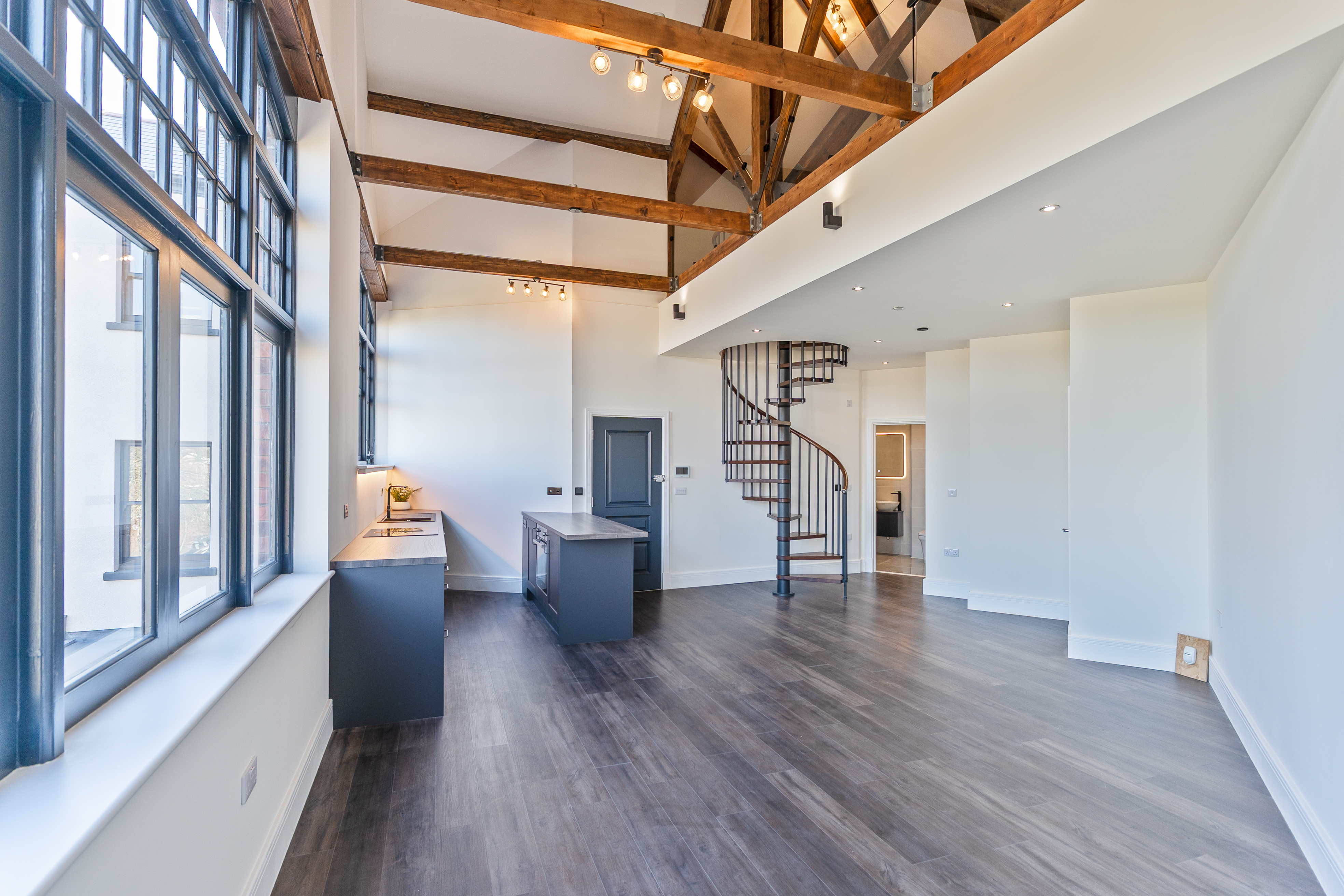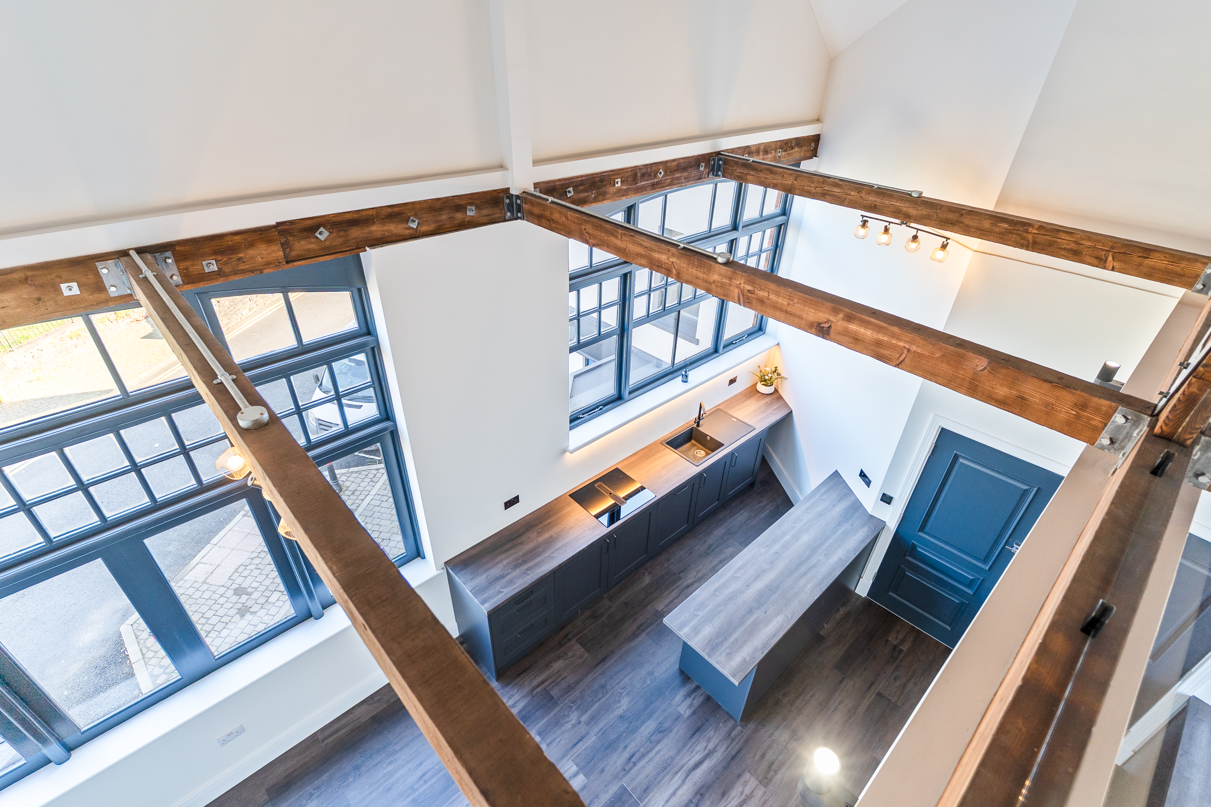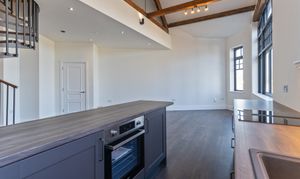 The apartment features a stunning open plan living space, designed to maximise light and space. The fully fitted kitchen includes an oven, induction hob with extractor, fridge, freezer, dishwasher and washing machine, offering a high-quality and practical setup. The living area benefits from large double-glazed windows, allowing plenty of natural light to flood in while offering attractive views overlooking the Cathedral and beyond. The space is further enhanced by vaulted ceilings with original refurbished A-frames and exposed beams, creating a striking and characterful environment. On this level there is also a double bedroom and a modern fitted bathroom, finished to a high standard.