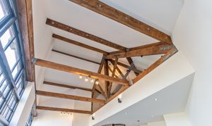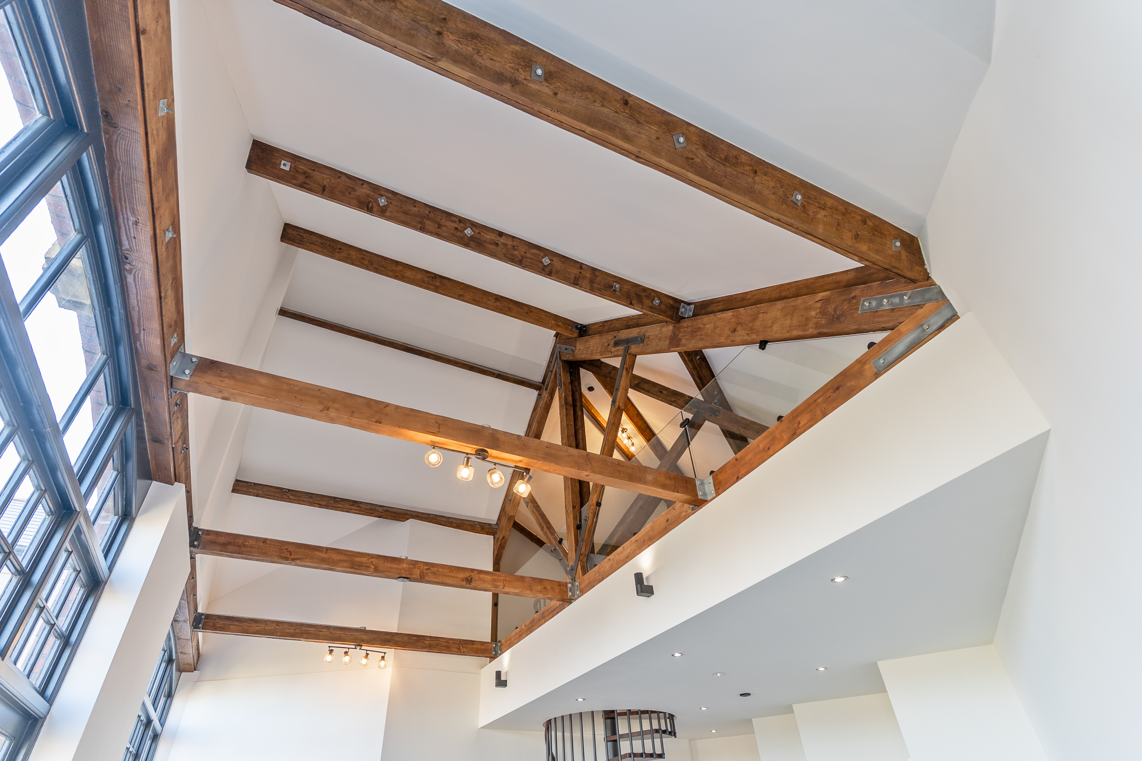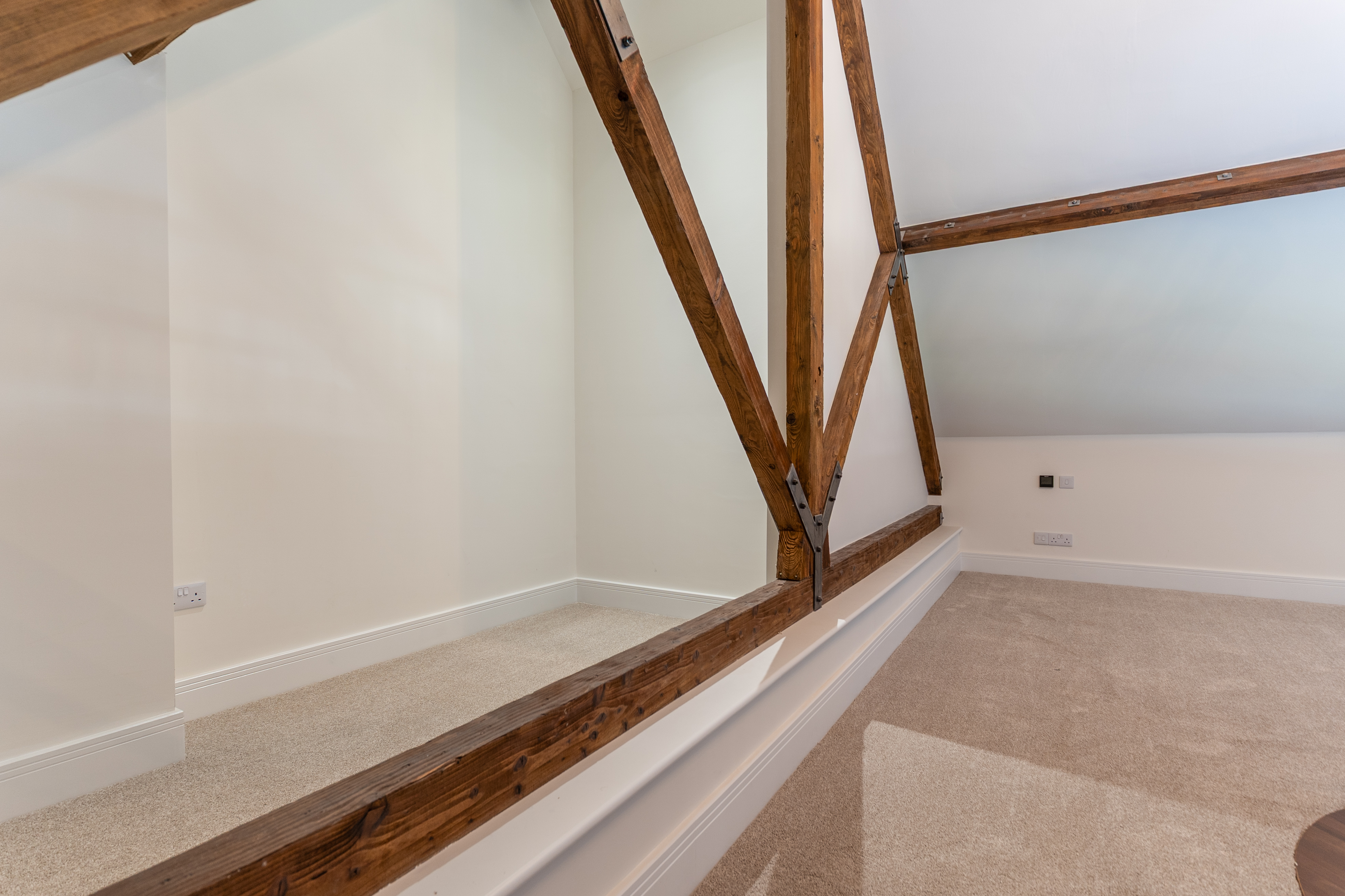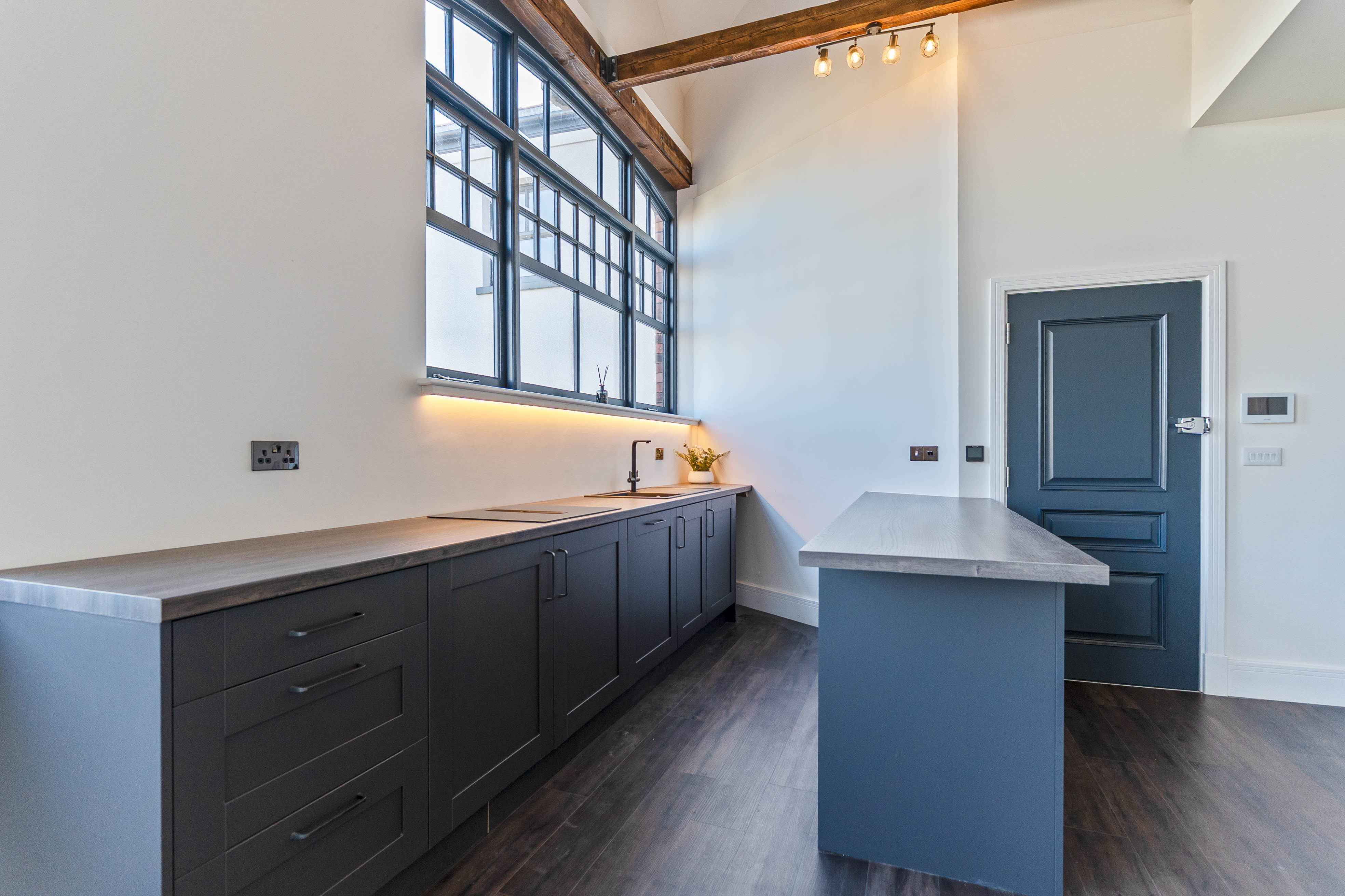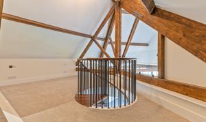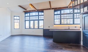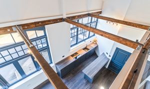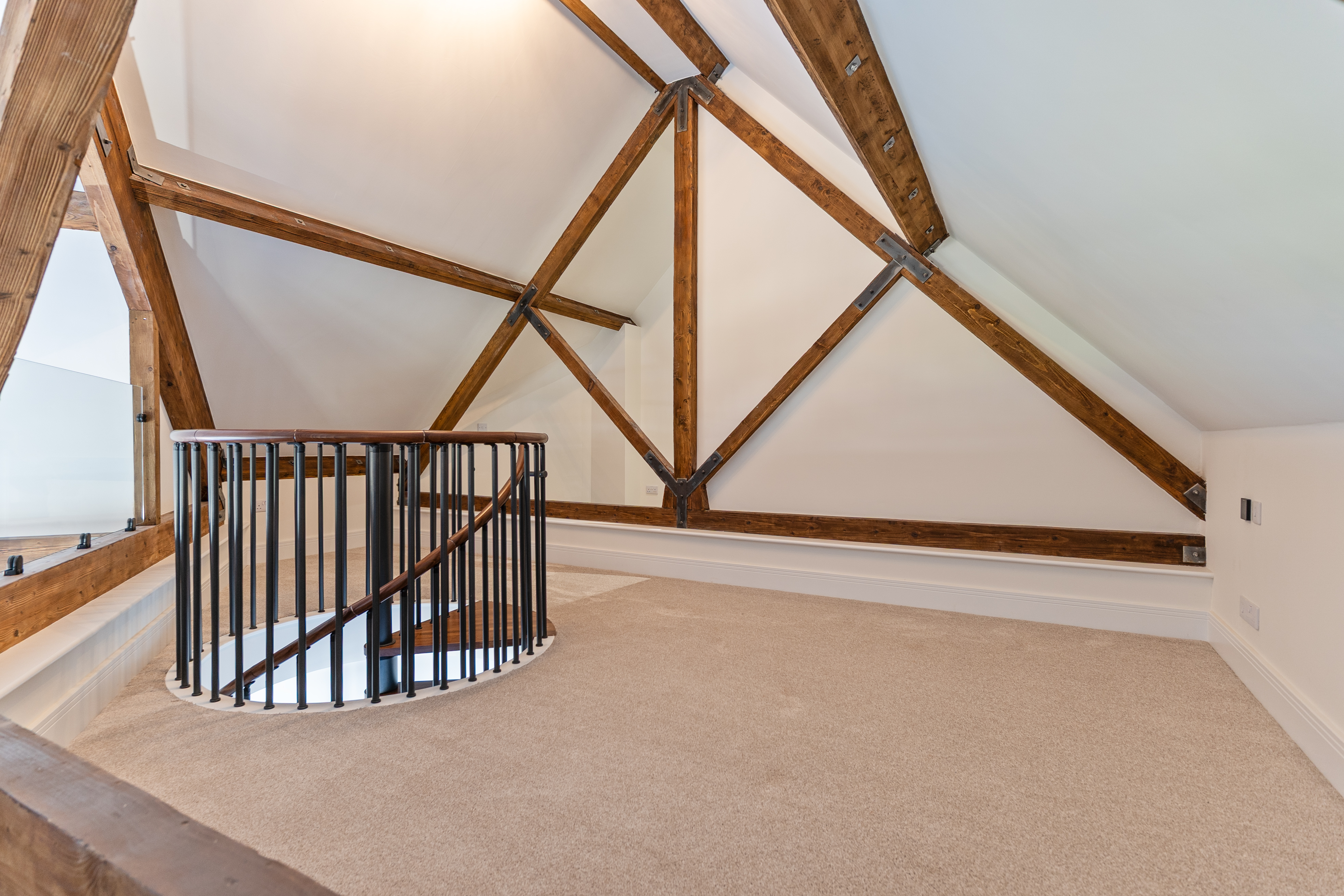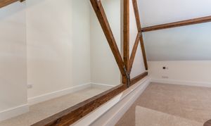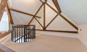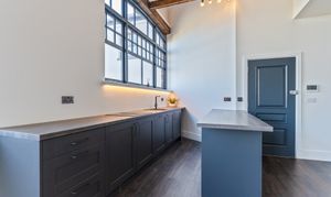 The apartment features a stunning open plan living space, designed to maximise light and space. The fully fitted kitchen includes an oven, induction hob with extractor, fridge, freezer, dishwasher and washing machine, offering a high-quality and practical setup. The living area benefits from large double-glazed windows, allowing plenty of natural light to flood in while offering attractive views overlooking the Cathedral and beyond. The space is further enhanced by vaulted ceilings with original refurbished A-frames and exposed beams, creating a striking and characterful environment. On this level there is also a double bedroom and a modern fitted bathroom, finished to a high standard.