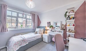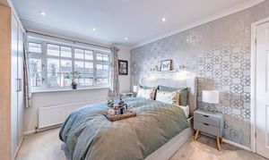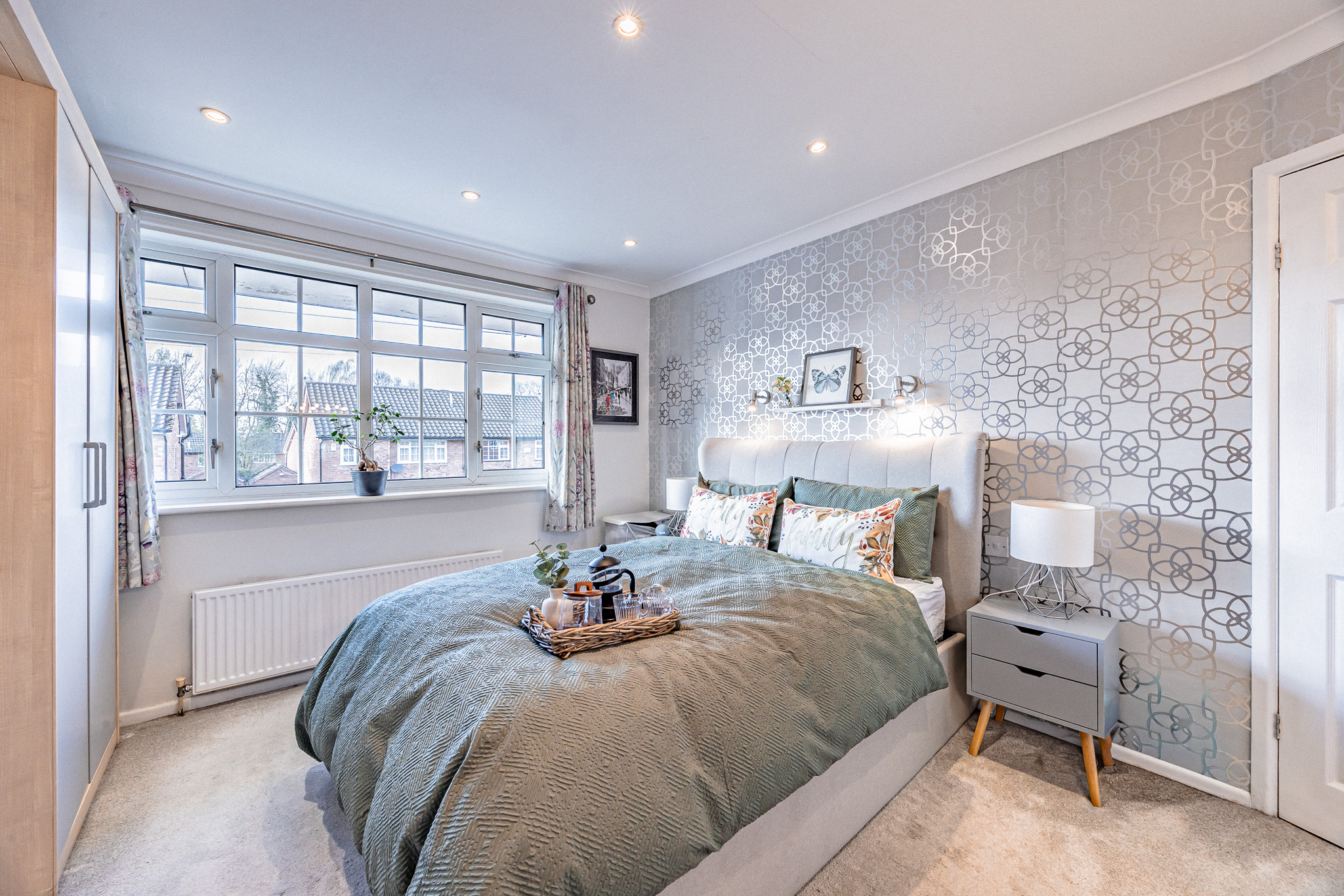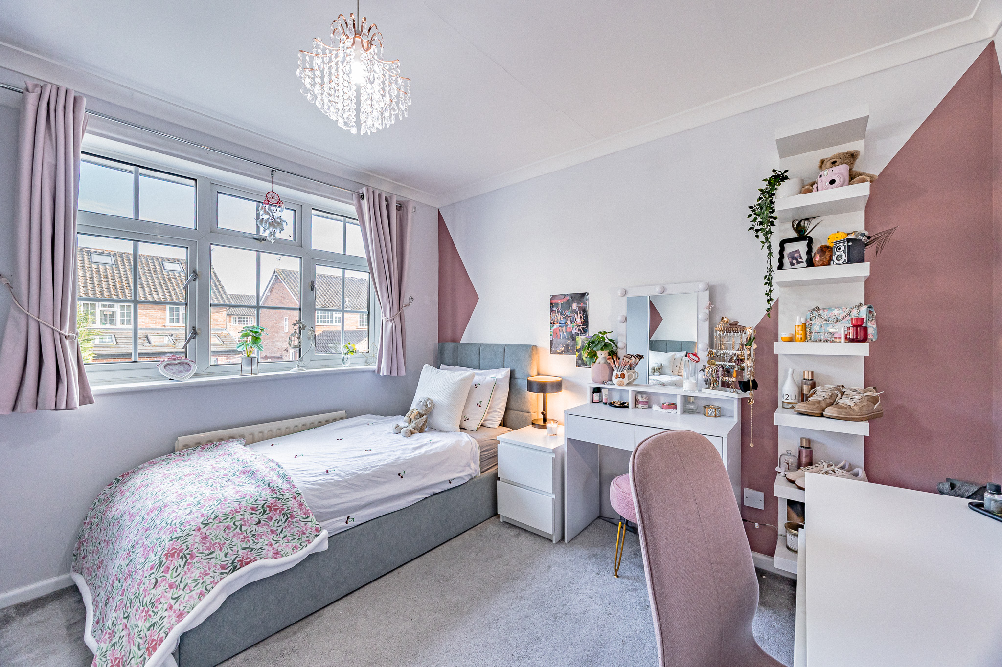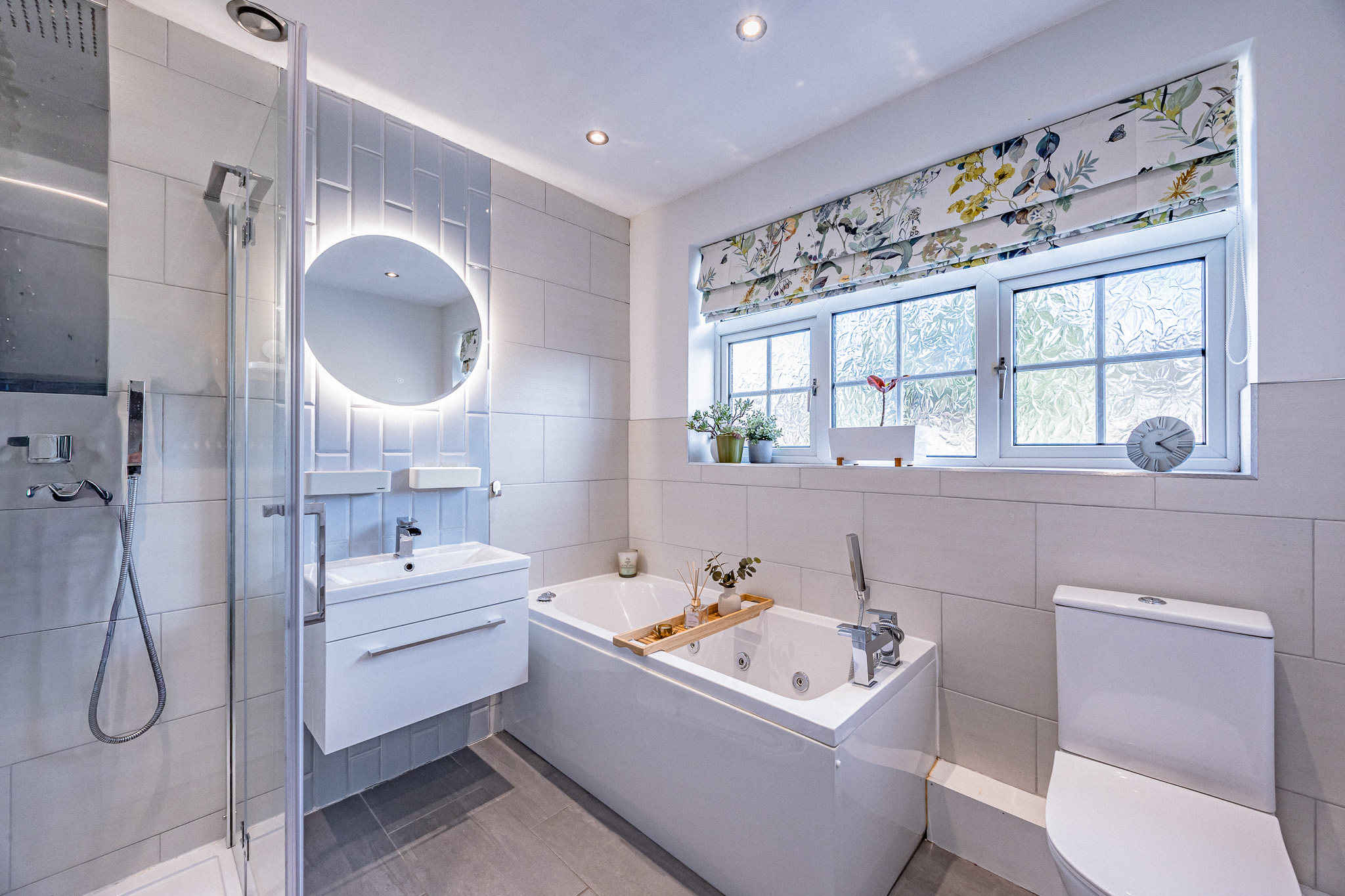 Upstairs, three further bedrooms provide comfortable accommodation. The principal bedroom to the front features built-in drawers, space for a TV, and ceiling spotlights, while the second bedroom is a generous double with fitted wardrobes. The third bedroom, currently used as an office, includes built-in storage and a window overlooking the front. The family bathroom is well-appointed with a jacuzzi bath, walk-in corner rain head shower with additional body jets, under sink storage, and fitted touch mirrors with integrated lighting. A boarded loft with ladder and insulation offers valuable additional storage.