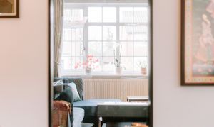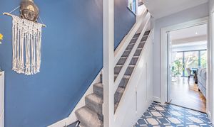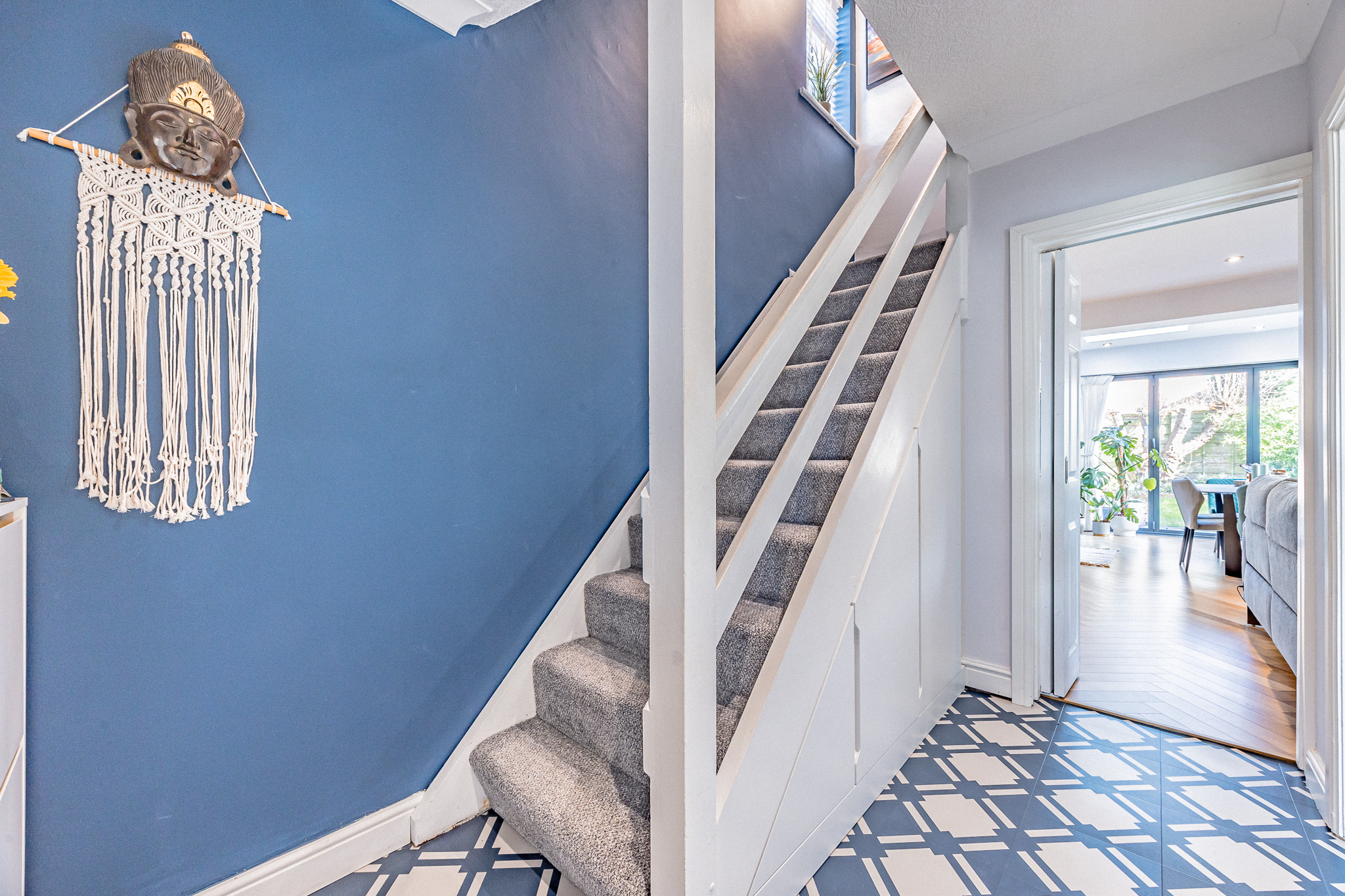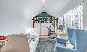Inside, a modern glass front door opens into a bright hallway featuring built-in coat storage, vinyl-tiled flooring with protective matting, and a radiator cover. The space flows seamlessly into the open-plan living and dining area, where full-length internal windows and a picture-frame window in between the kitchen sitting area and main living room allows natural light to stream from front to back. Wood veneer flooring continues throughout, adding warmth and a sense of cohesion, and extends into a versatile downstairs bedroom or reception room, currently used as a guest room and office, which enjoys fitted storage and views of the south-facing garden.