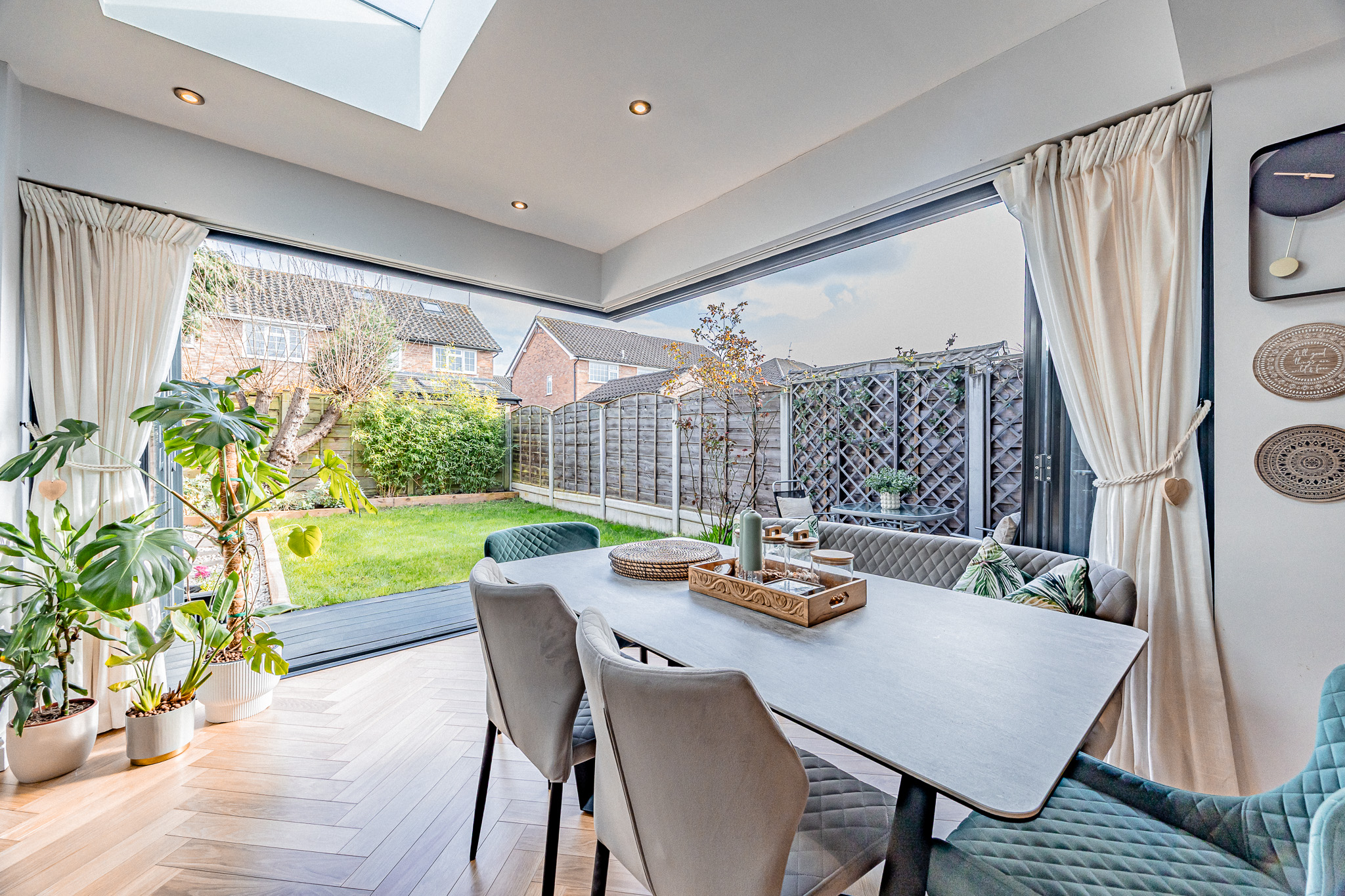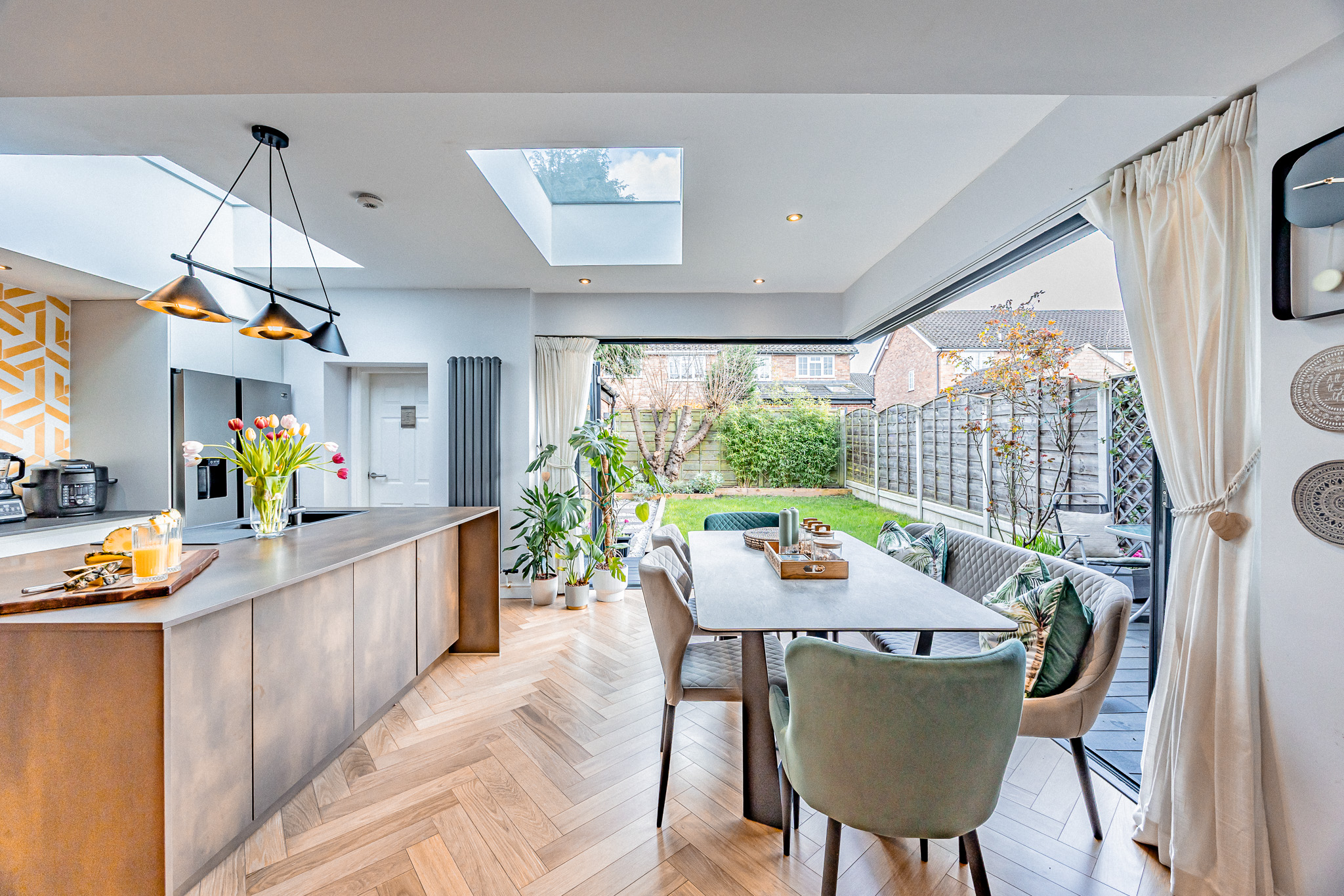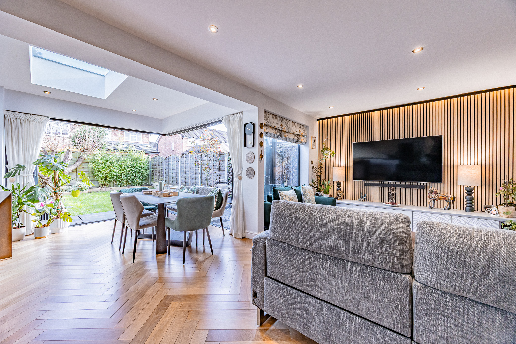 - Modern open-plan living and dining area with full-length fully opening corner bifold doors from the living and kitchen create a seamless flow for inside/outside living