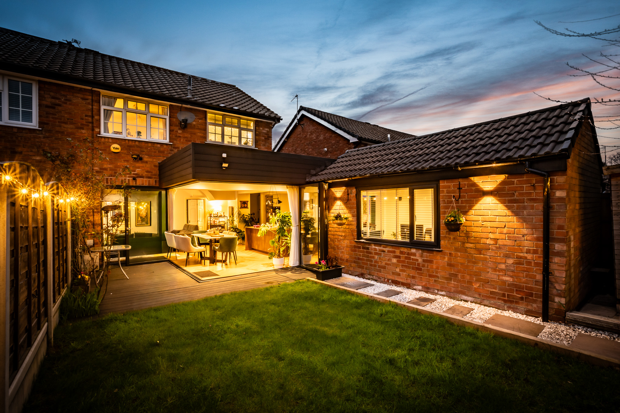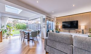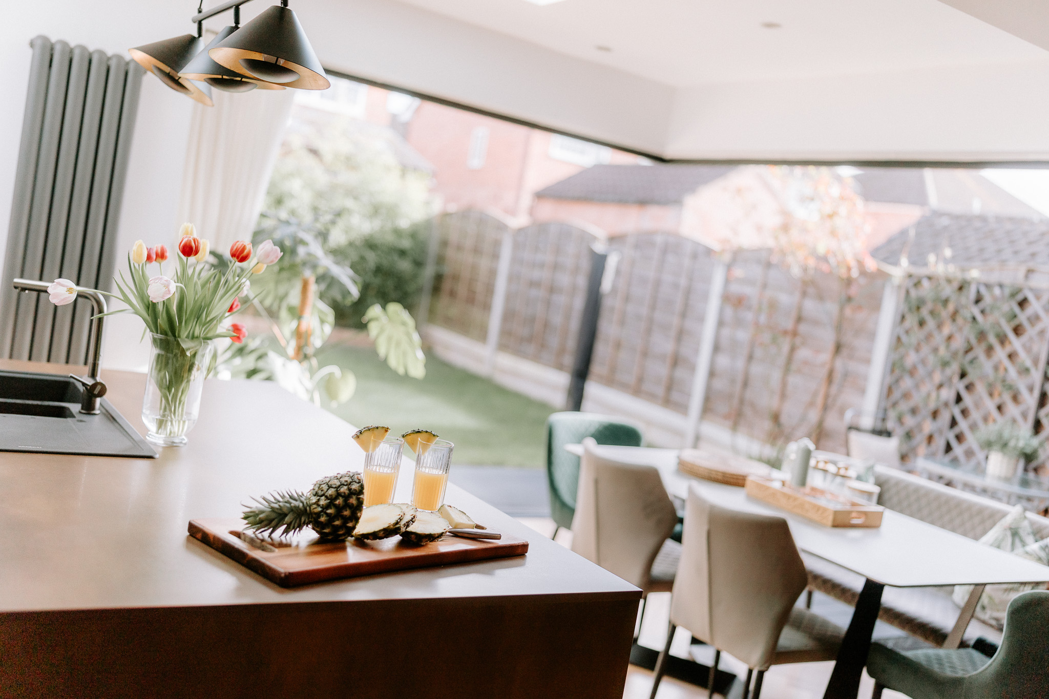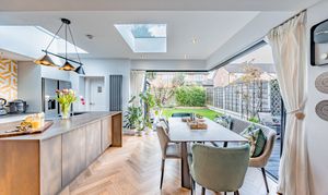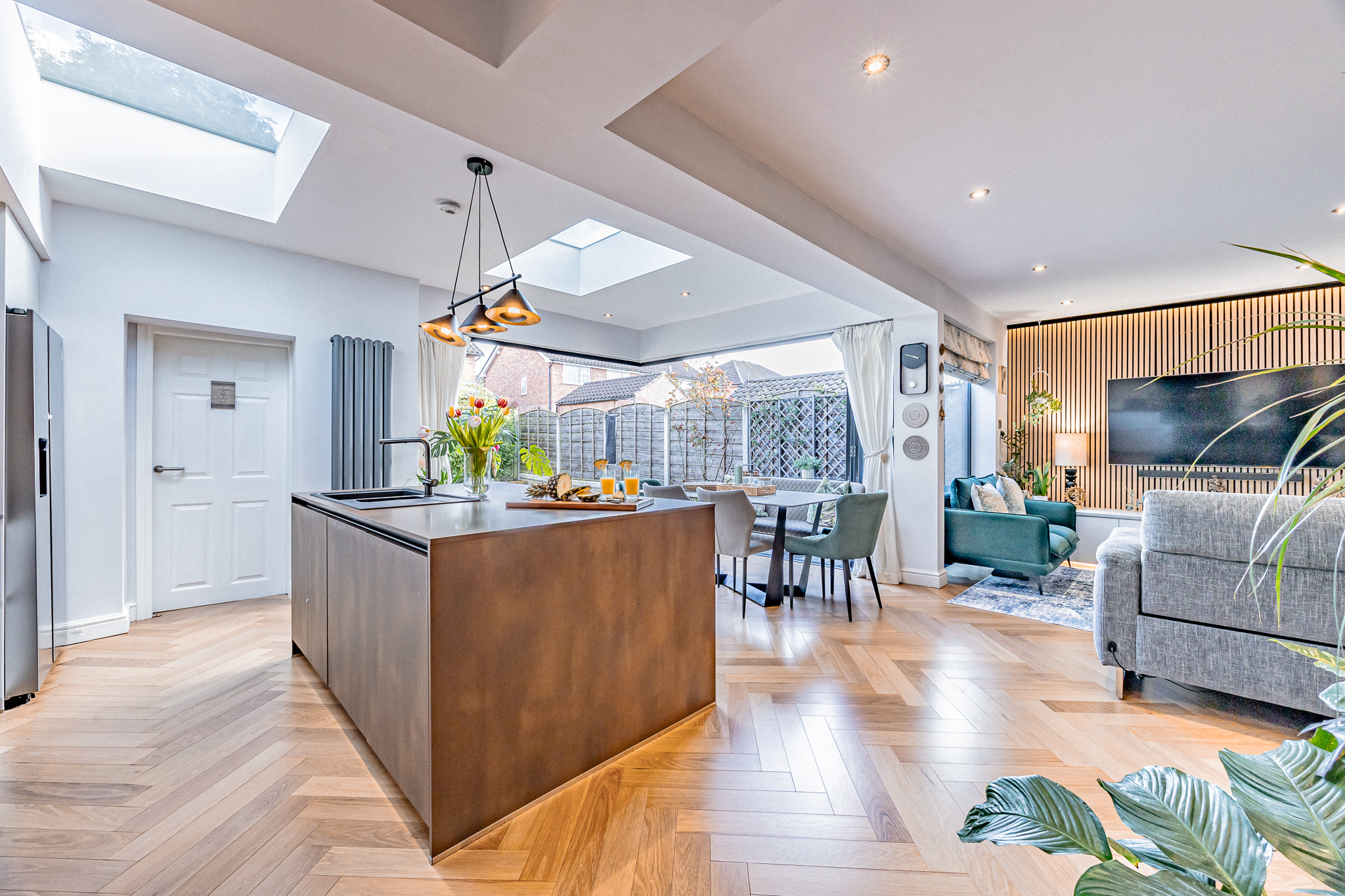 - Modern open-plan living and dining area with full-length fully opening corner bifold doors from the living and kitchen create a seamless flow for inside/outside living