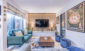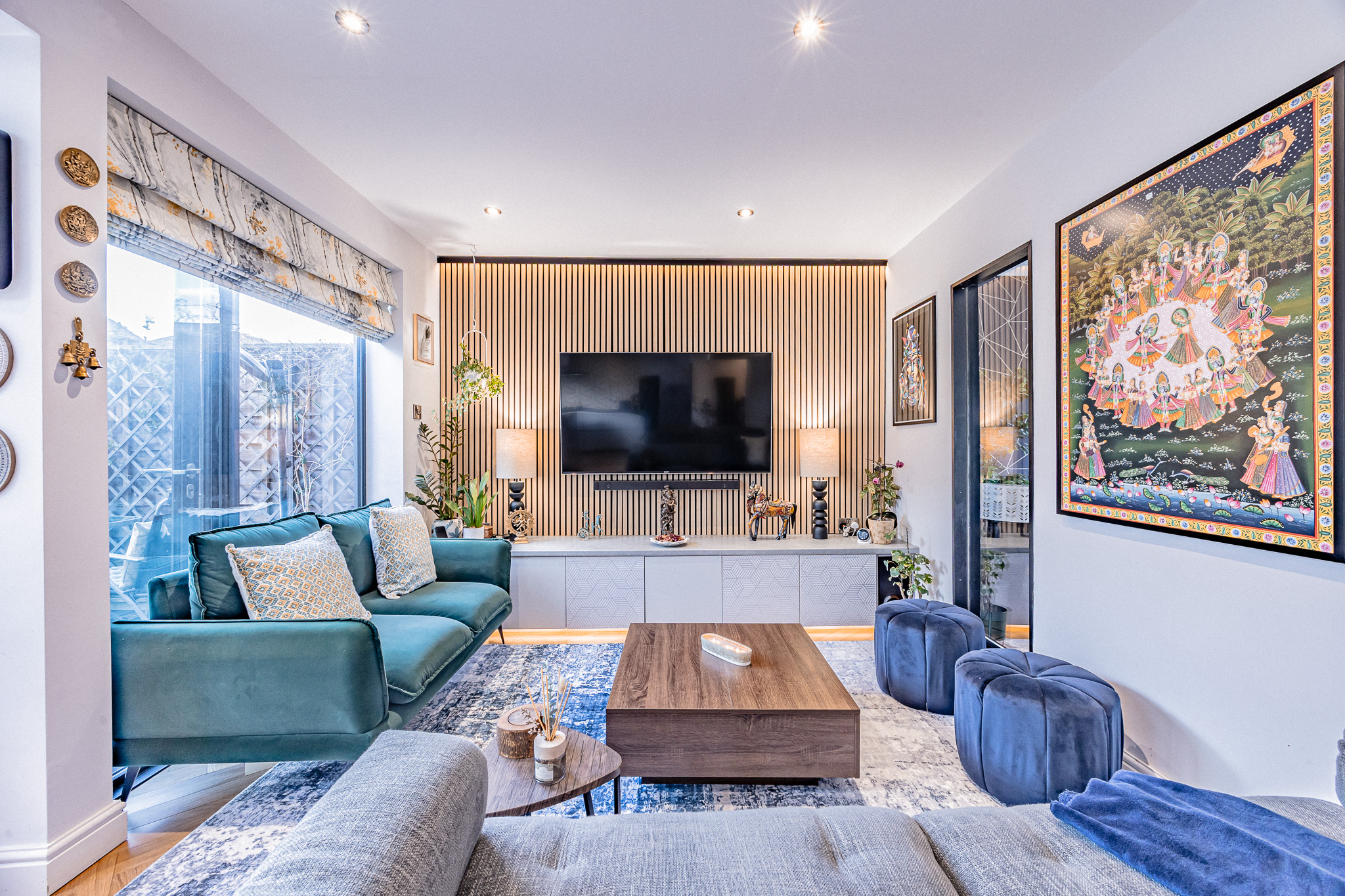 The living area is designed for comfort and style, with wood-panelled walls behind the TV, under-cabinet lighting, acoustic cushioning, and sophisticated ceiling lighting. Thoughtful touches, including built-in understairs storage with a motion-sensor light, enhance functionality while maintaining a clean and contemporary aesthetic.