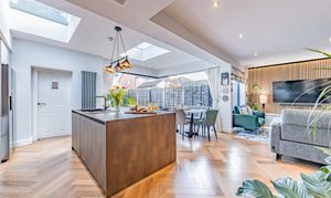 Open-plan kitchen lounge: We love how the open-plan layout creates a sociable heart to the home, with the stylish kitchen island seamlessly connecting cooking, dining, and relaxing spaces, perfect for everyday family life and entertaining.