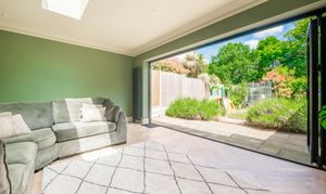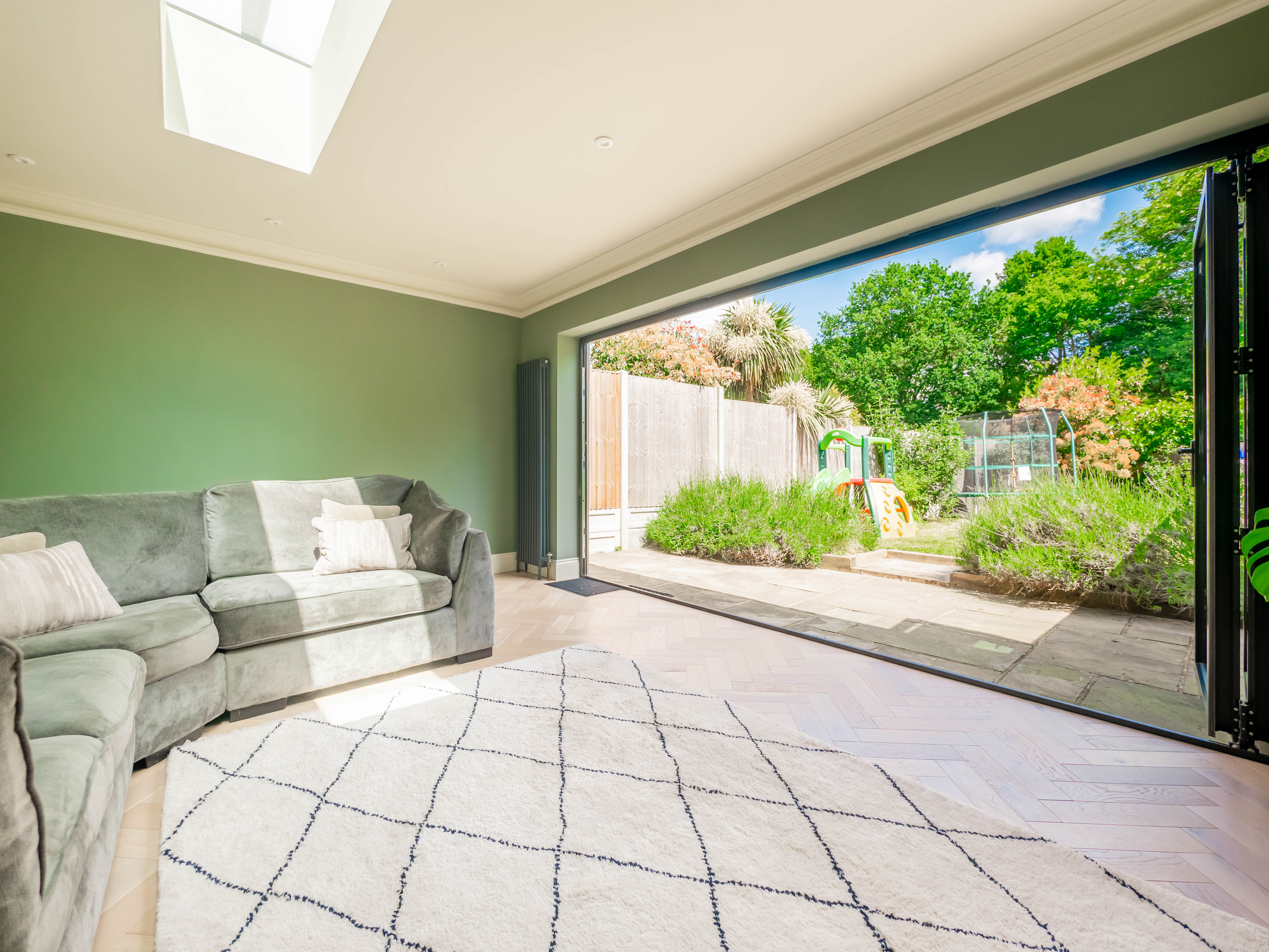 The property features three double bedrooms, including a luxurious main bedroom with a private en-suite and walk-in wardrobe, creating a perfect sanctuary to unwind. The open-plan kitchen/dining/living area serves as the heart of the home—ideal for family life or entertaining guests—while a spacious additional living area with skylight, bi-fold doors, and built-in storage enhances the sense of light and space throughout.
