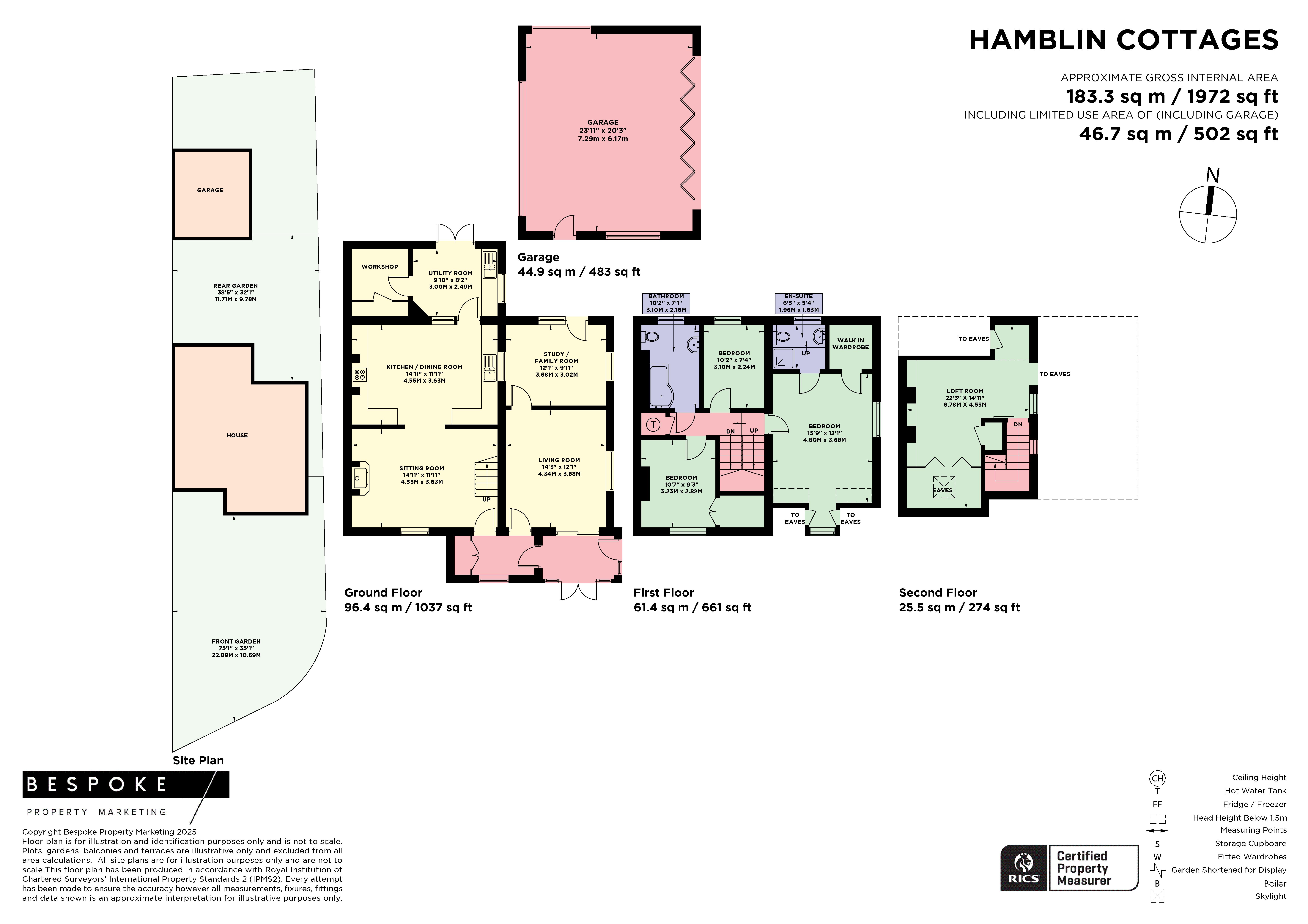 Rear Garden: lawn, patio, pergola, sheds and stores, gated front and rear.