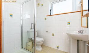 En-suite Shower Room: White suite, low level WC, pedestal wash hand basin, shower cubicle with ‘Triton’ electric shower, tiled walls and floor, electric towel rail, uPVC double glazed window.