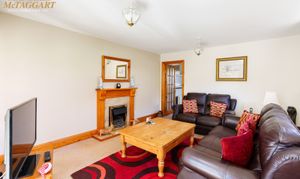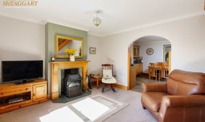 Double Aspect Living Room: fitted carpet, night storage heater, ornamental fire surround with electric fire, double glazed window to side, panel glazed door to:-