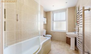 Bathroom: White suite, ‘P’ shaped shower bath, low level WC, pedestal wash hand basin, electric towel rail, tiled floor and walls,, uPVC double glazed window.