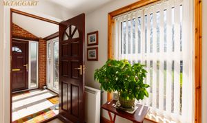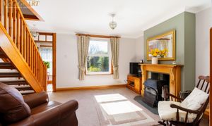 Inner Hall: Tiled floor, night storage heater, uPVC double glazed window to front, mirror fronted built in coat cupboard, panelled glazed doors to living room and sitting room.