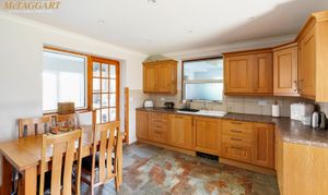 Double Aspect Utility Room: cream coloured shaker style wall and base units, stainless steel sink unit, granite effect worktops, spaces for washing machine and tumble dryer, tiled floor and splashbacks, night storage heater, uPVC double glazing window to side, uPVC double glazed double doors to rear garden. Door to:-