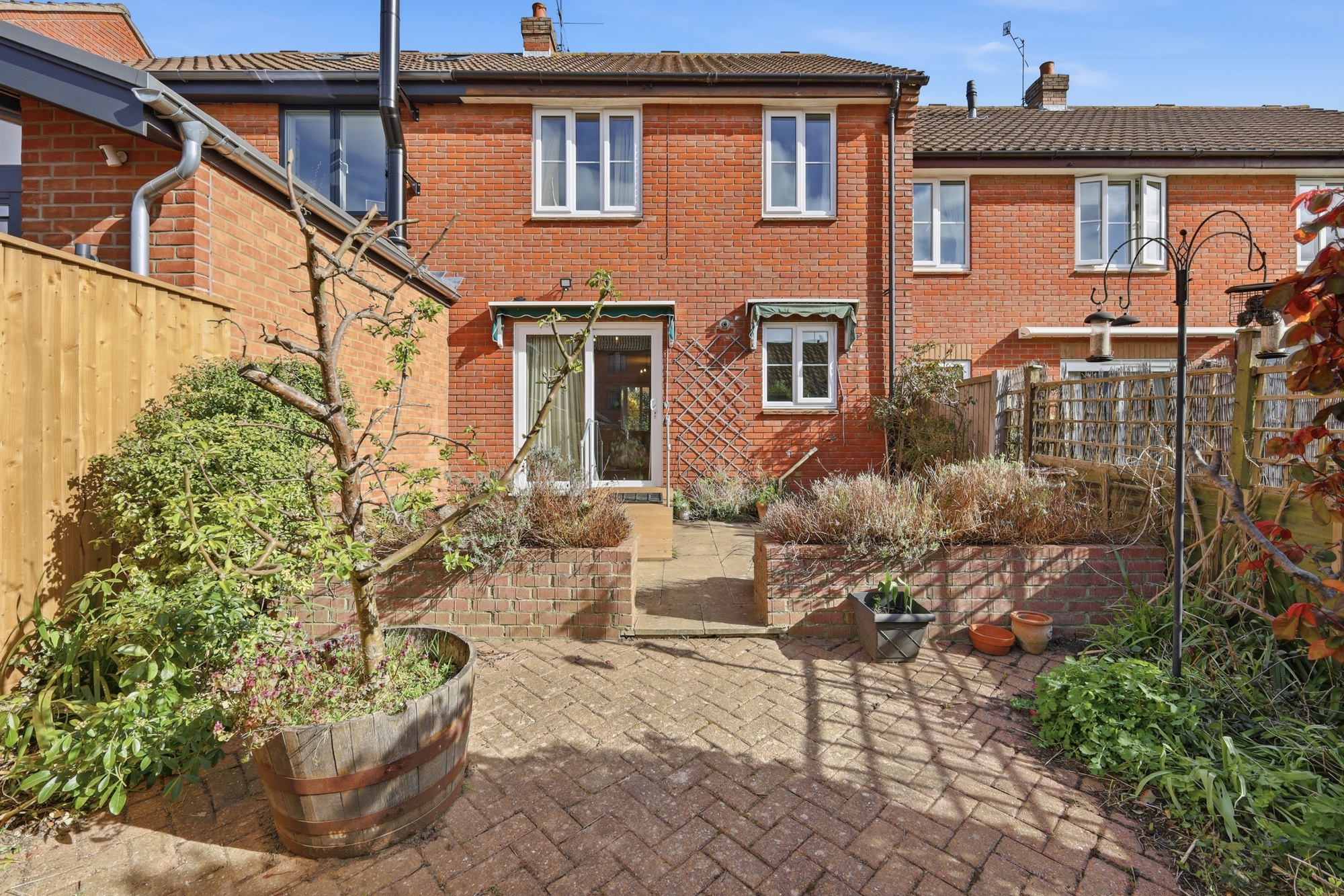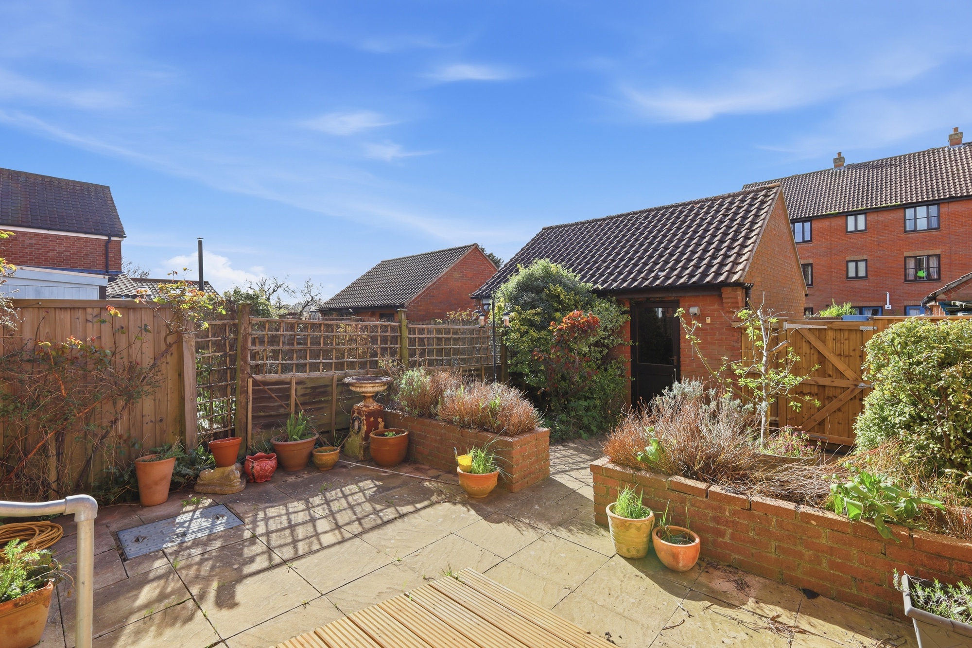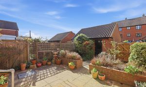 A courtyard style garden, private and south facing. Rear access to the garage and the garden.