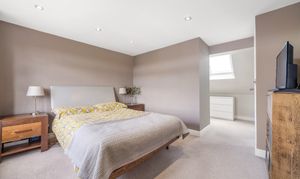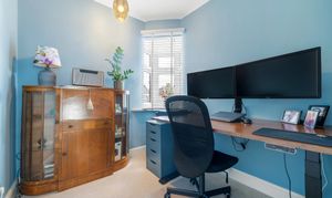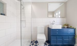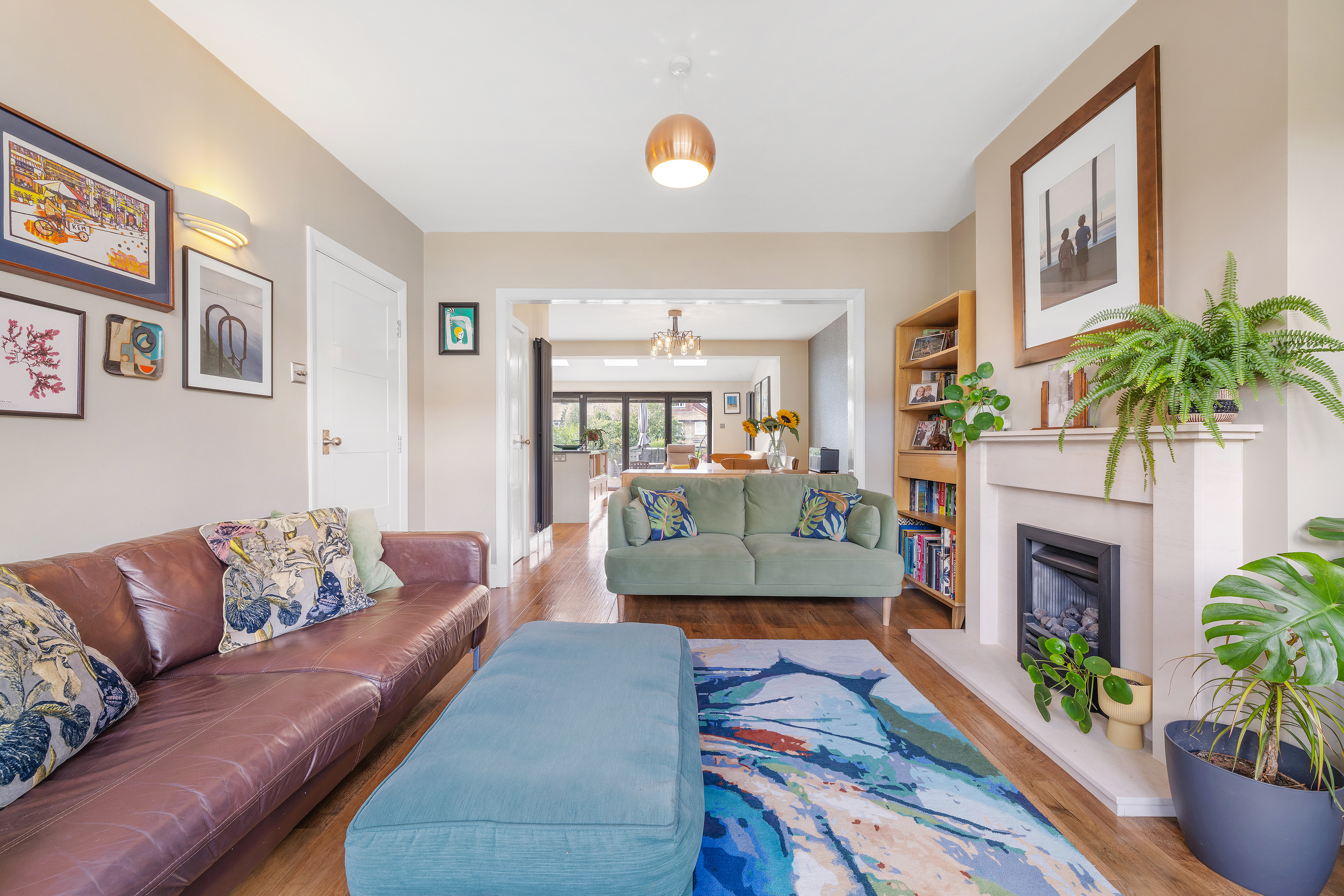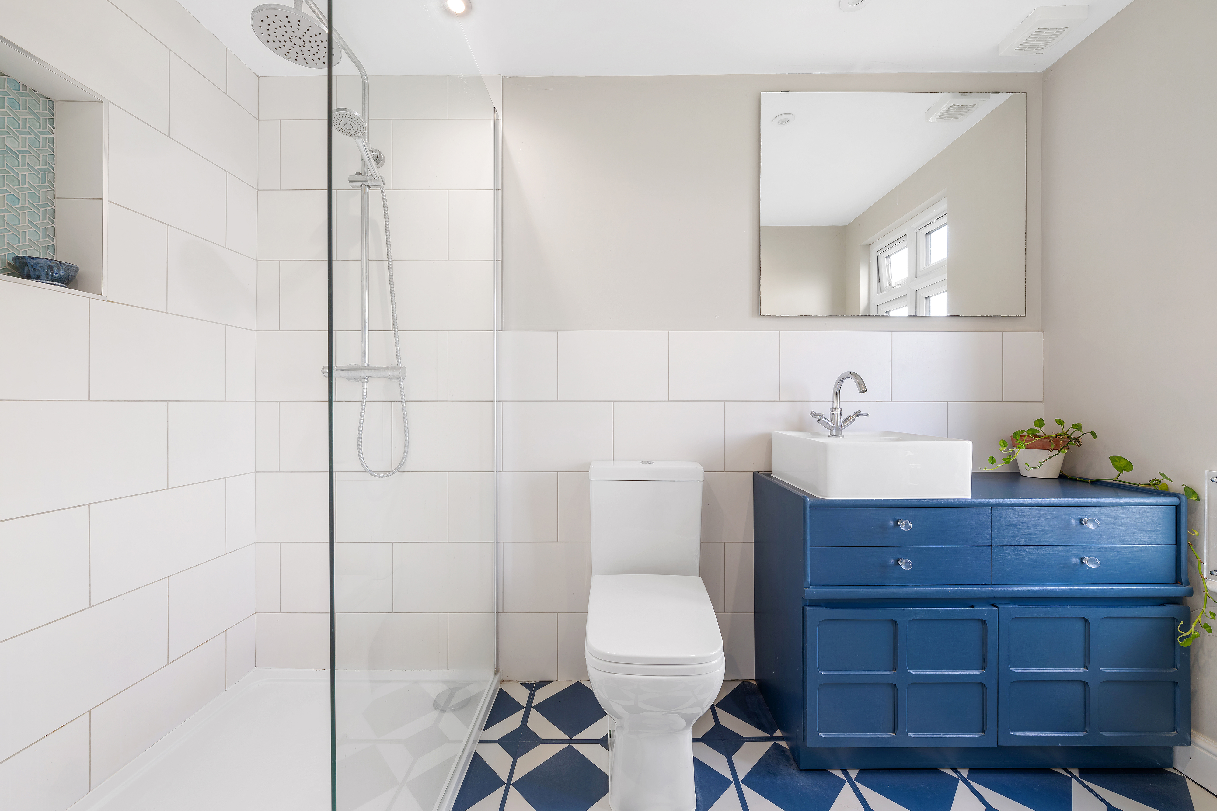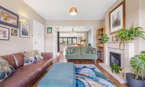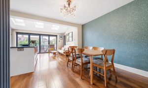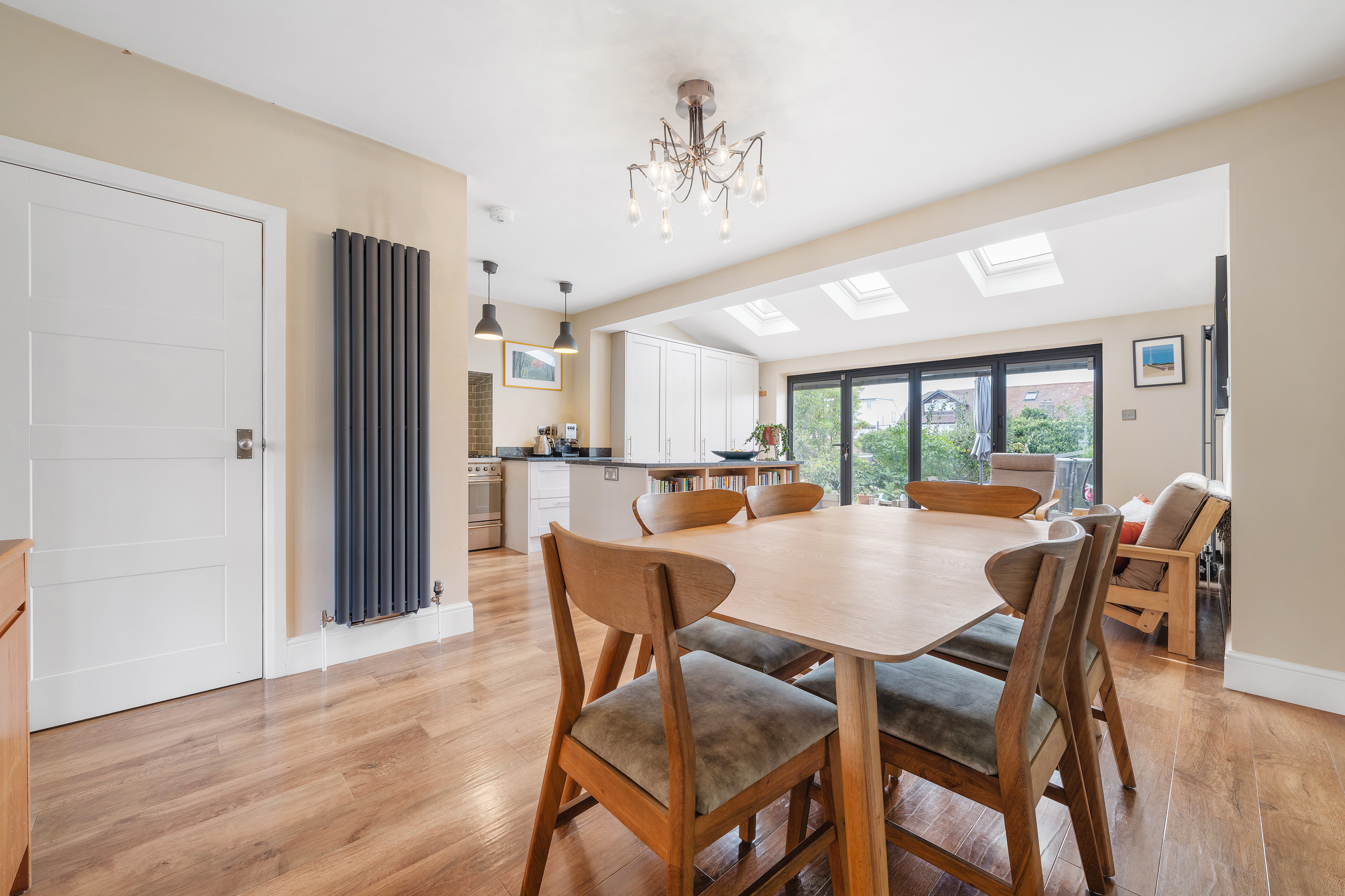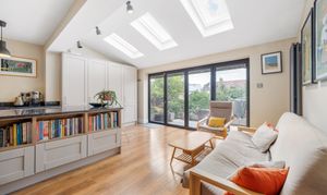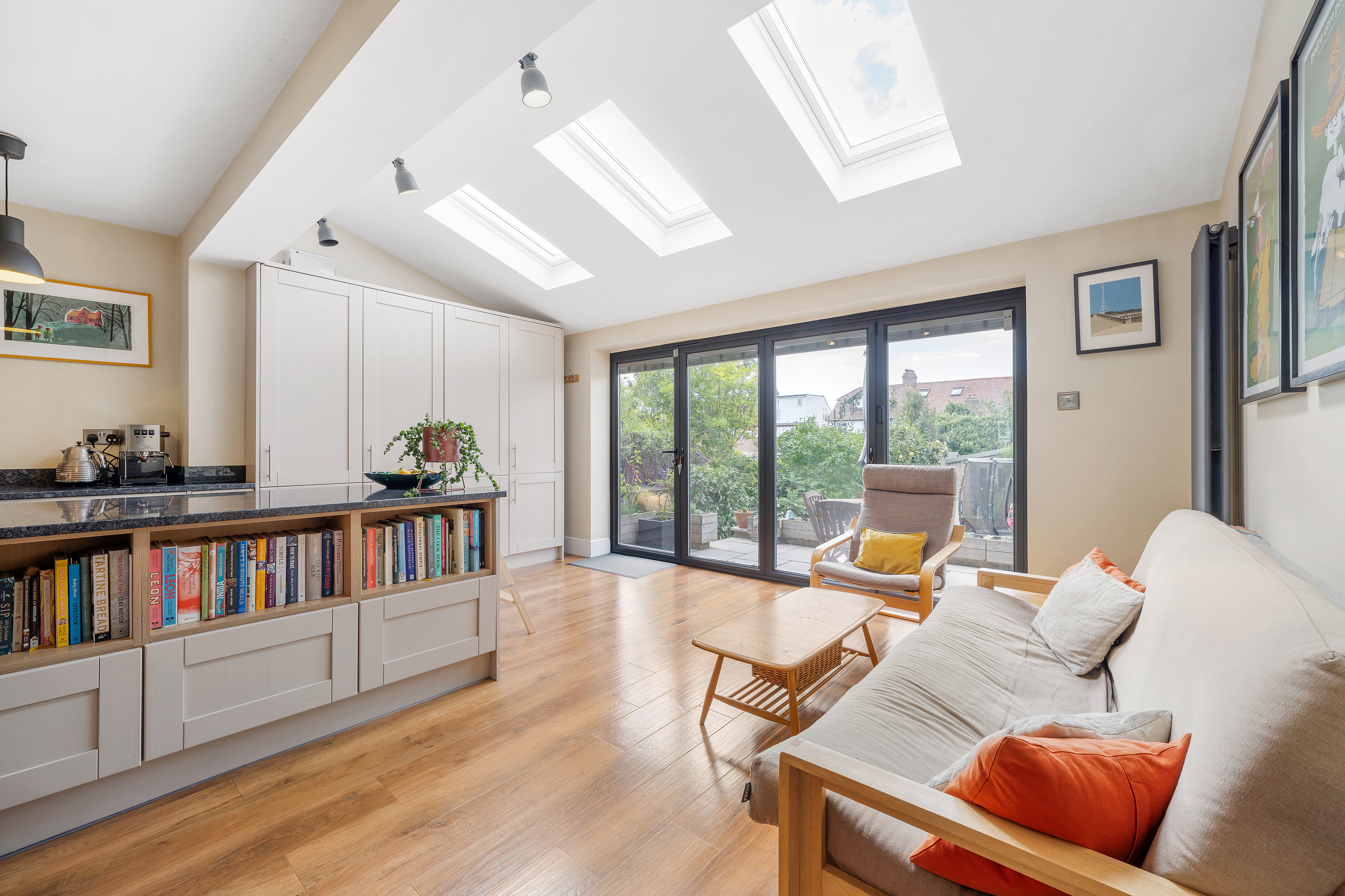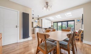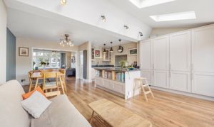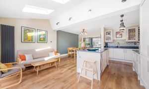 Stepping inside, via an enclosed porch, you are greeted by the characterful ambience of a 1930's end of terrace house, blending traditional charm with modern comforts. The open plan kitchen/diner is a focal point of the home with generous central island, perfect for entertaining guests. Natural light floods through the skylights creating a bright and welcoming atmosphere with bi-folding doors to the garden.