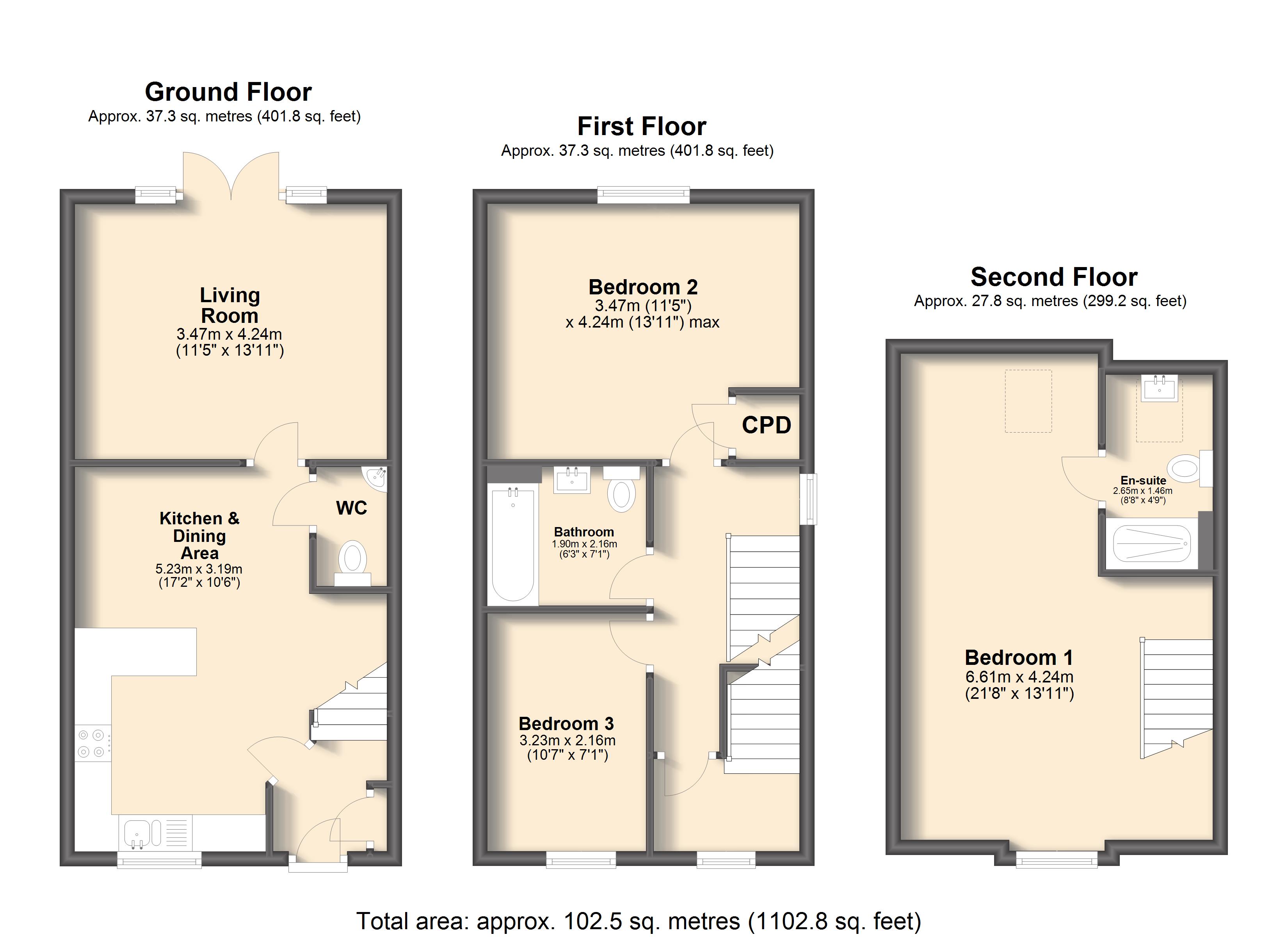 The second floor is dedicated to the principal bedroom, creating a generous and private space, complemented by a contemporary en-suite shower room.