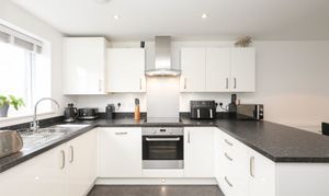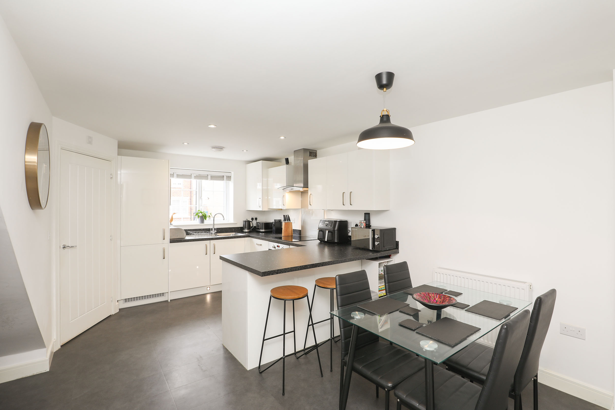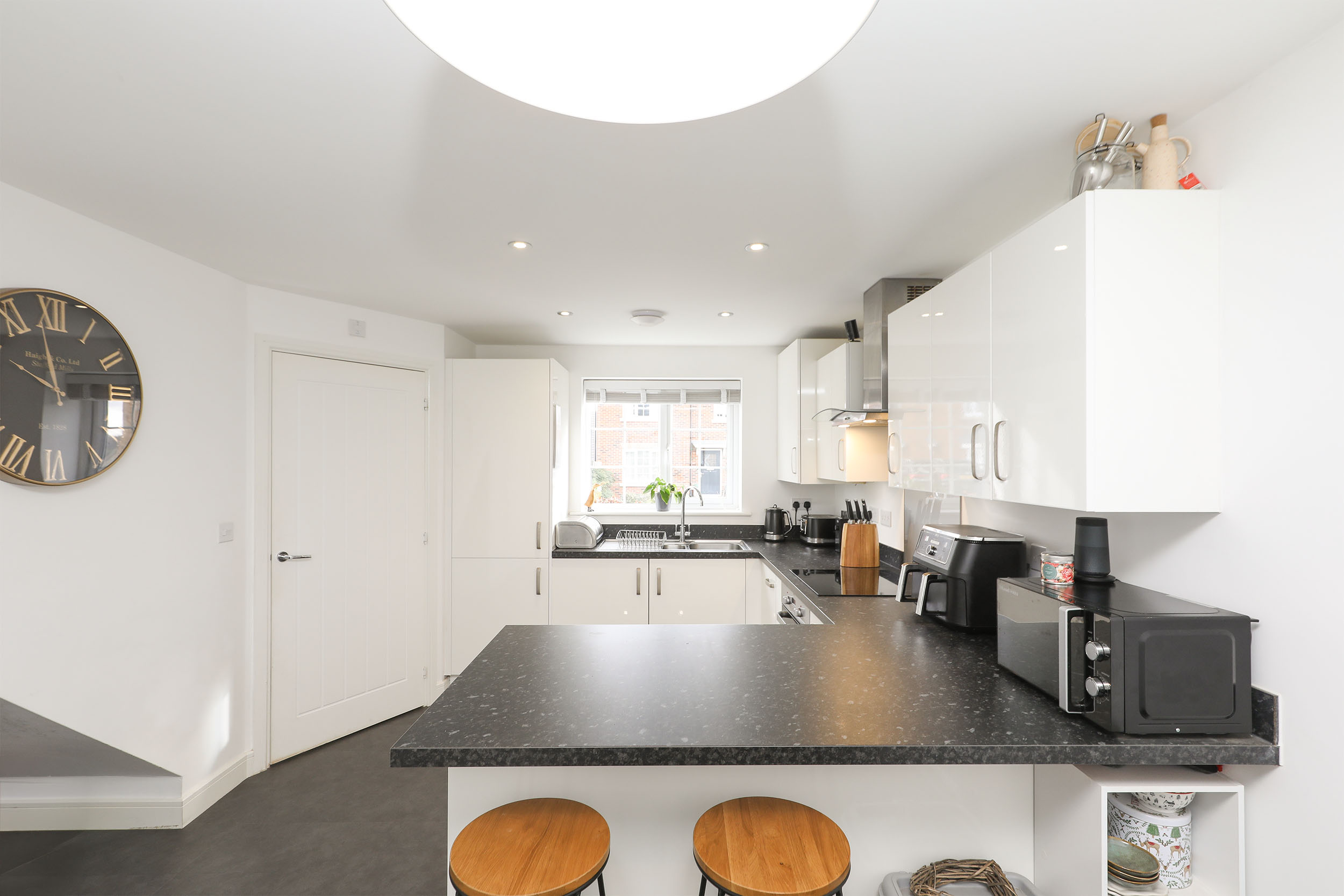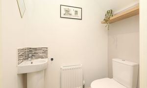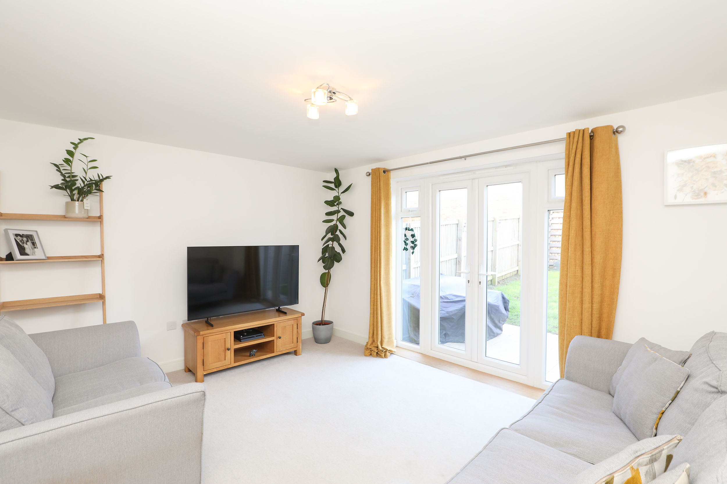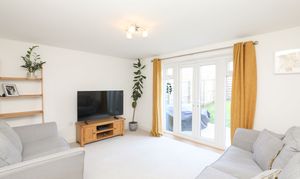 The ground floor centres around a spacious open-plan kitchen and dining area, designed with family life in mind. The kitchen is fitted with a range of integrated appliances, with a breakfast bar for busier mornings or casual dining. To the rear, the living room is bright and spacious, with double doors opening directly onto the garden, creating a fabulous connection between indoor and outdoor living. There is also a ground-floor W.C. for day-to-day convenience.