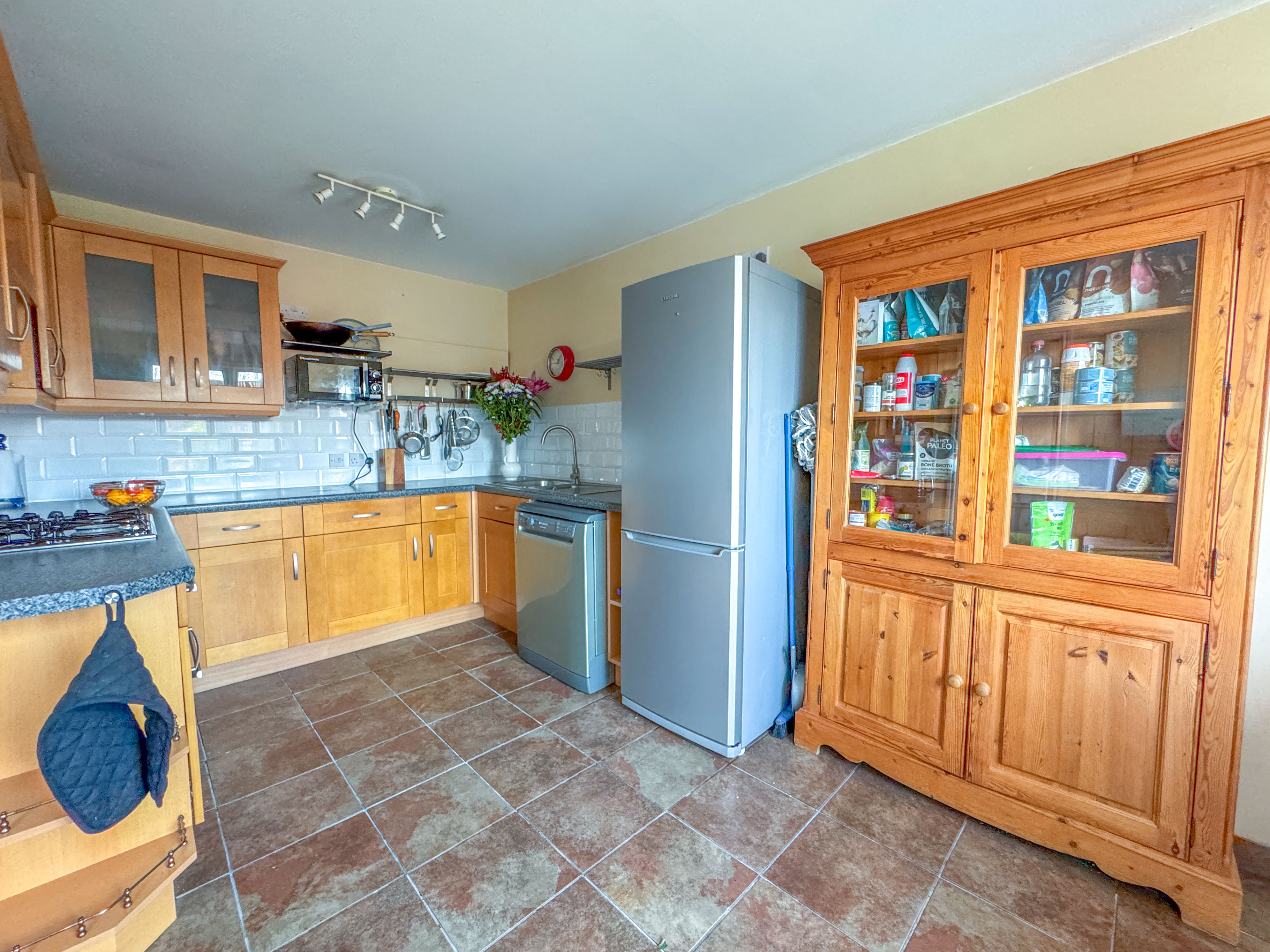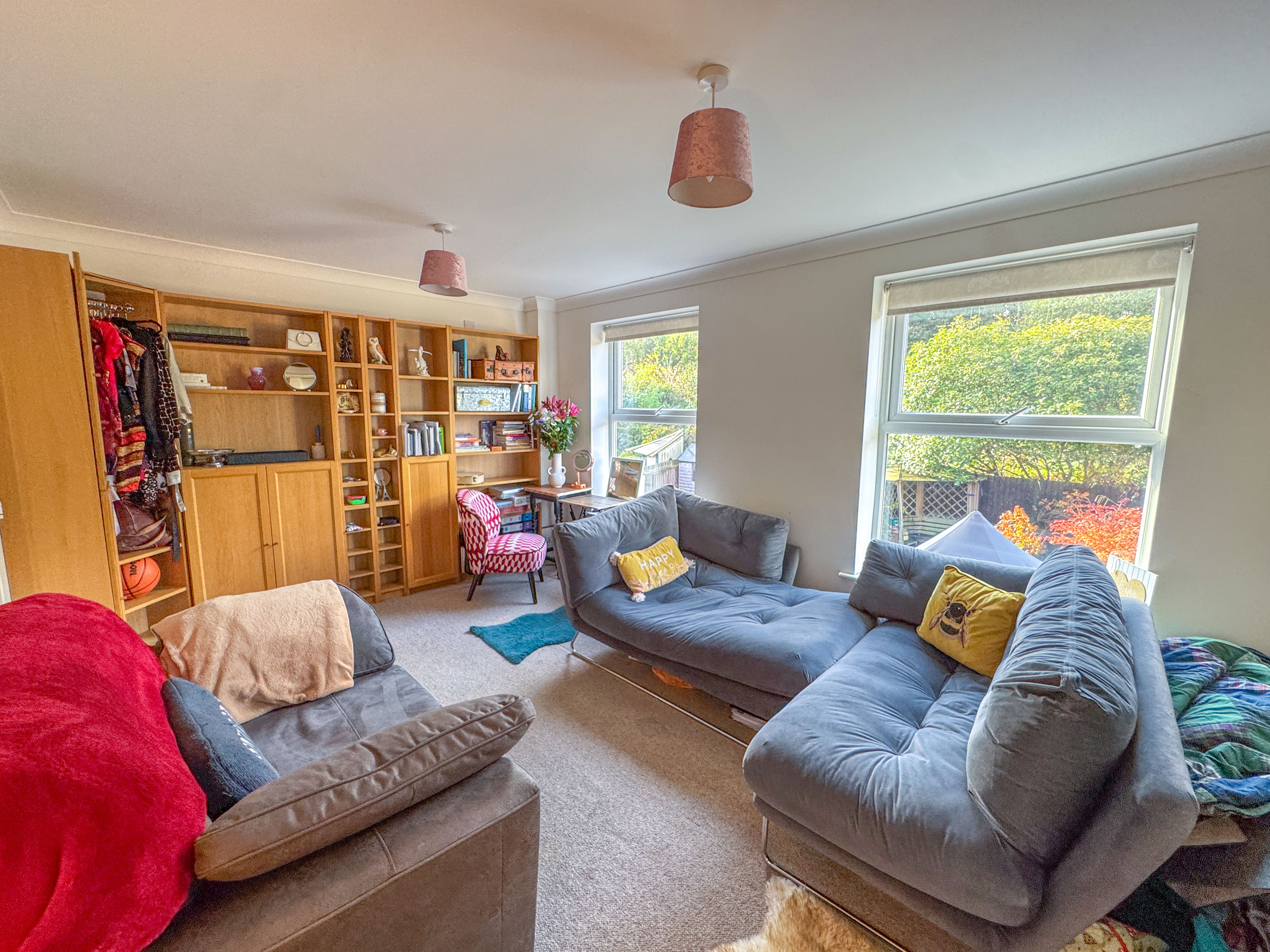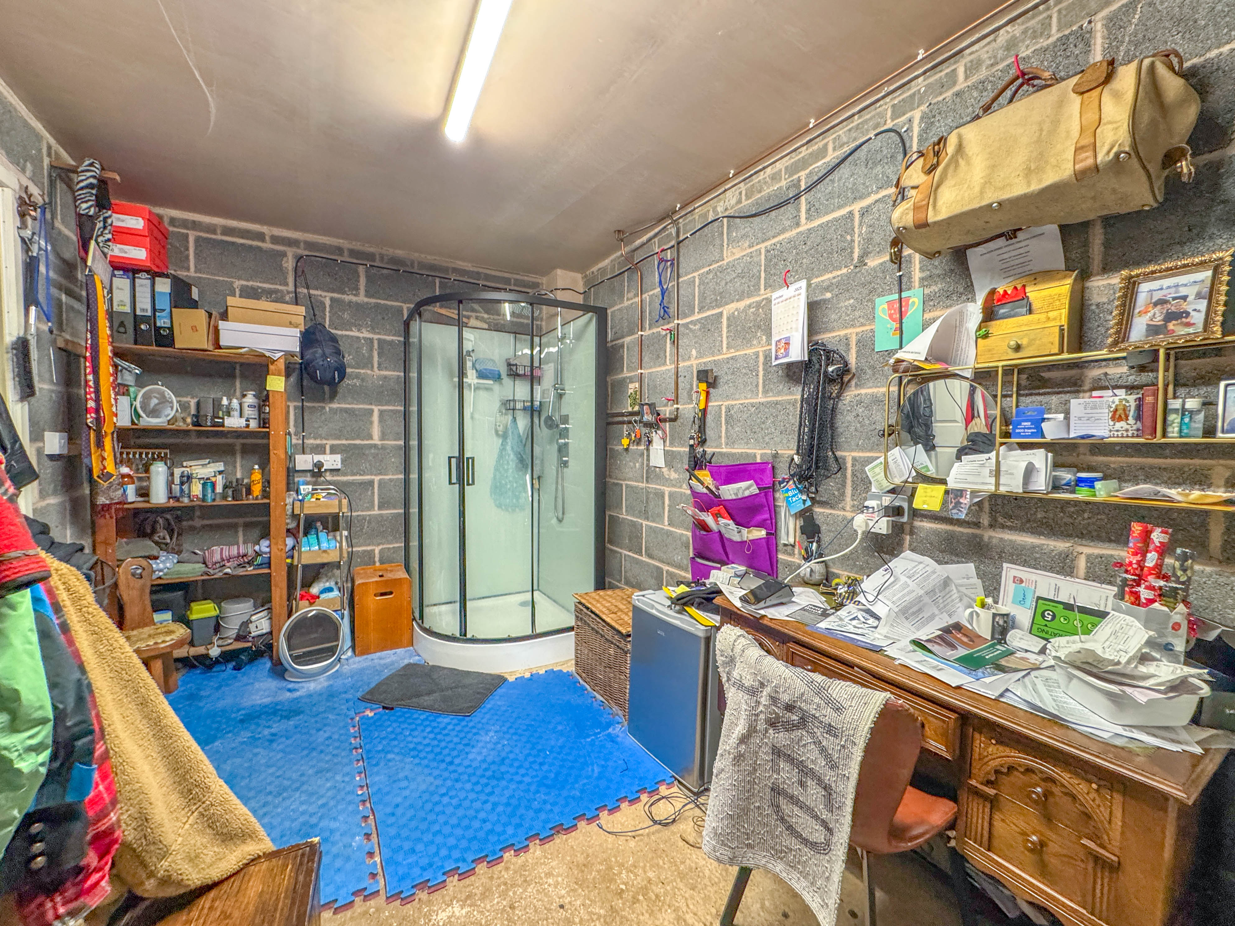 Entering through the front door, the ground floor offers a highly adaptable layout. A welcoming entrance hallway leads to a ground floor bedroom or additional reception room with French doors opening onto the rear garden. A kitchenette/utility room sits adjacent, fitted with plumbing for a washing machine and handy garden access. There is a double bedroom/sitting room with French doors that open onto the garden, also a guests’ WC and internal access to the integral garage, which has been cleverly adapted to include a walk-in shower with mains supply—offering further potential for self-contained accommodation or work-from-home conversion.
