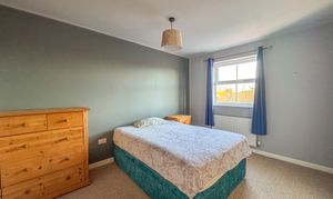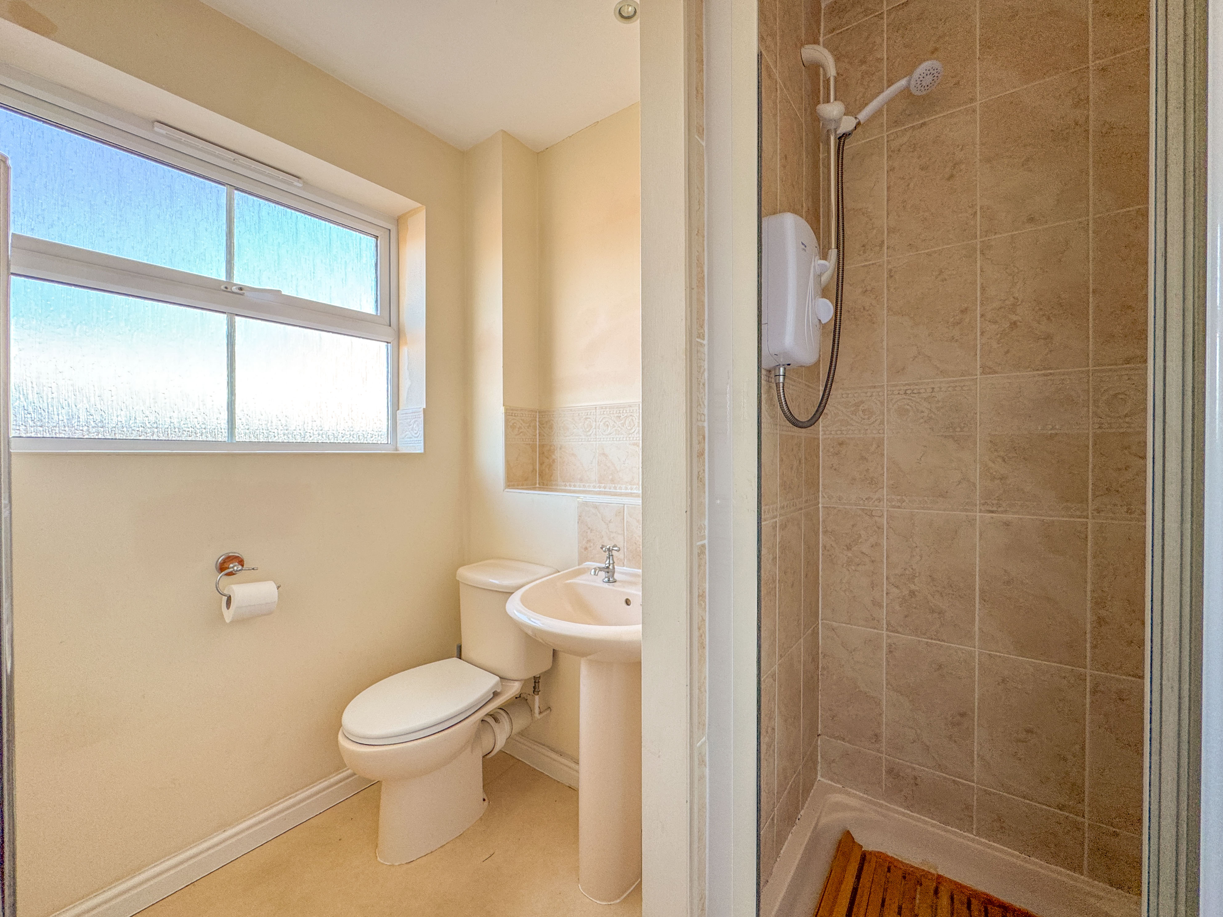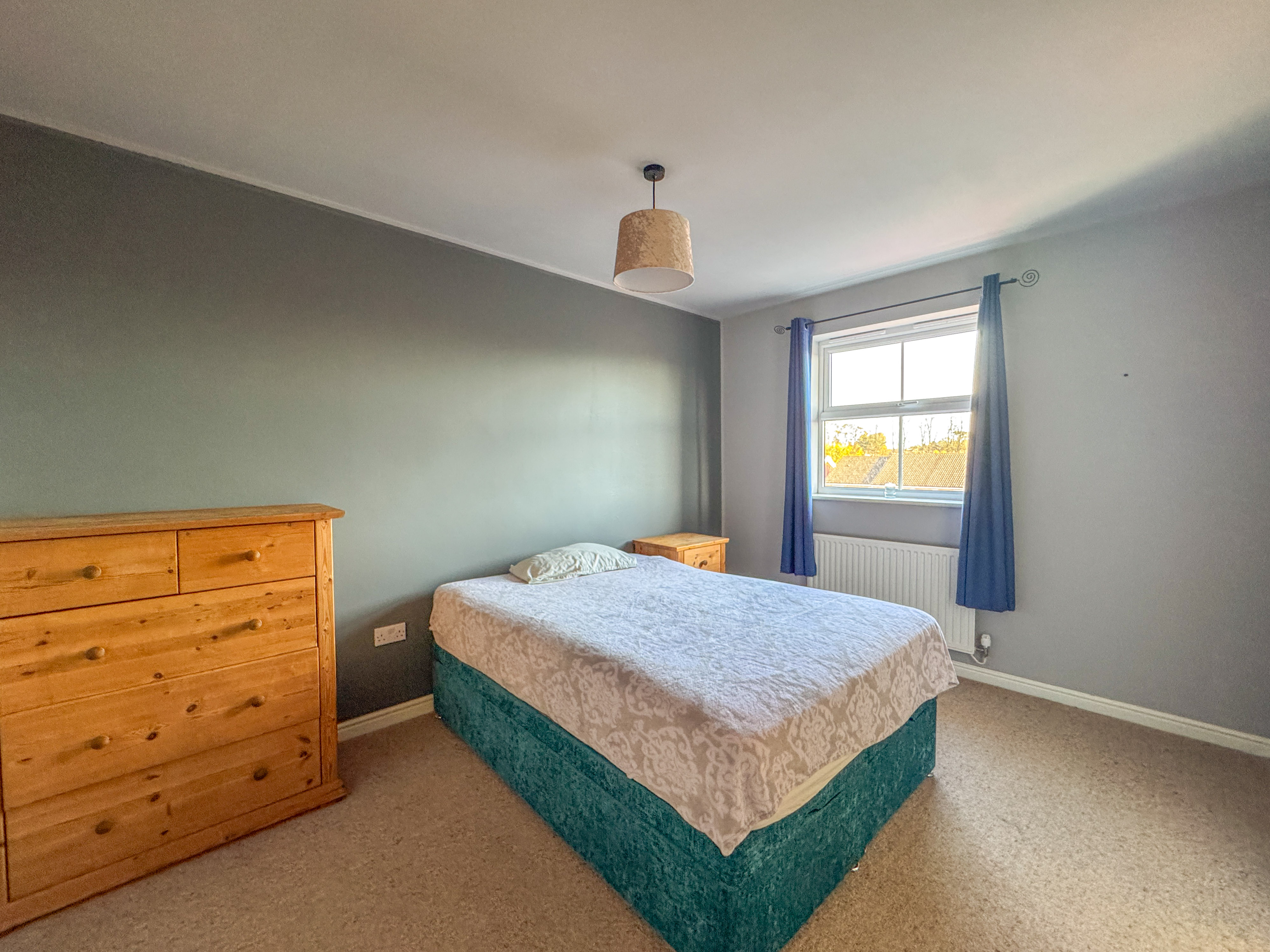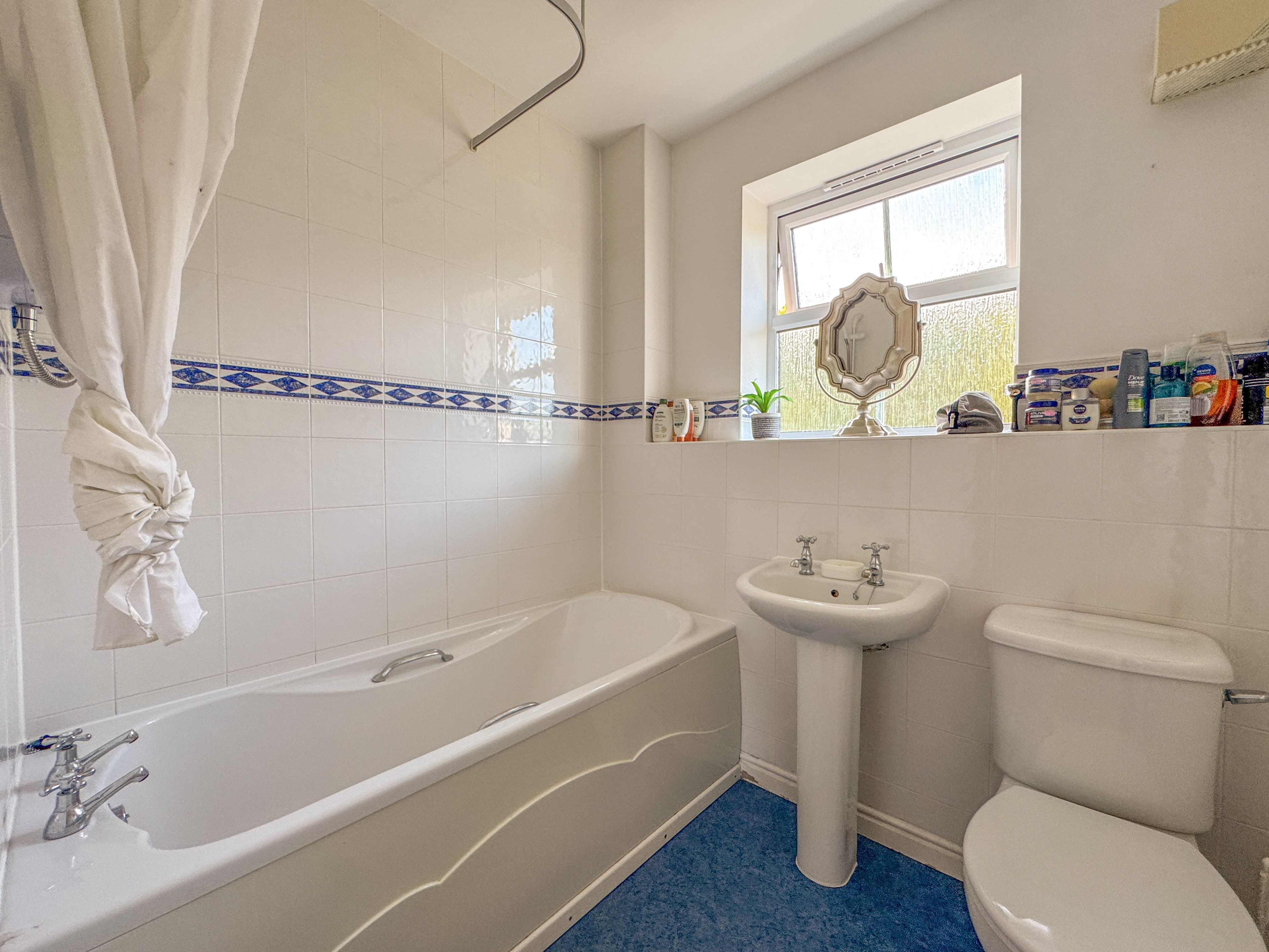 The second-floor houses two generous double bedrooms. The principal bedroom, to the front, benefits from fitted storage and a modern en-suite shower room with electric shower. The rear bedroom enjoys views over the garden and canal and is served by a main bathroom, complete with a three-piece white suite and electric shower over bath.