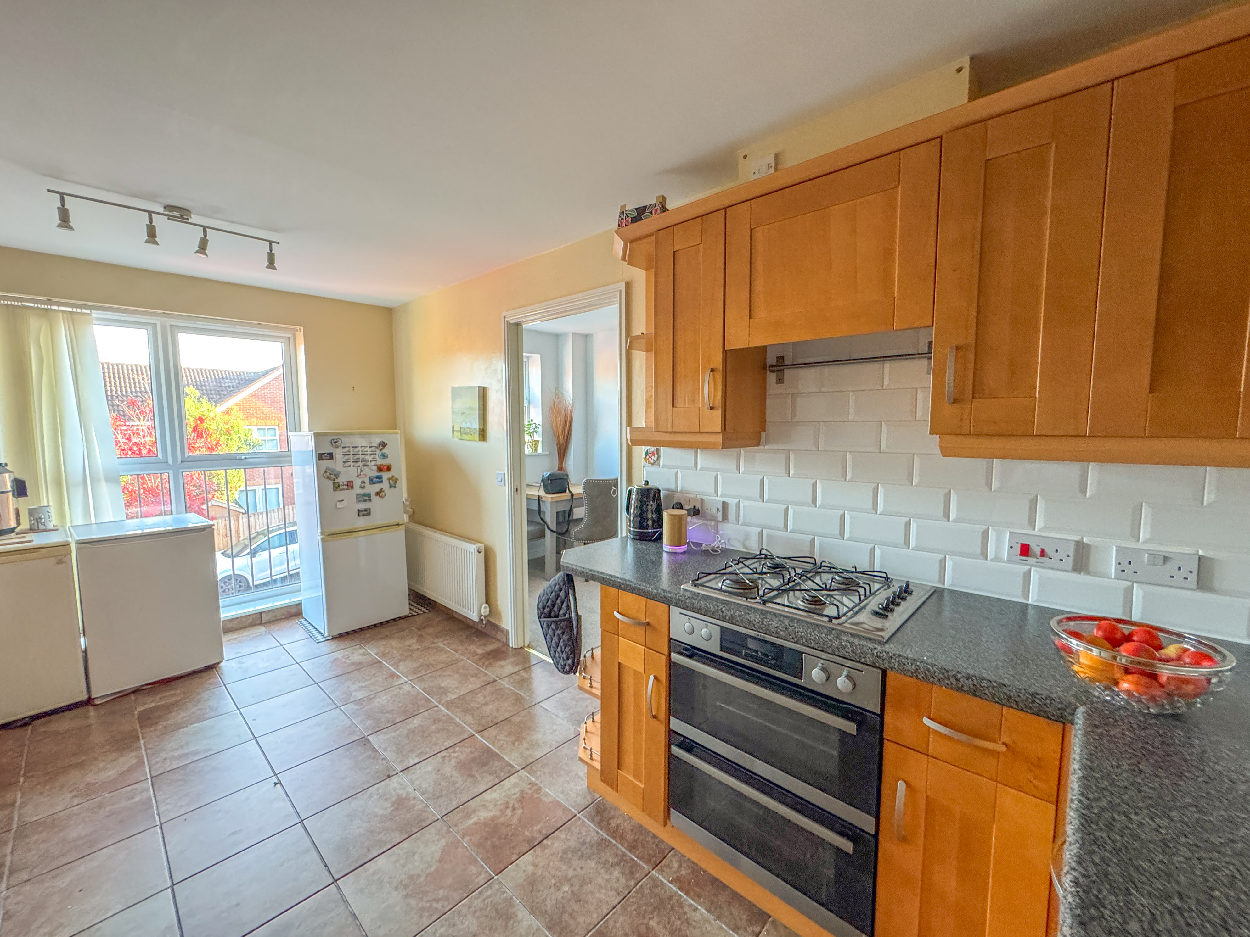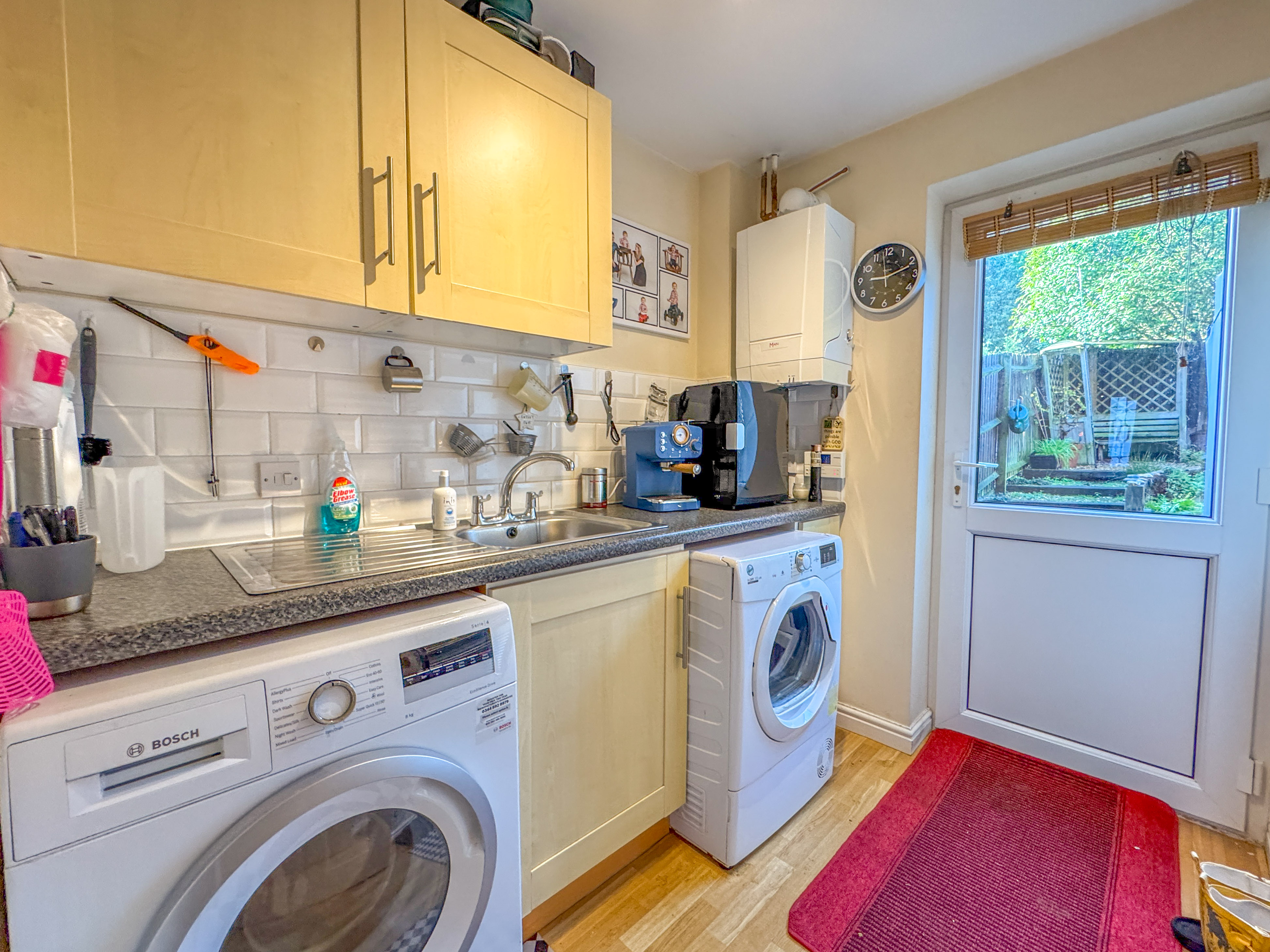 To the first floor, a light-filled living room enjoys a lovely outlook over the canal and features a focal-point fireplace and ample space for seating. Opposite, the kitchen diner offers a well-equipped space with integrated oven, gas hob, plumbing for a dishwasher, and plenty of room for a dining table—ideal for family meals or entertaining.