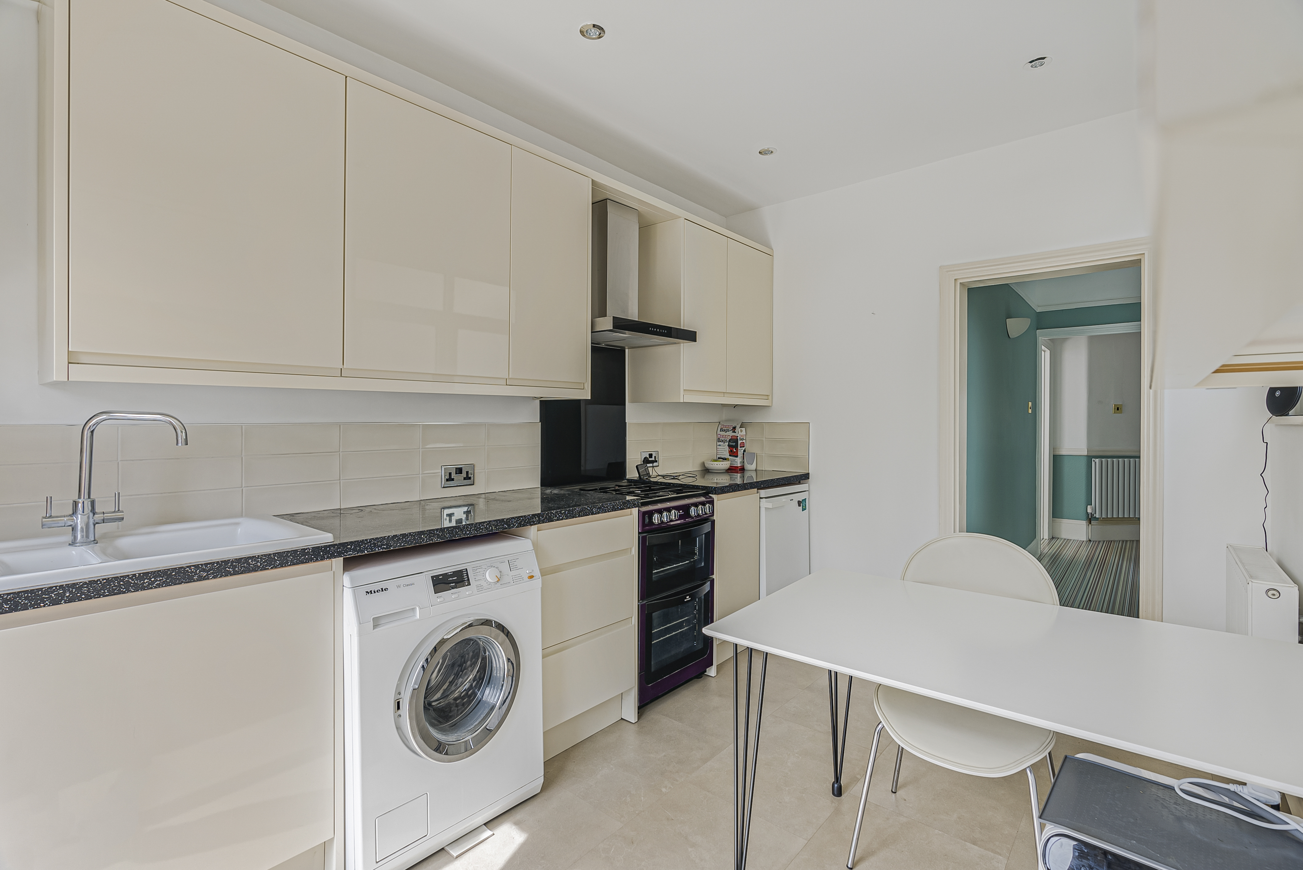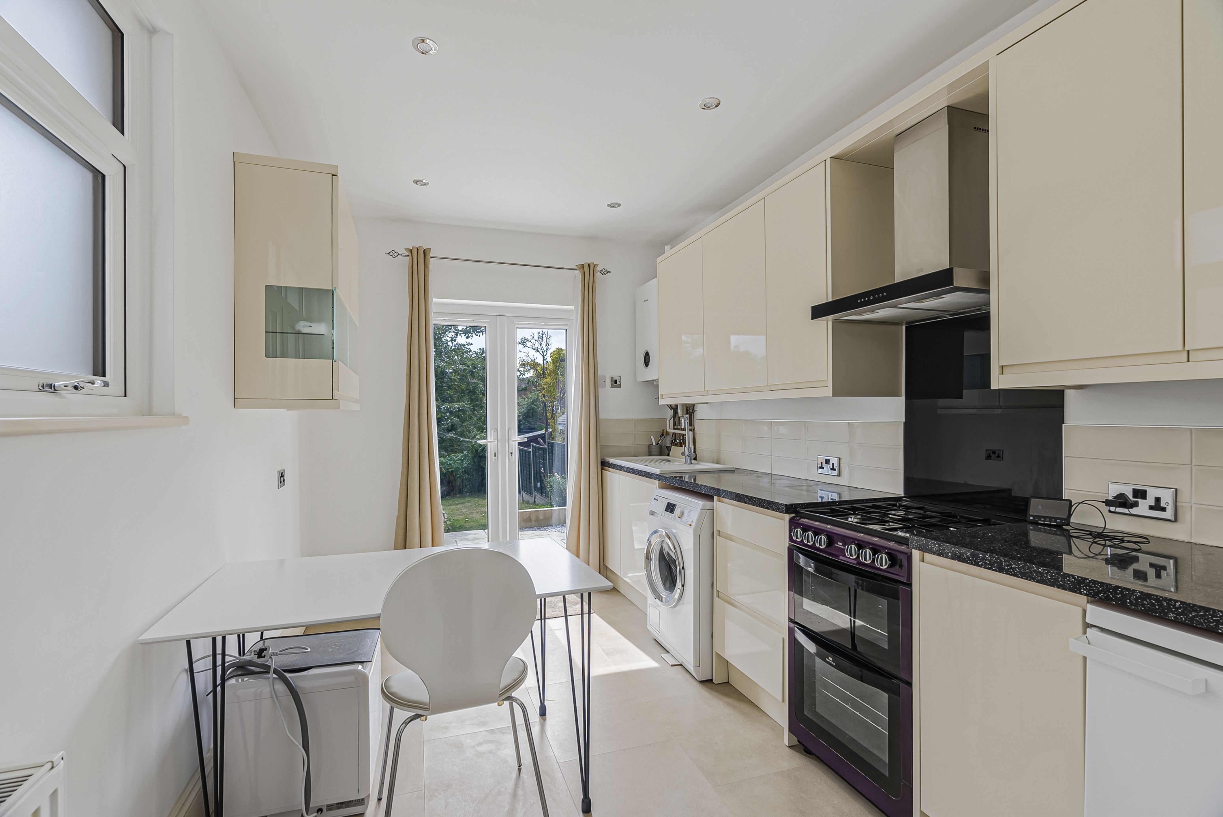 - Large Dual-Aspect Kitchen: A modern eat-in kitchen with French doors, integrated washing machine, dishwasher, and Worcester combi boiler.