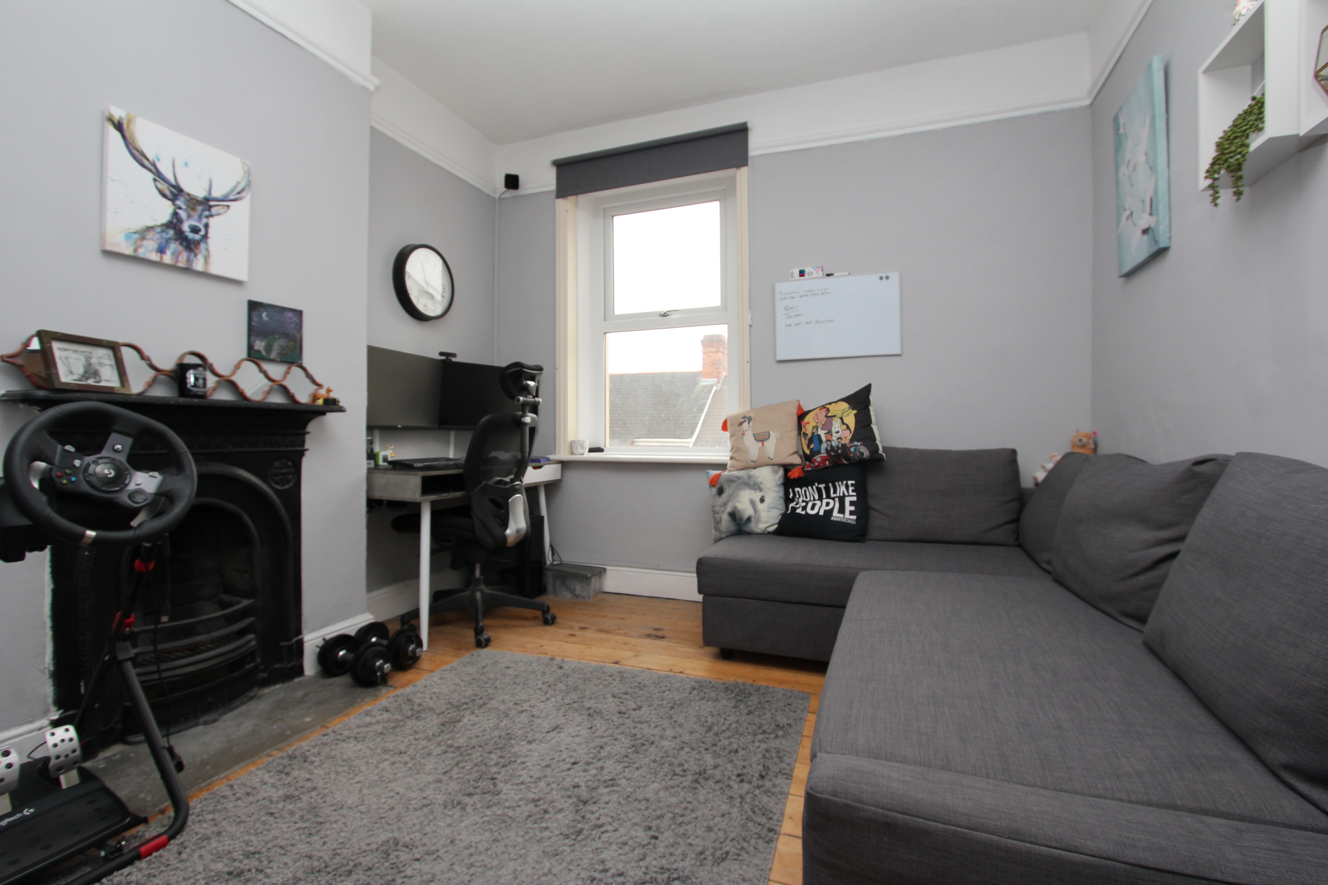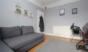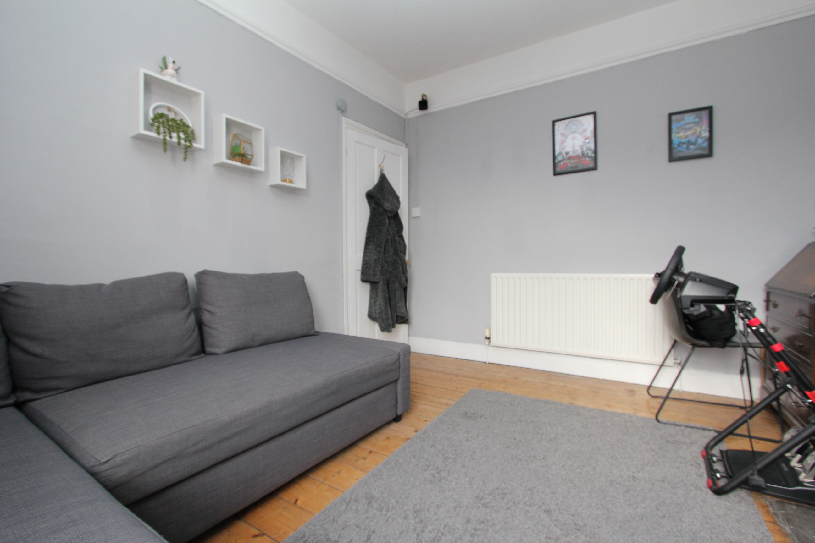 Wooden flooring, smooth walls with picture rails and a textured ceiling. Two front aspect windows, a radiator, a build in storage cupboard and a feature fireplace. Measurements exclude the alcoves either side of the chimney breast.