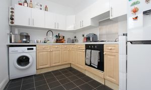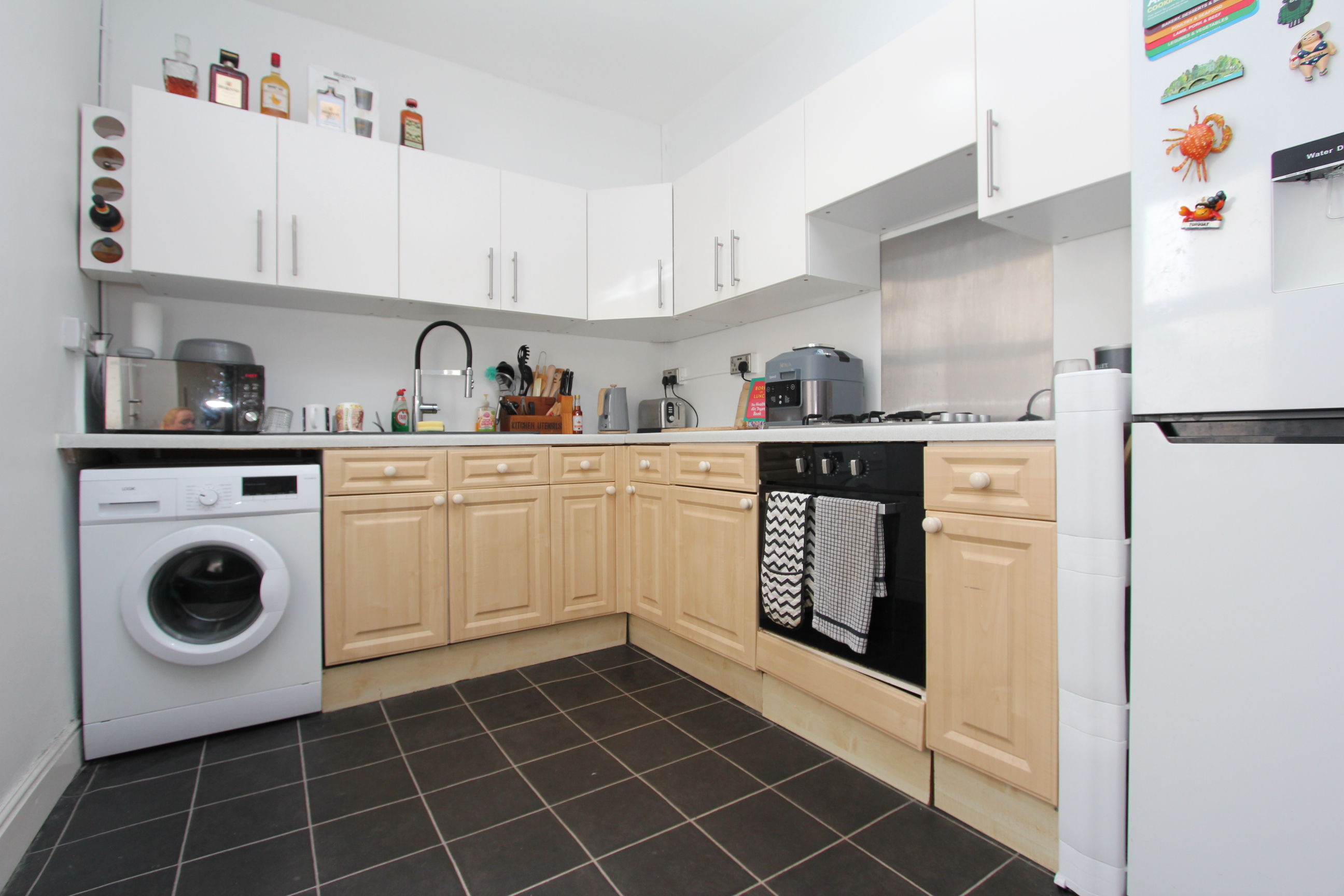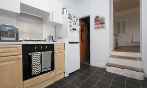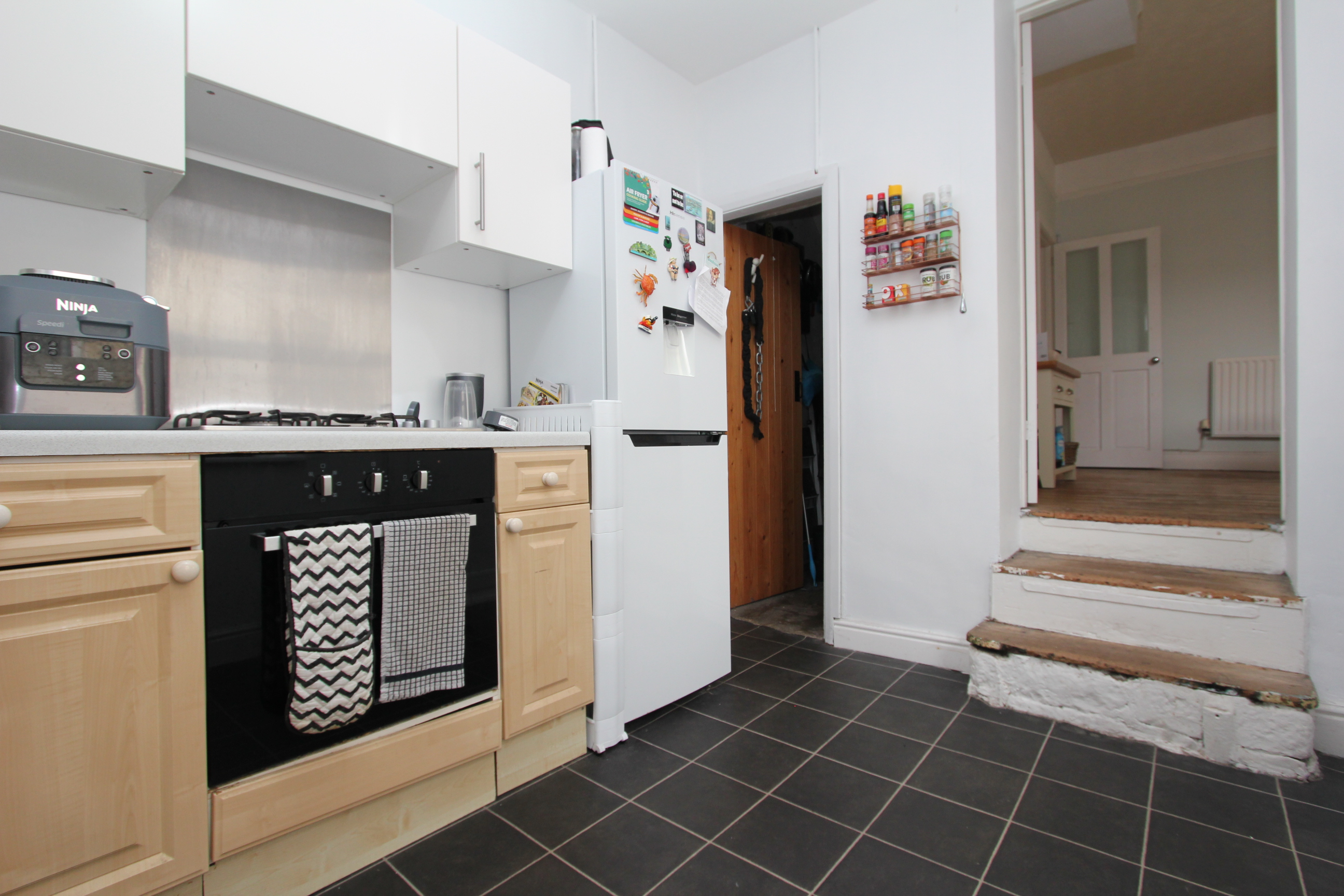 Steps lead down into the kitchen from the dining room. Black tiled flooring, smooth walls and a smooth ceiling. Wooden base level units and modern white eye level units, with complementing light worktops. A black one and a half bowled sink inset with a stainless steel pull-out spray tap overtop. Integrated appliances include a single oven, a four ring gas hob and an extractor fan. There is a stainless steel backsplash behind the hob. Space and plumbing for a washing machine and ample space for a fridge/freezer. There is a door leading to the understairs storage cupboard, a uPVC door with opaque glazing leading out into the garden and a side aspect window.