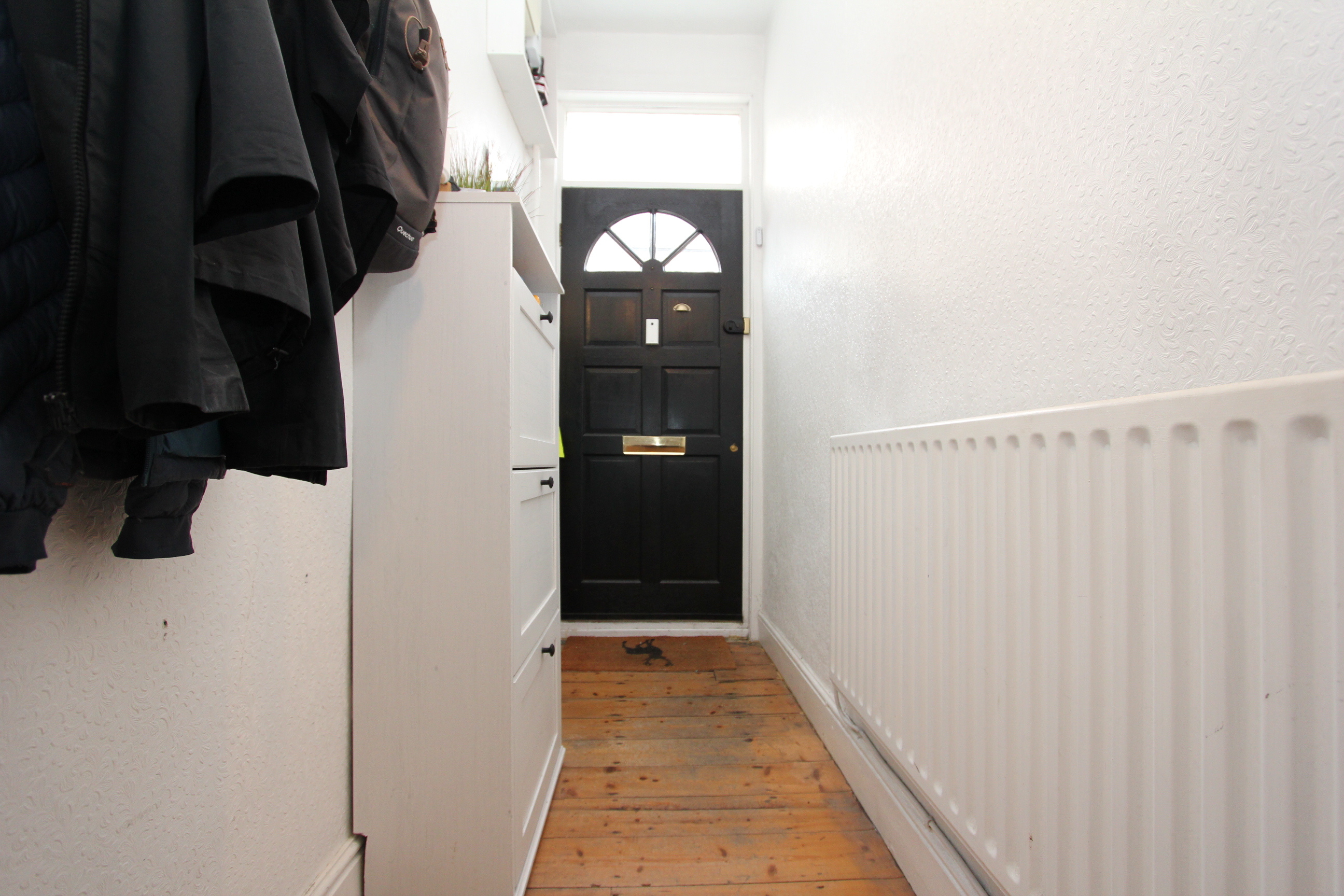 Entrance via a wooden front door with semi-circular glazed panels and an opaque panel above displaying the house number. The hallway has wooden flooring, wallpapered walls and a textured ceiling. A radiator, stairs leading to the first floor and doors leading to the lounge and dining room.