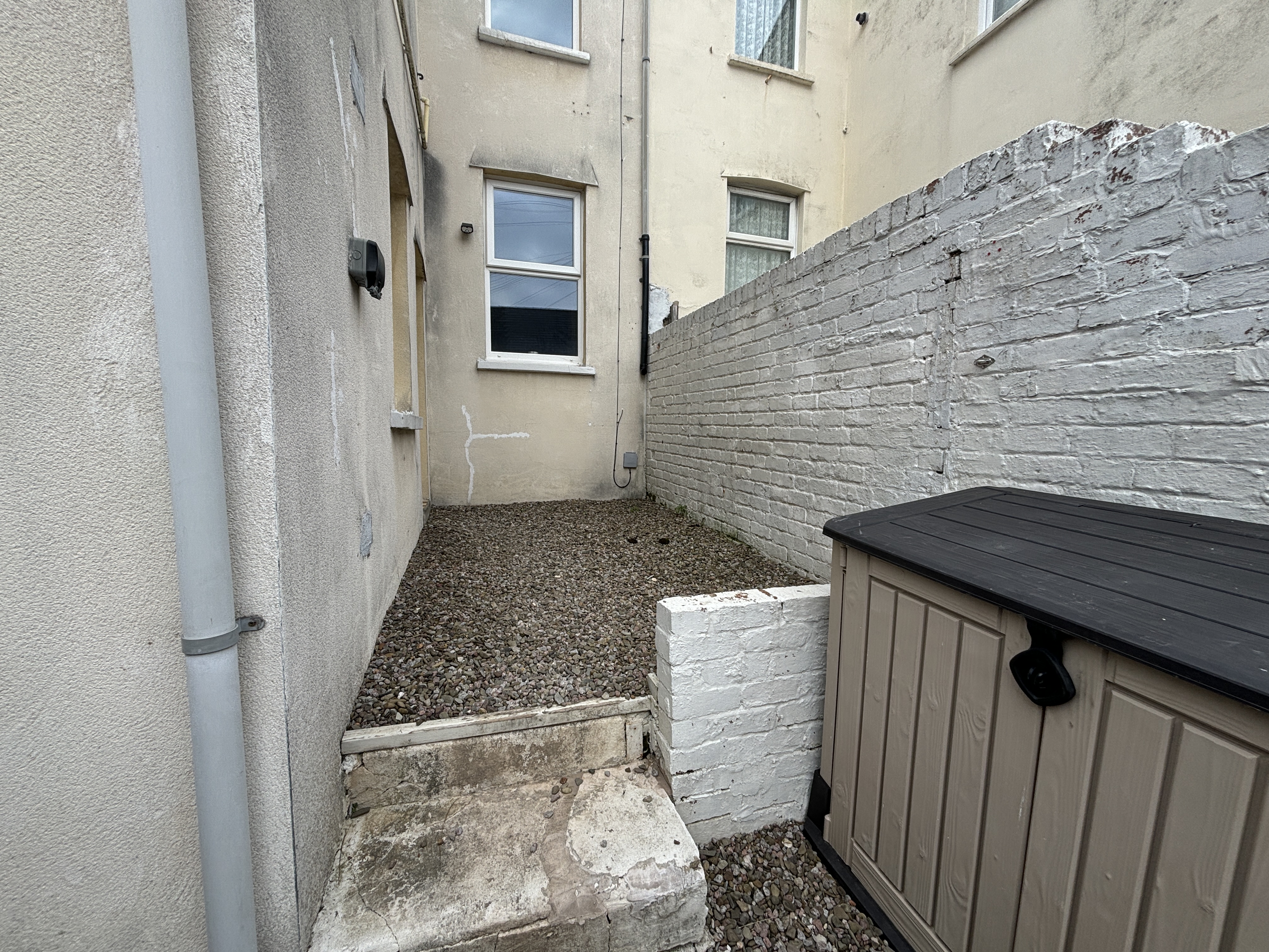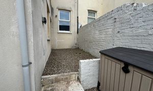 Step out of the uPVC door from the kitchen onto an area of decorative stones alongside the property. There are steps leading down to a larger area of decorative stones complete with a paved pathway leading to the rear access gate. The garden is fully enclosed by brick walls and also has a storage shed.