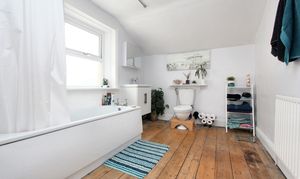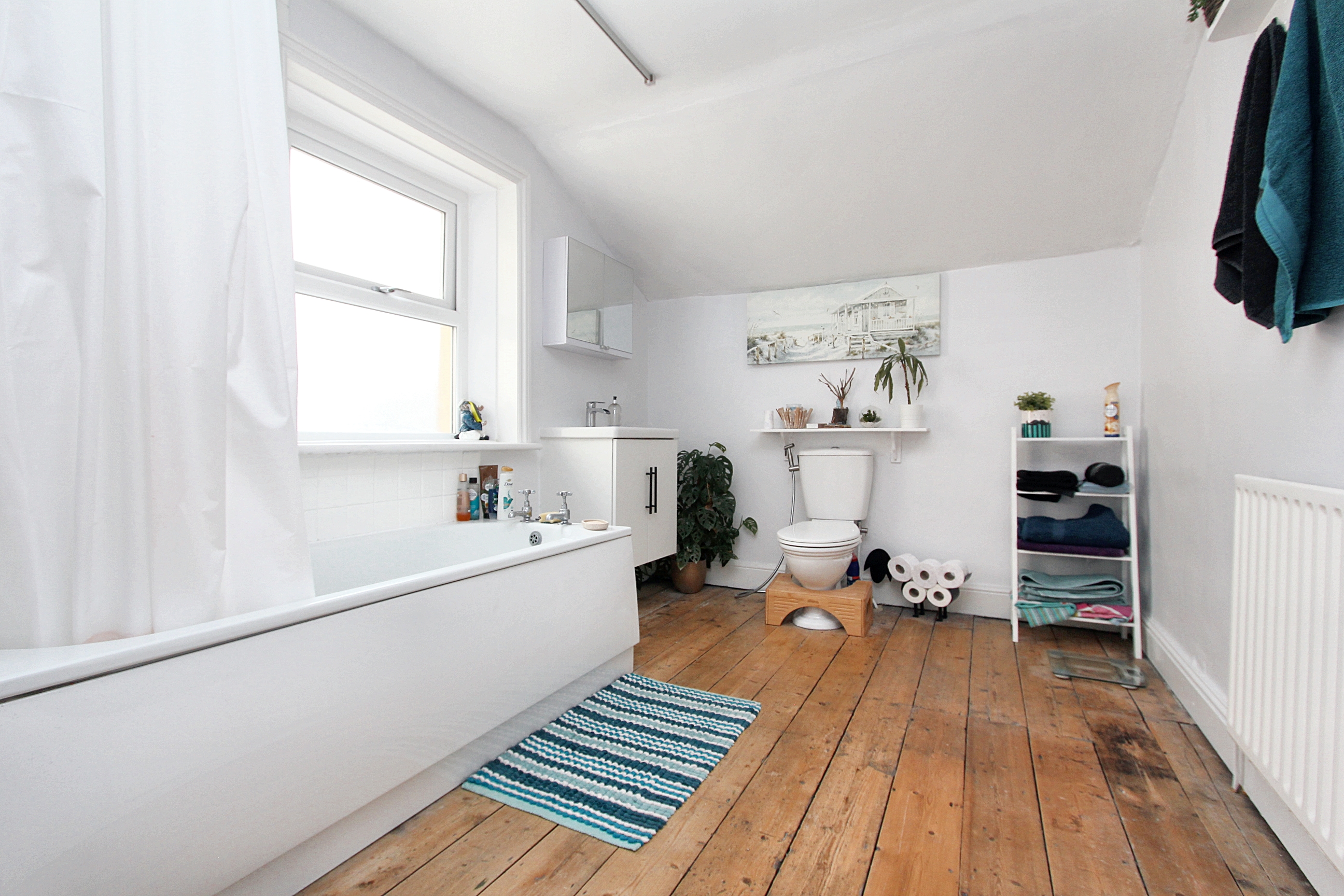 Wooden flooring, smooth walls and a smooth ceiling. A three piece white suite comprising a WC with a push button flush, a white vanity basin with a stainless steel waterfall tap and a white bath with stainless steel pillar taps and a stainless steel thermostatic shower inset with a rainfall shower head and separate rinser. Full height tiling within the bath/shower. An opaque side aspect window, a cupboard housing the boiler and a radiator.