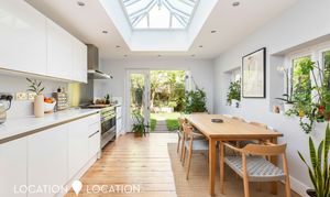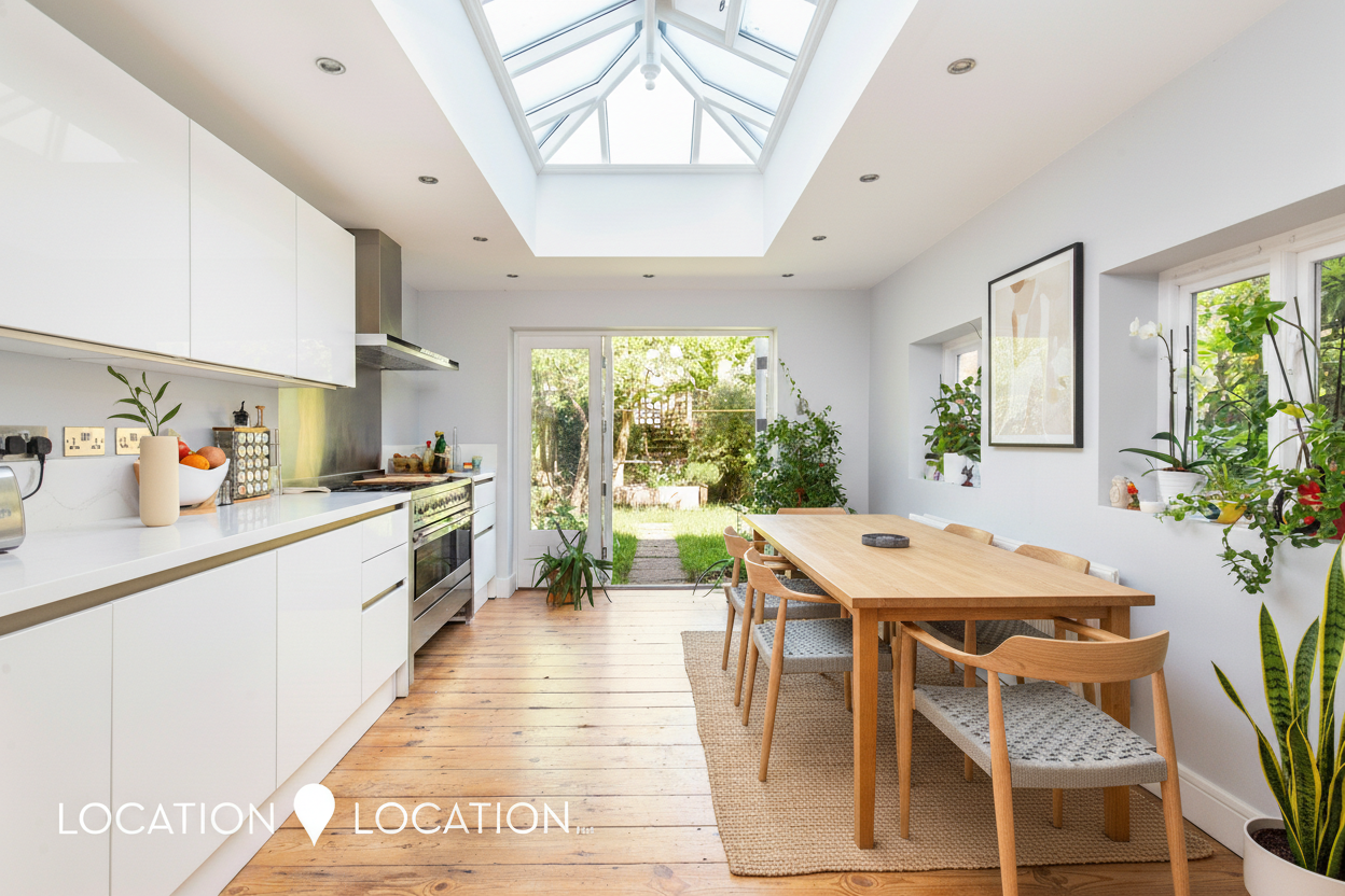 The ground floor offers excellent space to dine and entertain, and is well suited to family life, with a wide through-reception room retaining a wealth of the original character (fireplaces, sash windows and cornicing), plus a beautiful open-plan kitchen/dining room, complete with a n extended sky light, wall-to-wall kitchen, integrated appliances, and sleek double doors that lead out to the wonderful west-facing garden.