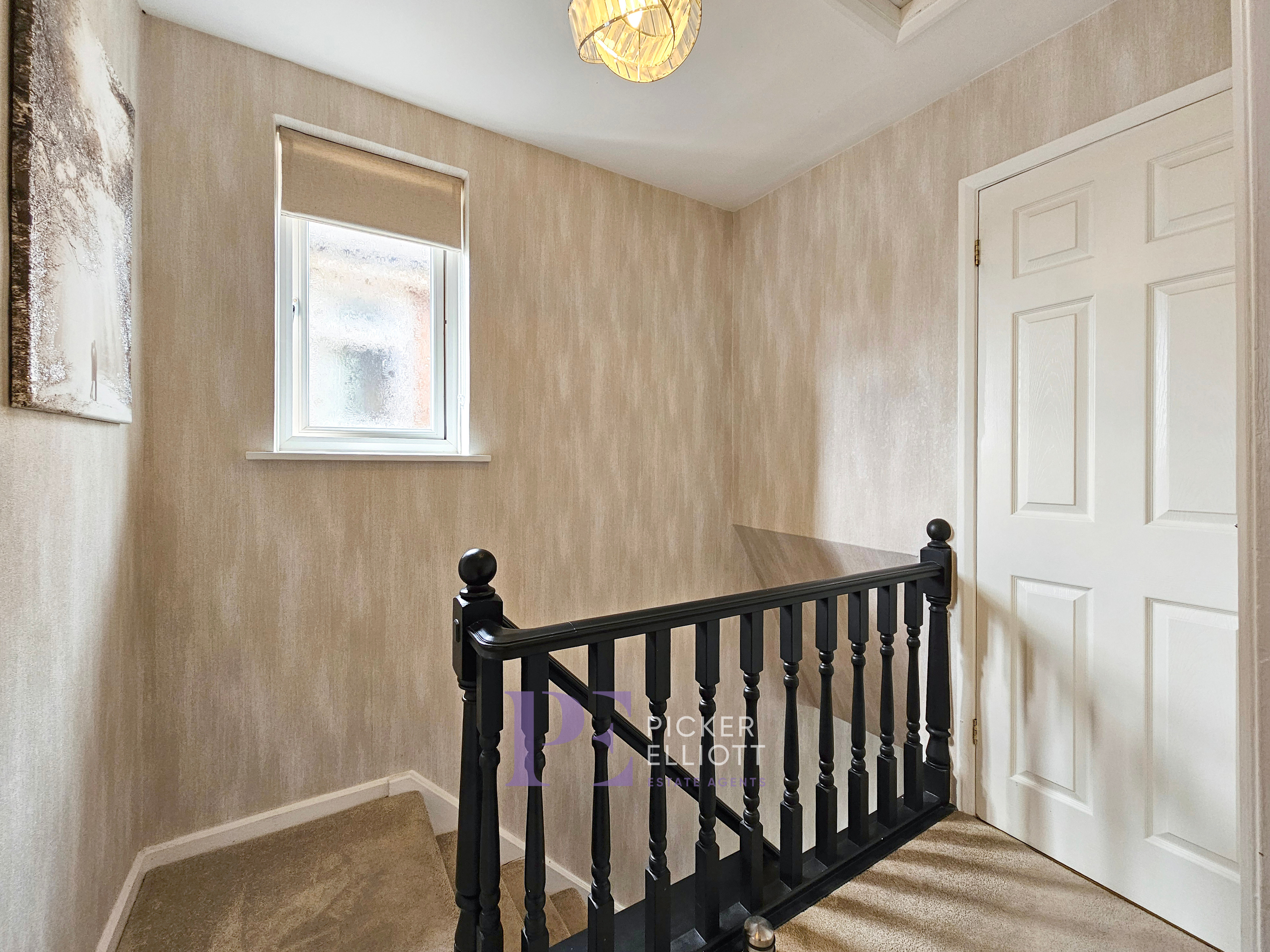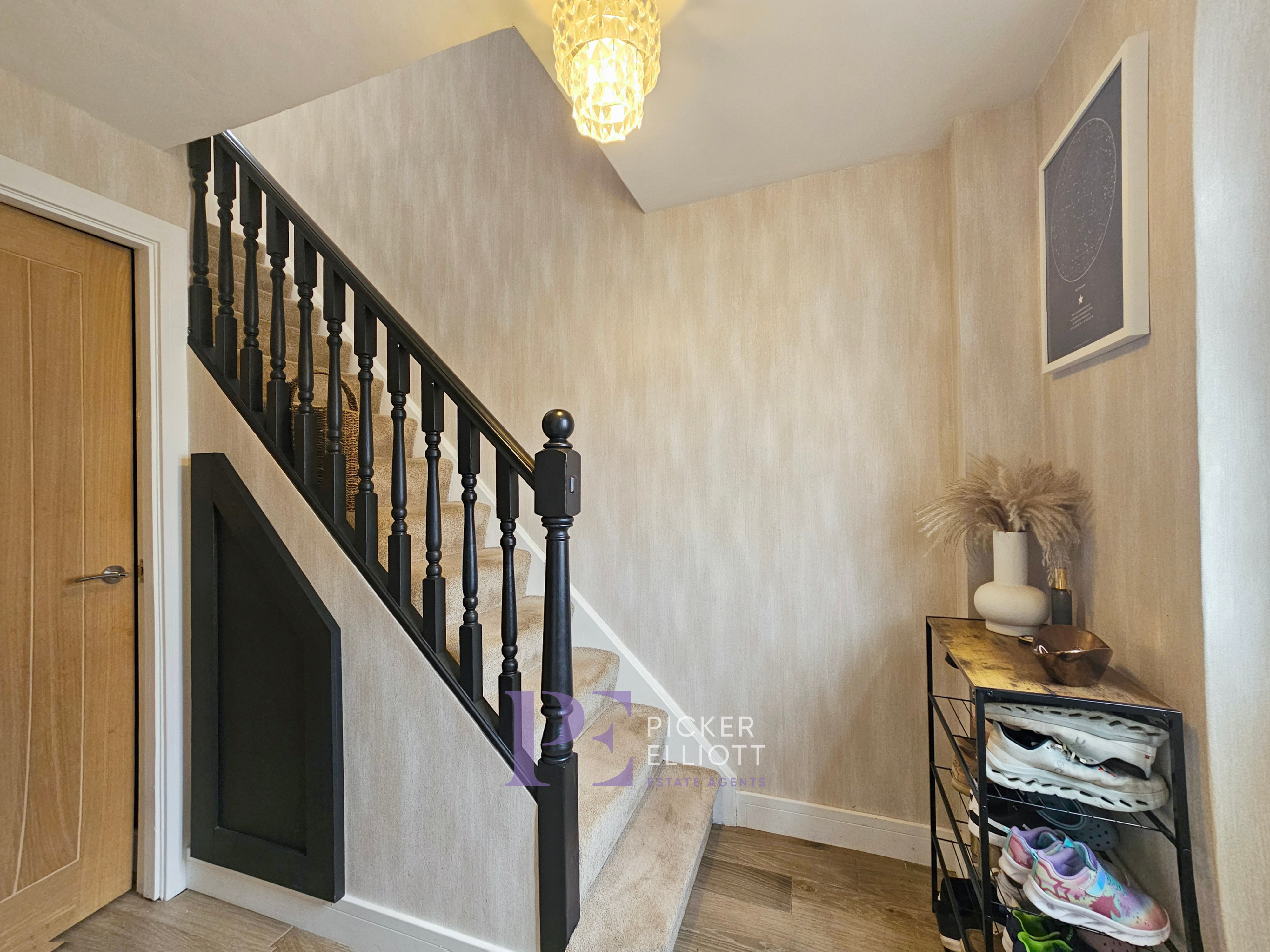 Stairs to first floor landing with spindle balustrade, contemporary radiator, ceramic tiled flooring