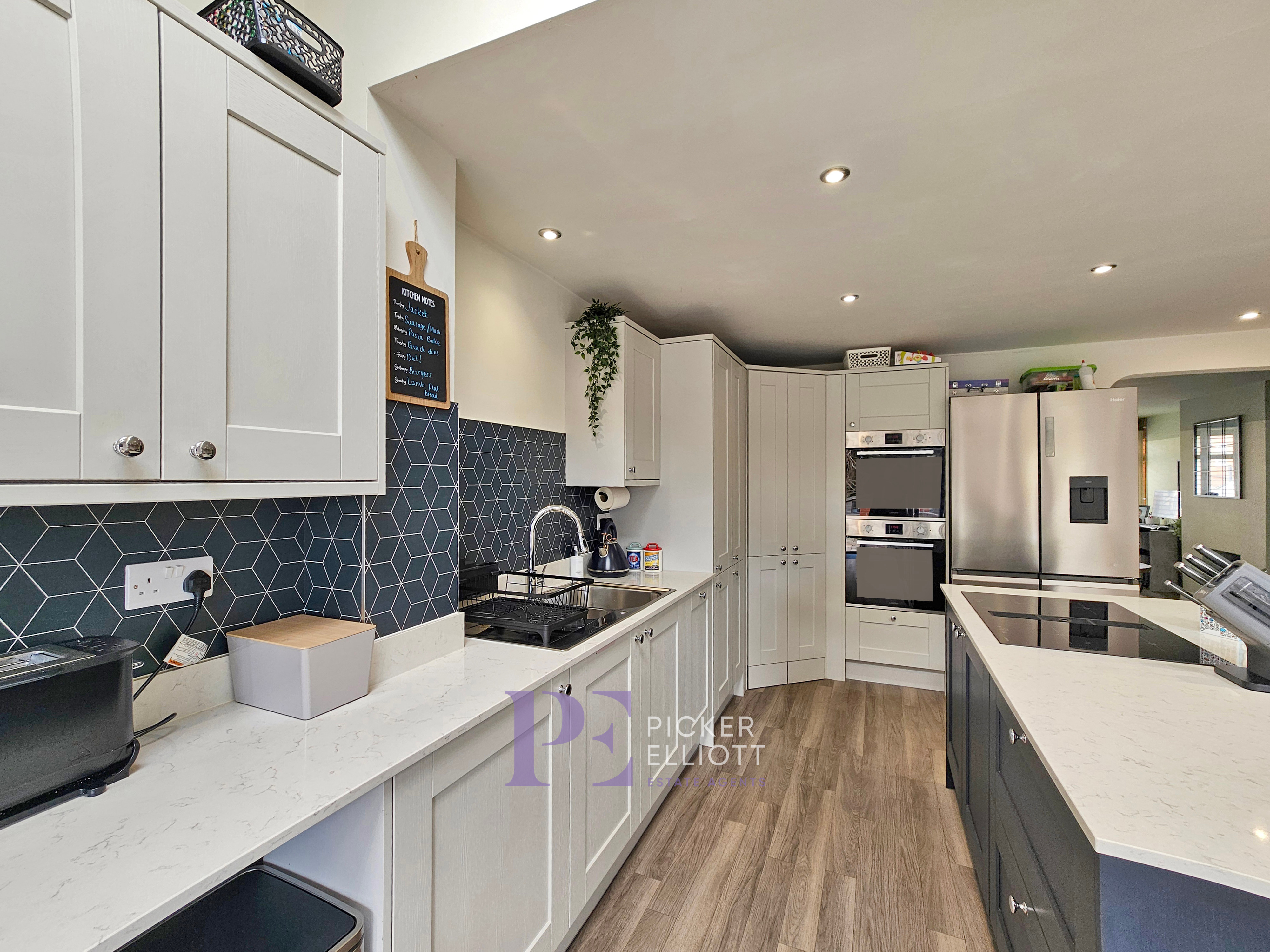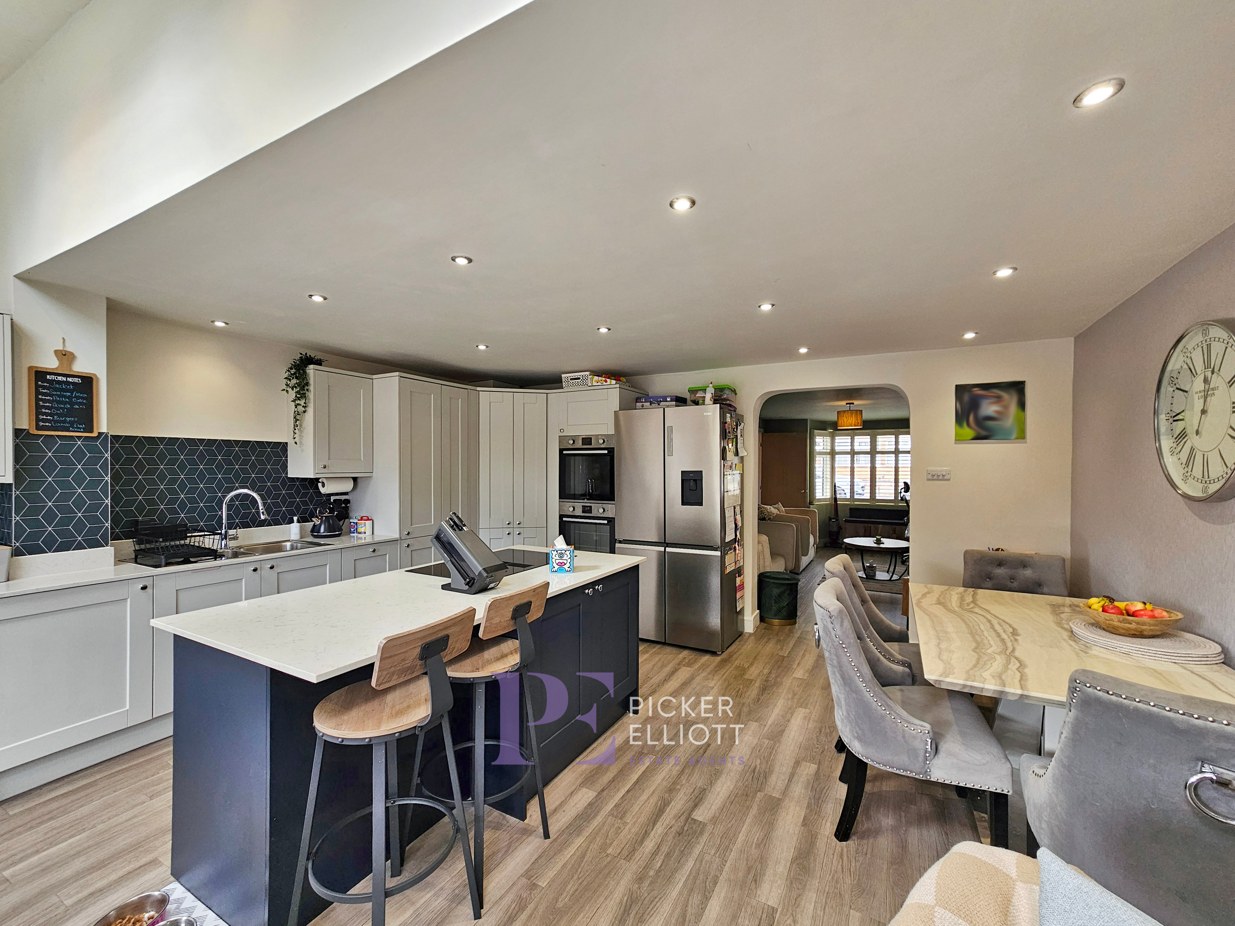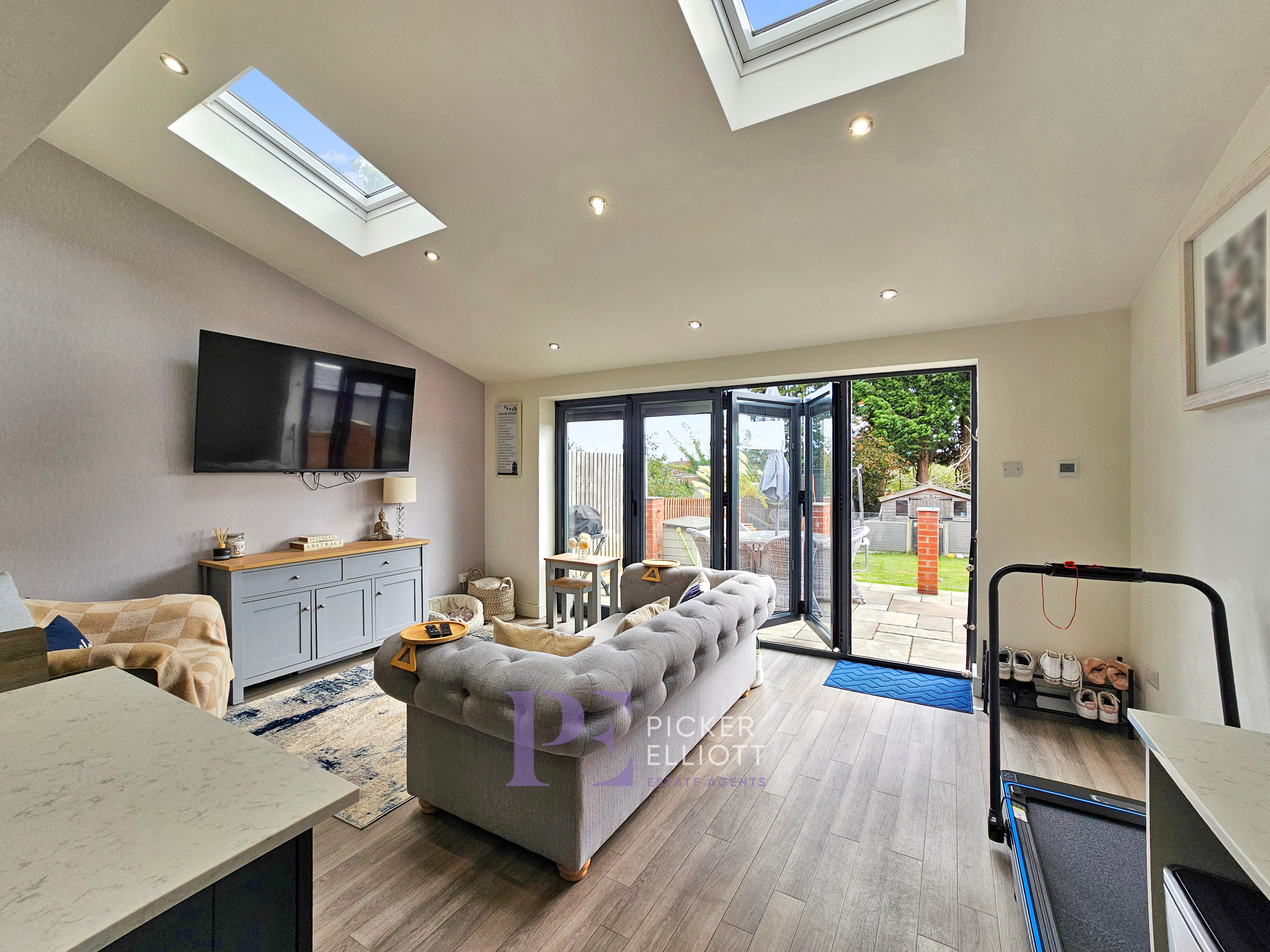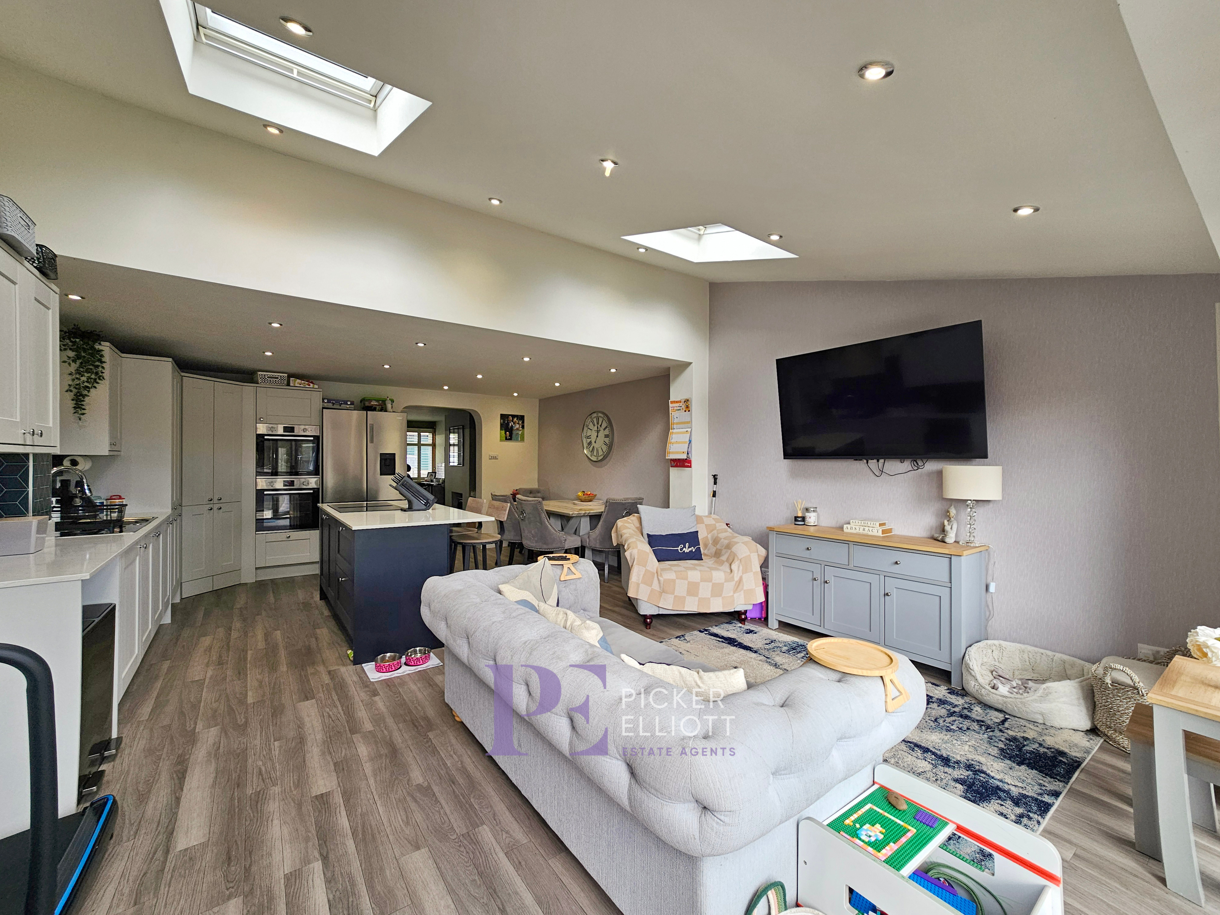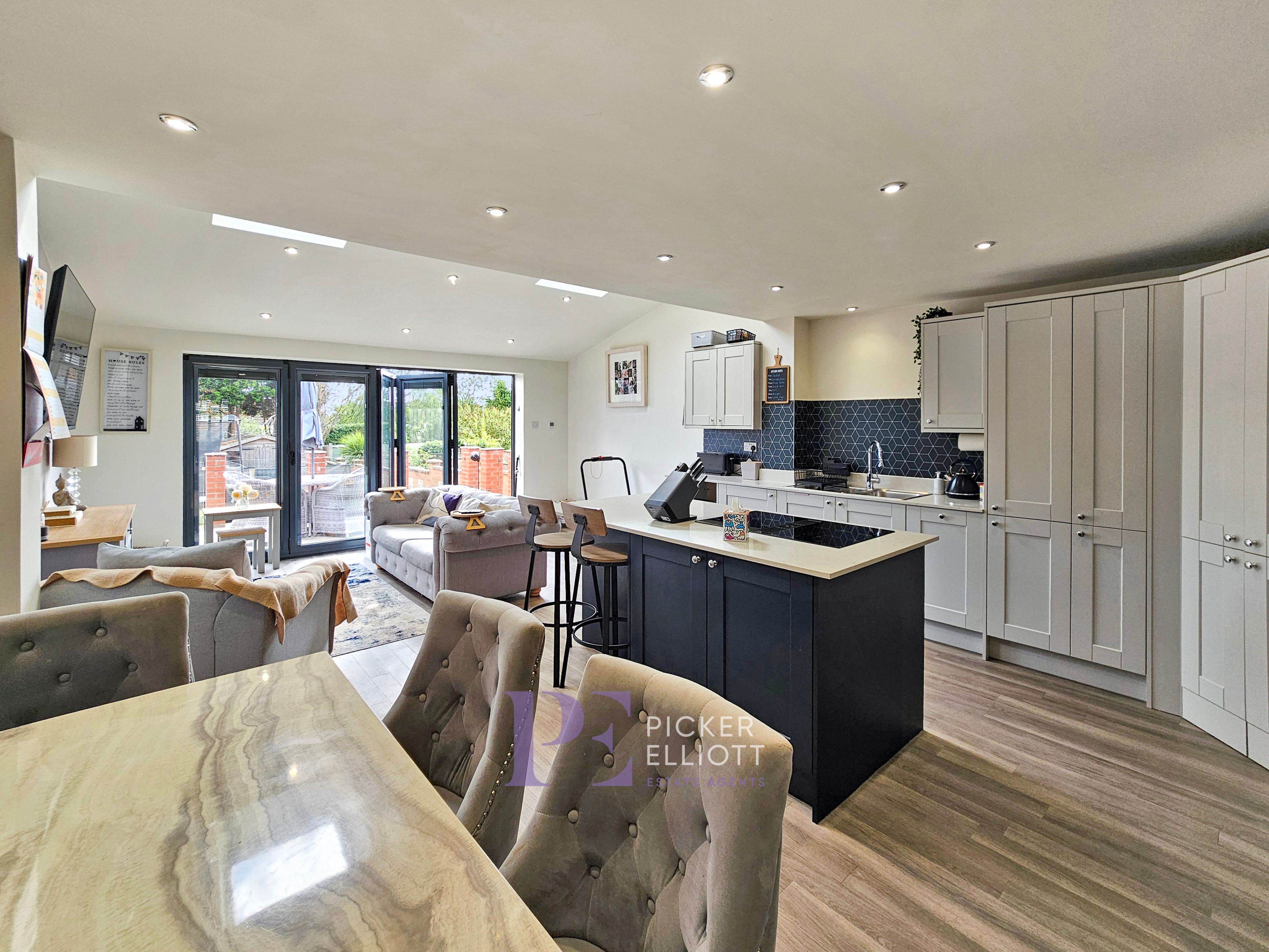 Impressive open plan living with the excellent range contemporary base and wall units with full length storage cupboards, built in double oven, space for American fridge freezer, Central Island with inset electric hob and built-in extractor, inset one and a half drainer sink with mixer tap, integrated dishwasher inset spotlights , under floor heating two ceiling windows, by-folding doors, breakfast bar area