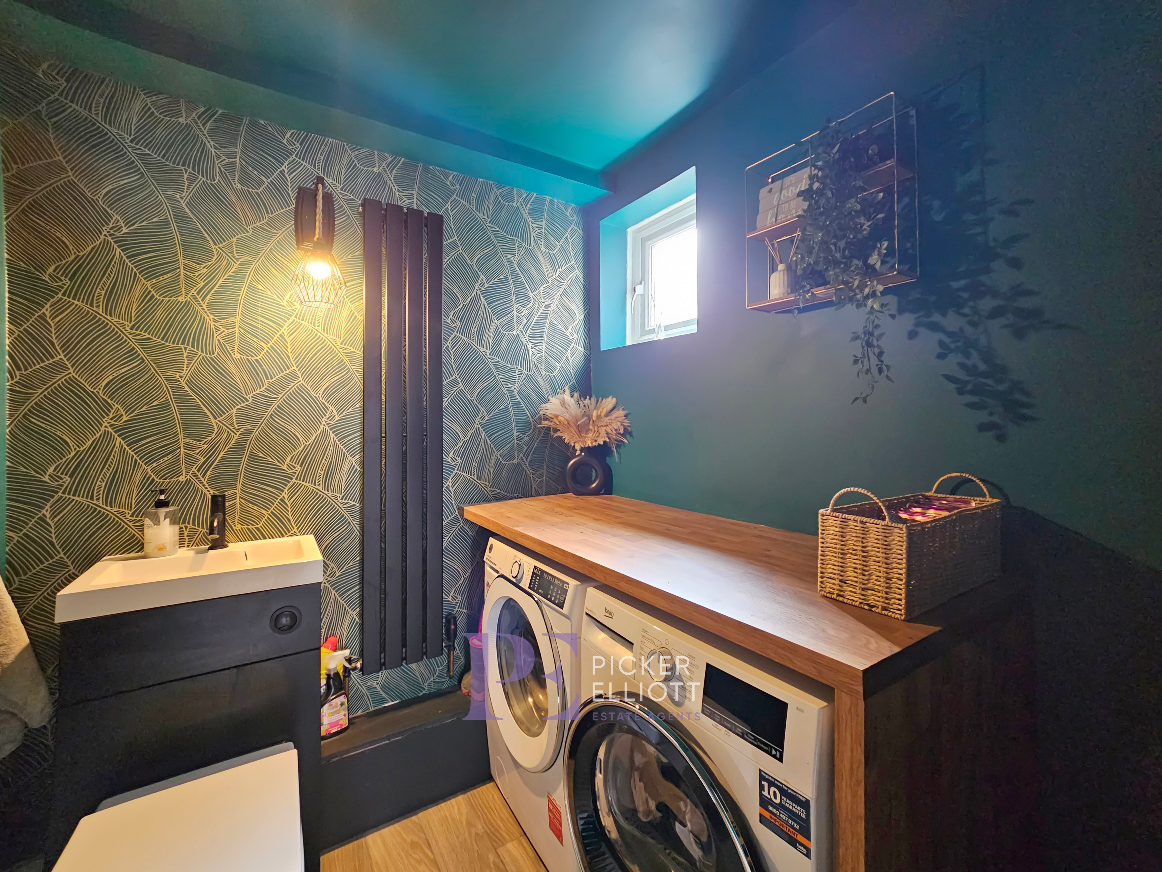 Opaque double glazed window, contemporary vertical radiator, space and point for washing machine, space for tumble dryer, wood effect work surface, ceramic tiled flooring, low level flush WC with built-in sink