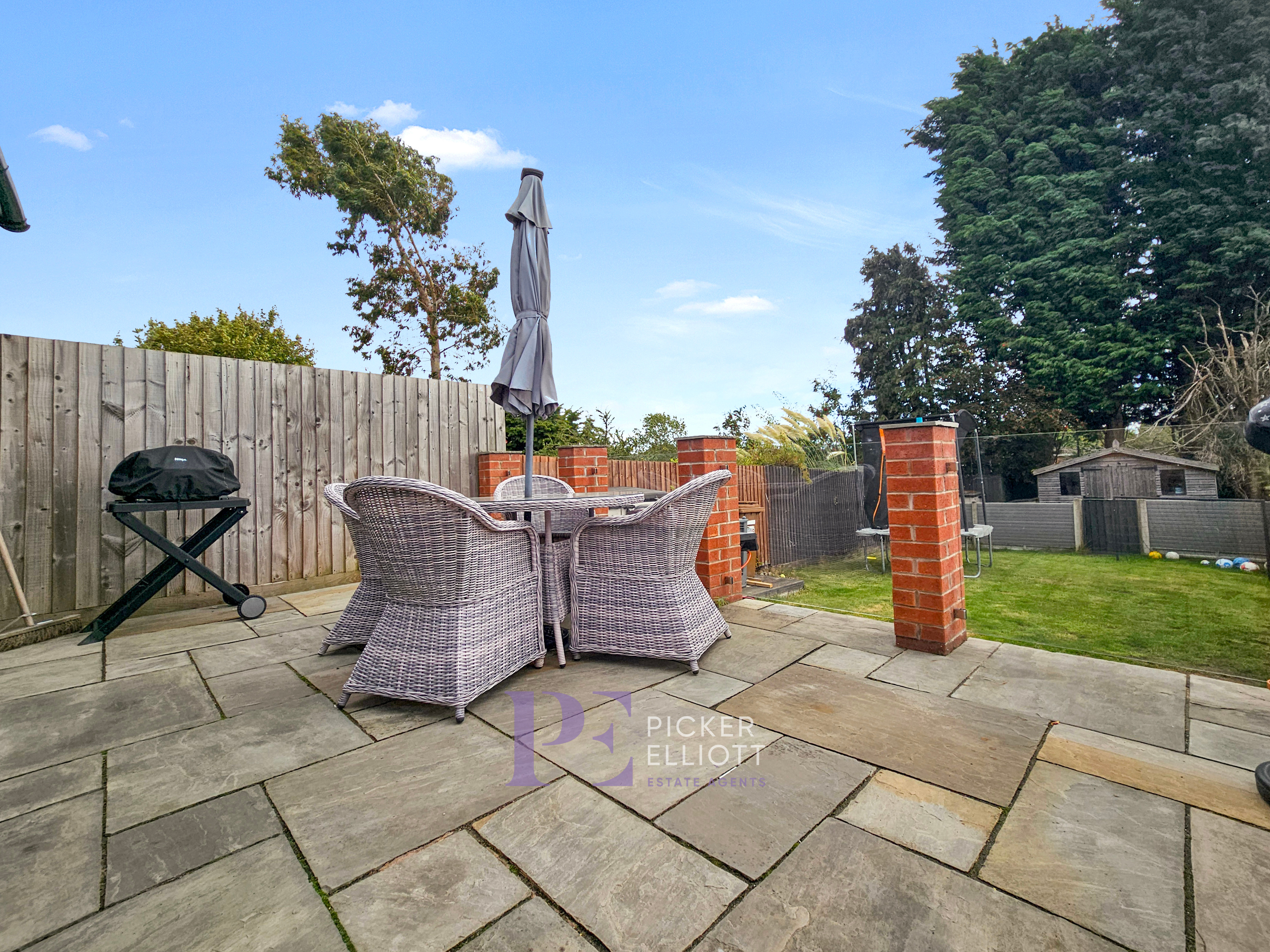 Beautifully landscape rear garden with raised slab patio and glass and brick pillar retaining edging, slope leading down to main garden with decking, lawn and the second garden area with various sheds enclosed by brick wall and timber fencing, outside lighting, outside electric point and outside water tap