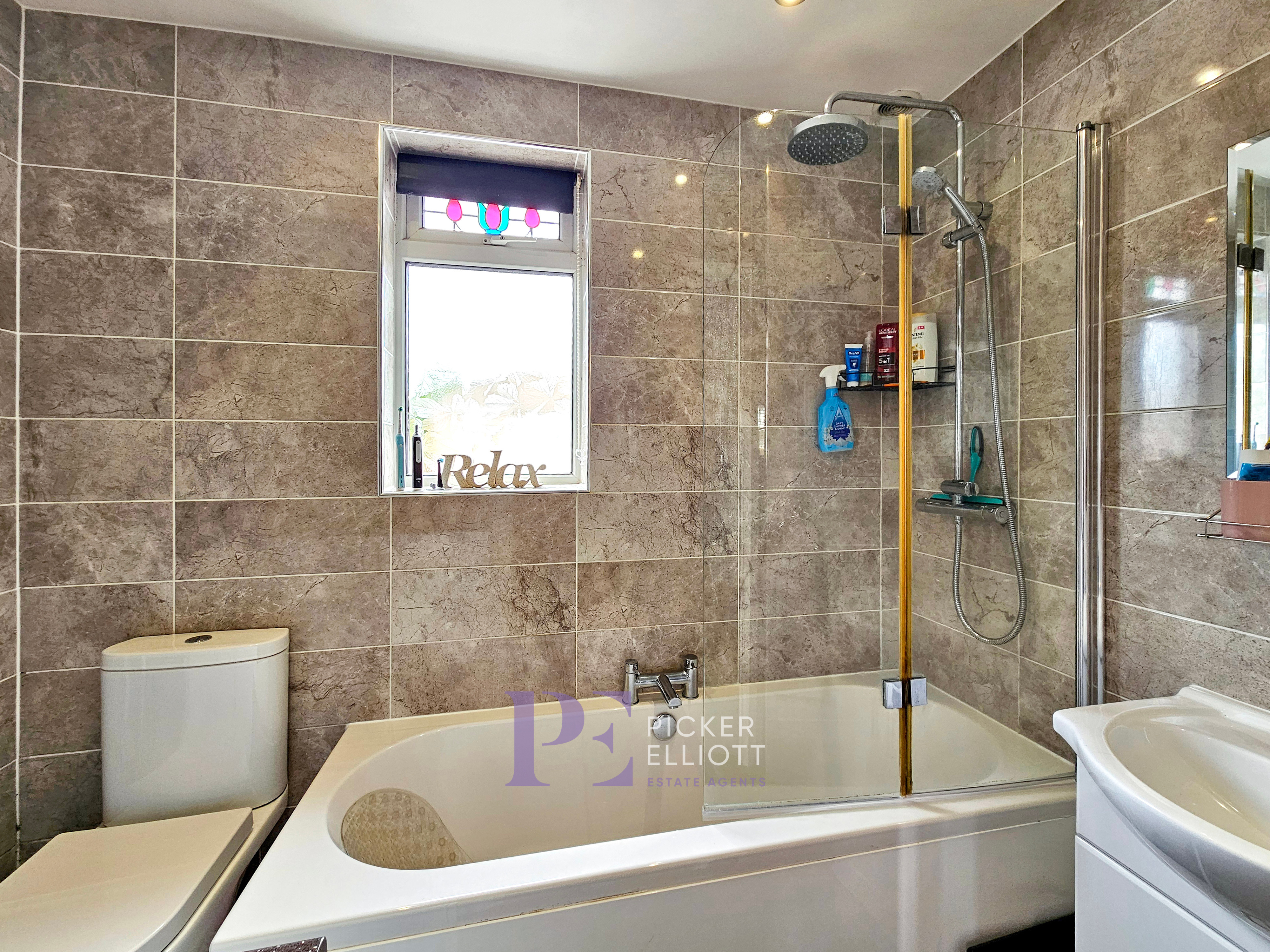 Low level flush WC, double ended bath with rain effect shower head and glass shower screen, vanity sink unit, inset spotlights, extractor fan, tiling to four walls, storage cupboard, two electric shaver points, chrome towel radiator and opaque double glazed window