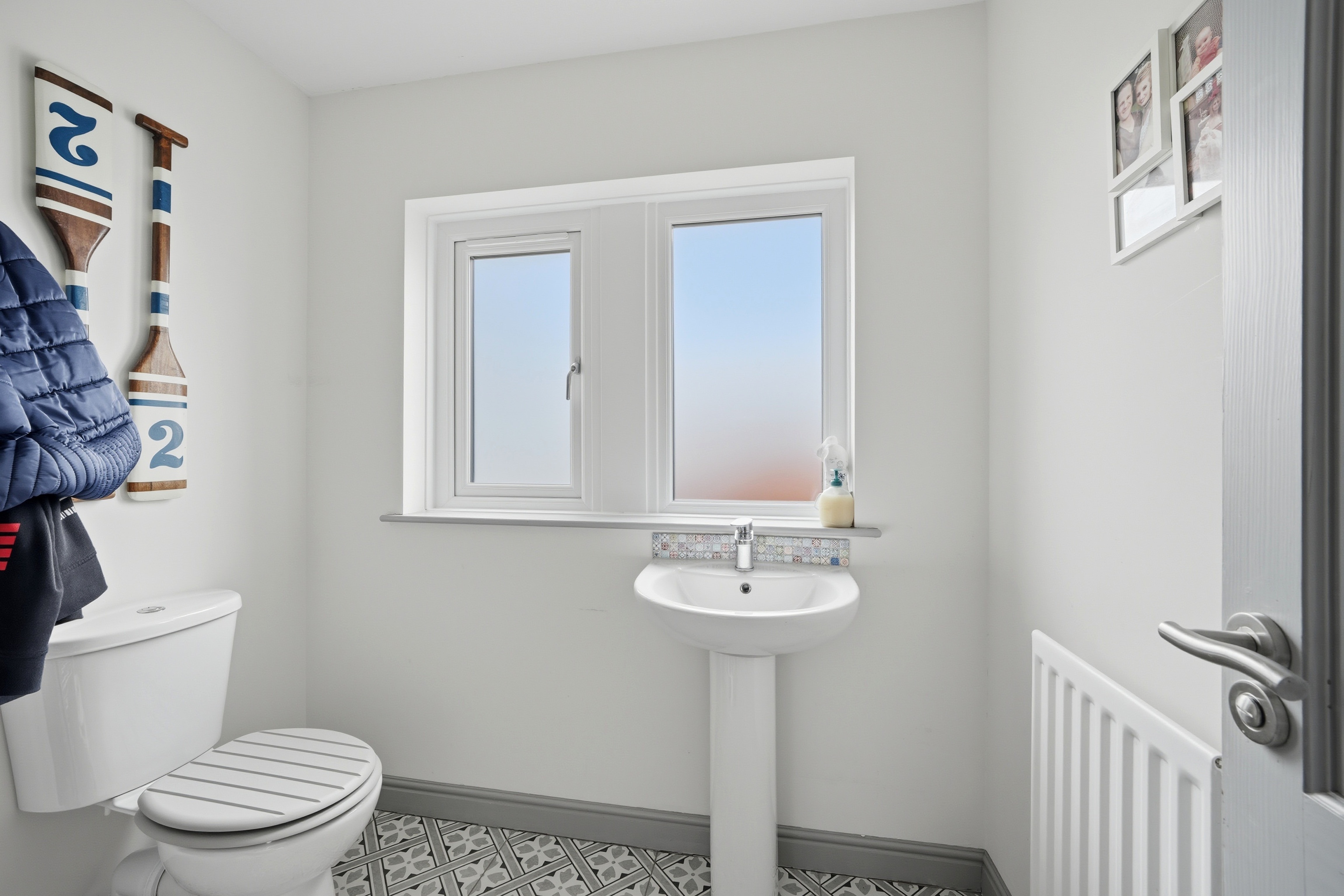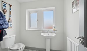 With frosted uPVC double glazed windows, inset LED downlighters, central heating radiator, tiled floor, useful storage cupboard beneath the staircase and fitted with suite comprising pedestal wash basin with chrome monobloc tap, tiled splashback and low flush w.c.