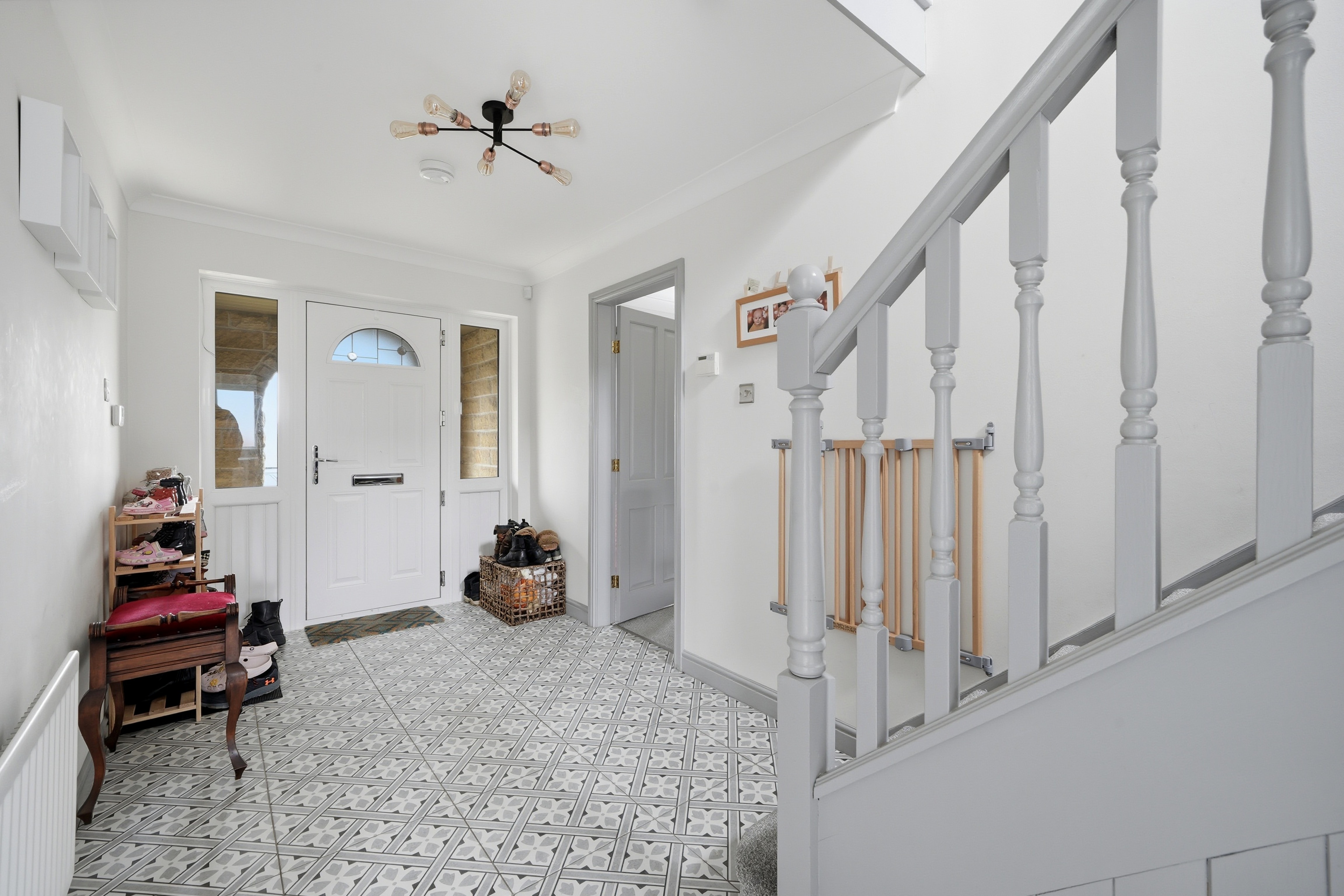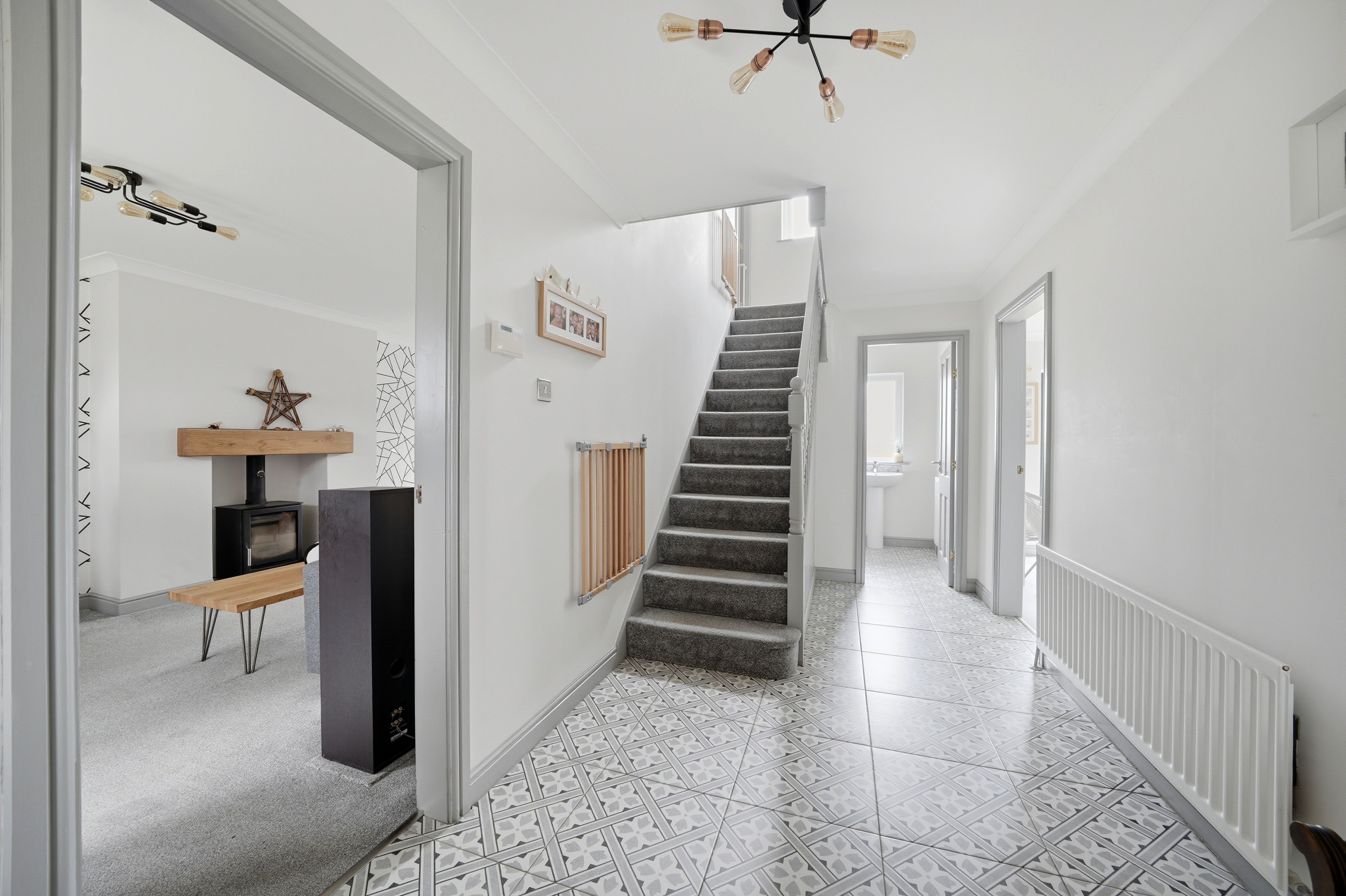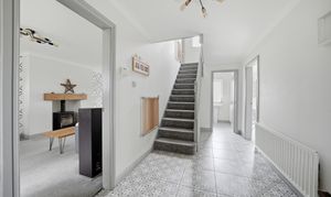With a composite panelled and frosted double glazed door with uPVC double glazed windows to either side all of which provide this area with natural light. There is a ceiling light point, ceiling coving, central heating radiator, tiled flooring and to one side a spindled staircase rises to the first floor. From the hallway access can be gained to the following rooms: -