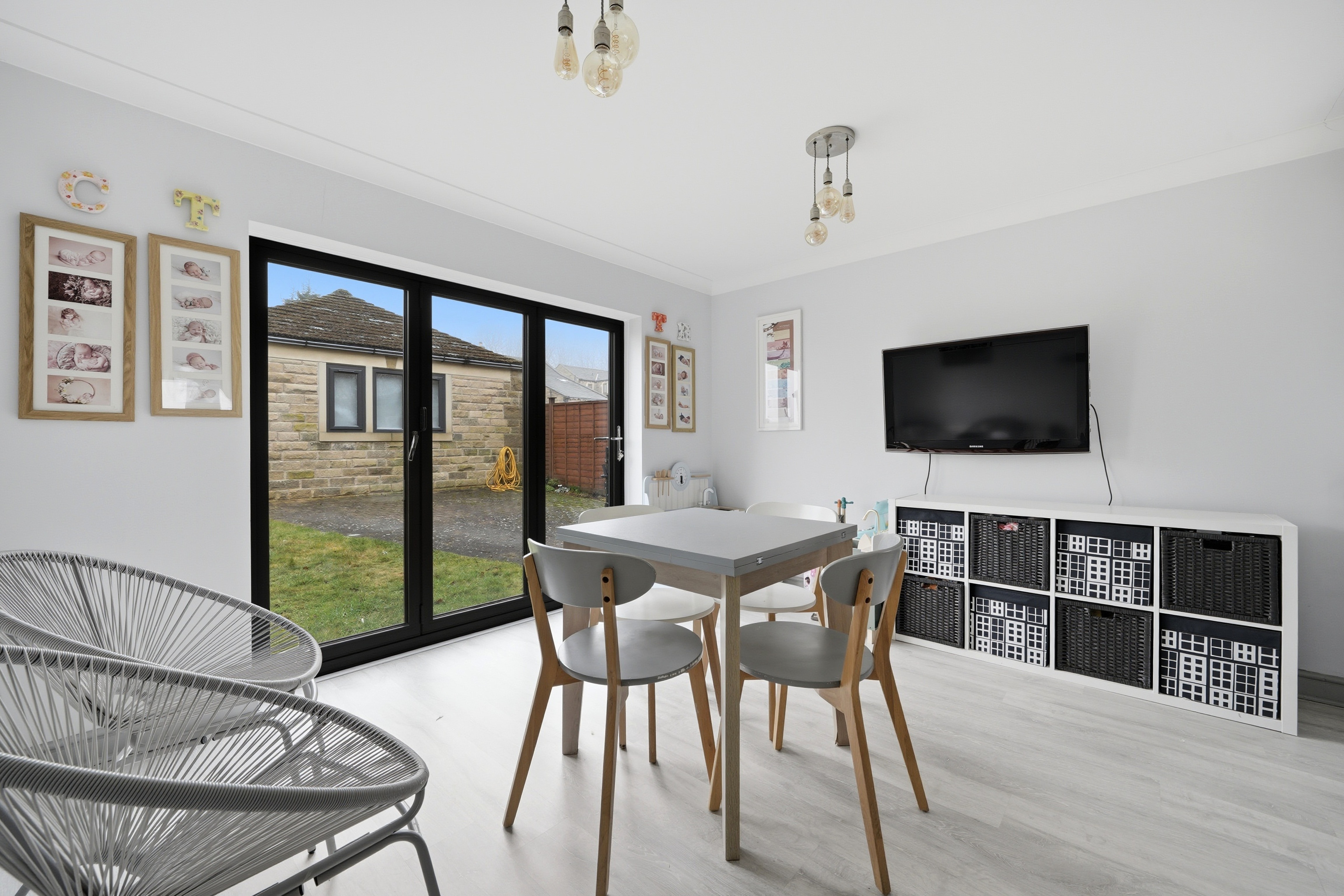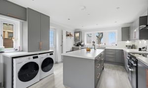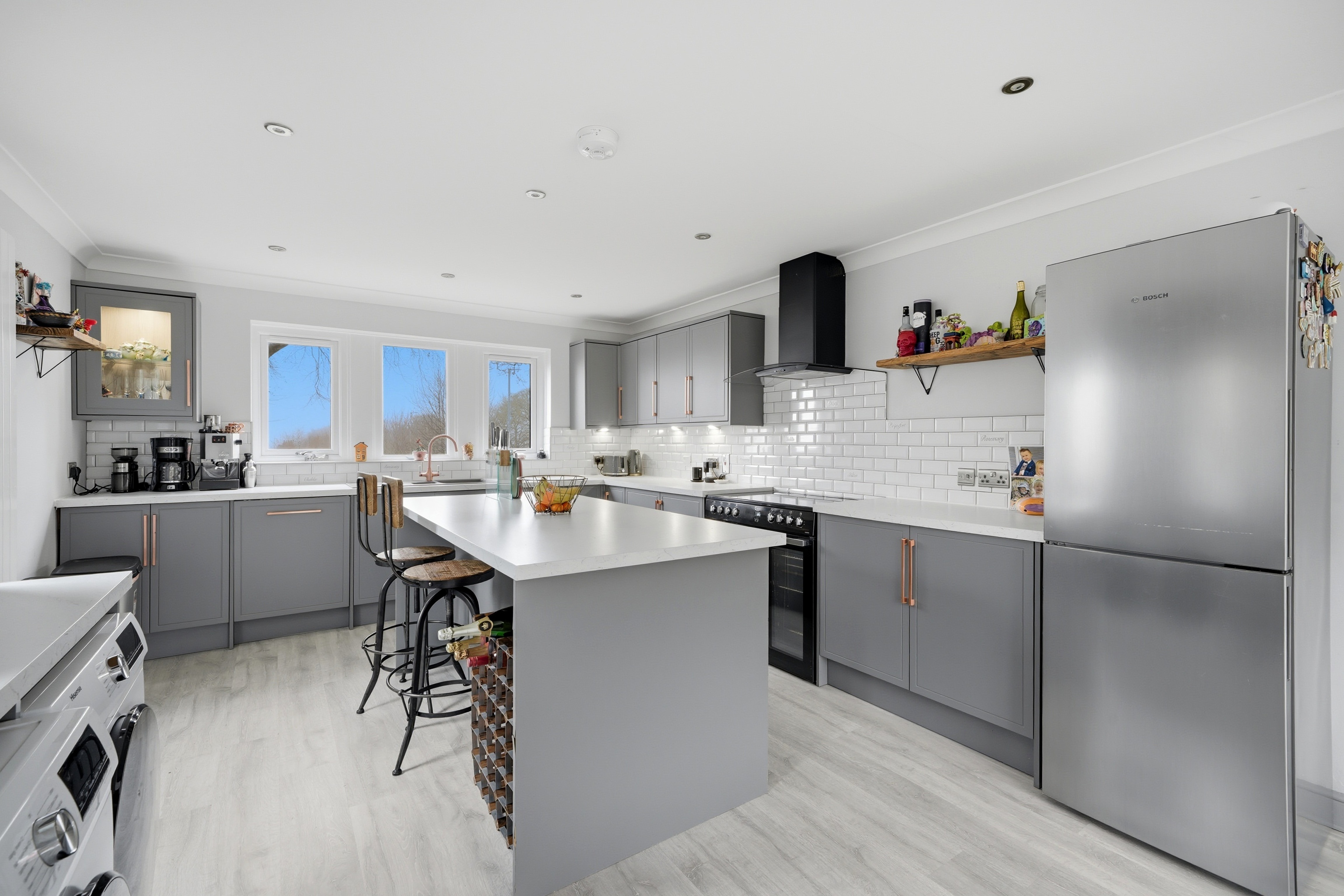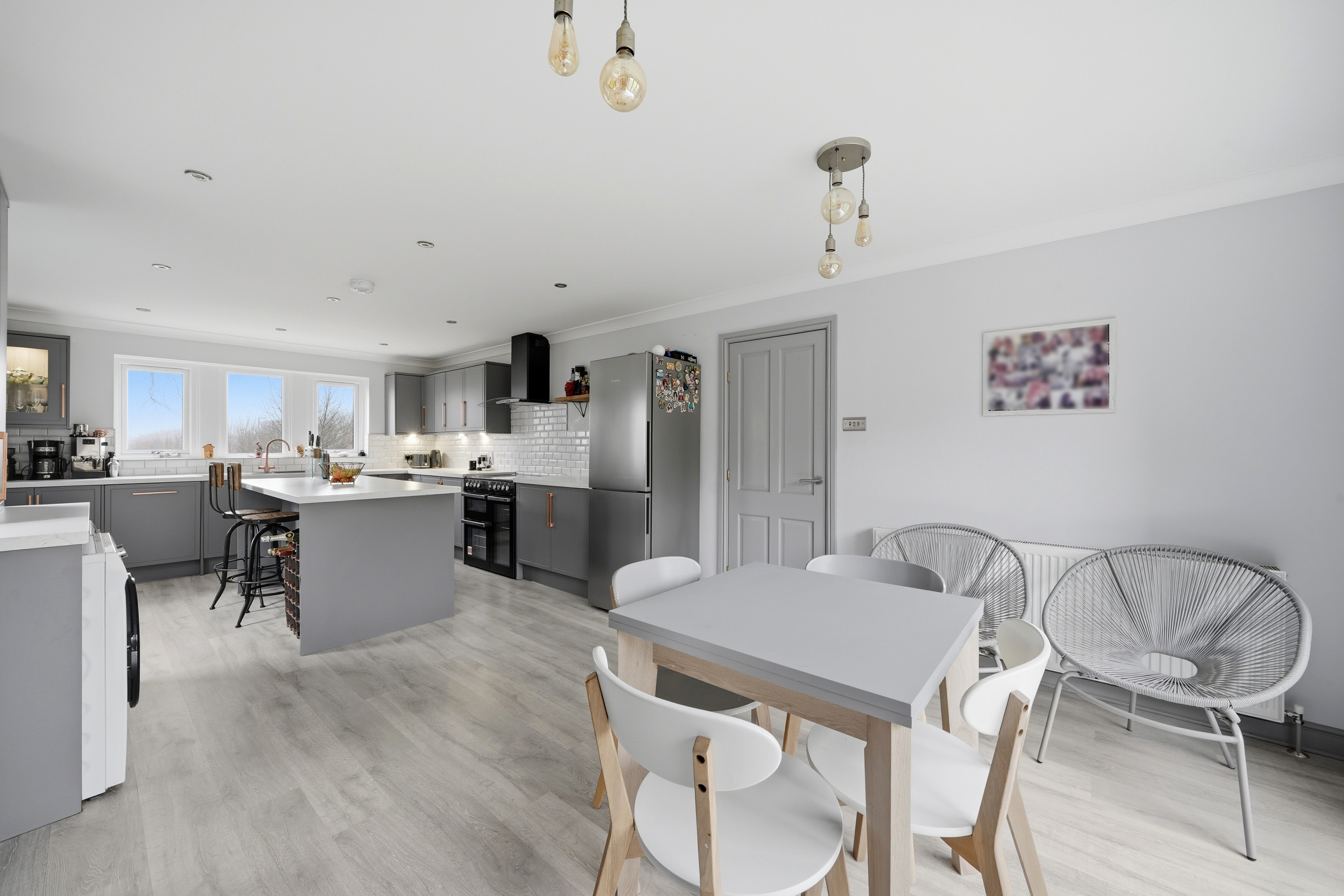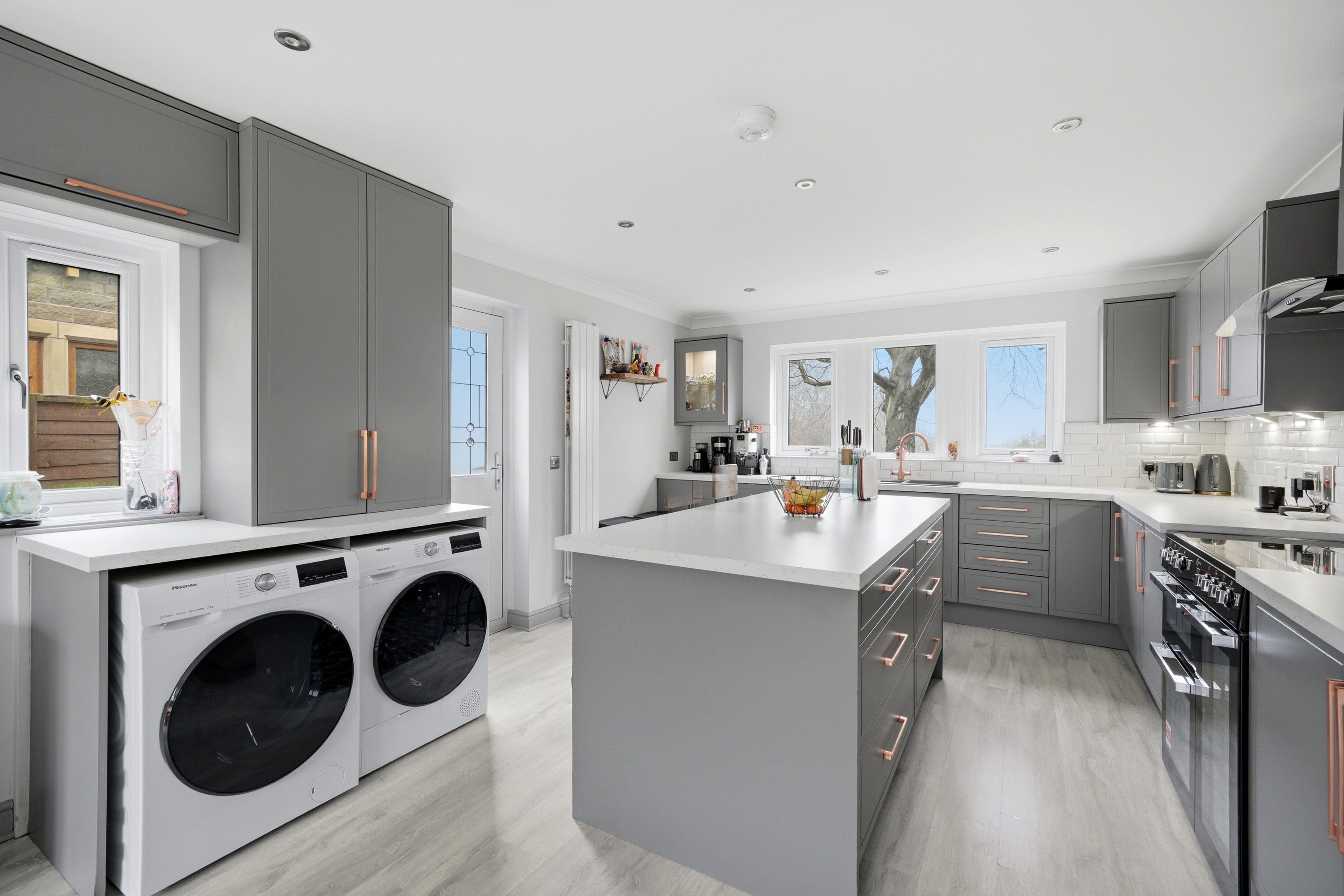Once again as the dimensions indicate this is a particularly spacious room with uPVC double glazed windows to the front elevation enjoying a pleasant aspect, in addition there is further natural light from aluminium double glazed three section bi-fold doors to the rear and uPVC sealed unit double glazed window with adjacent composite panelled and frosted double glazed door to the side elevation. There are inset LED downlighters to the kitchen section, two ceiling light points to the dining and with central heating radiator and vertically hung radiator, grey plank effect laminate flooring and fitted with a range of grey base and wall cupboards, drawers, these are complimented by brushed copper handles with contrasting overlying worktops and tiled splashbacks, there is an inset one and half bowl single drainer sink with brushed copper mixer tap, a Flavel range style cooker with a five ring halogen hob, twin electric ovens and grill ( this is available by separate negotiation at a price t