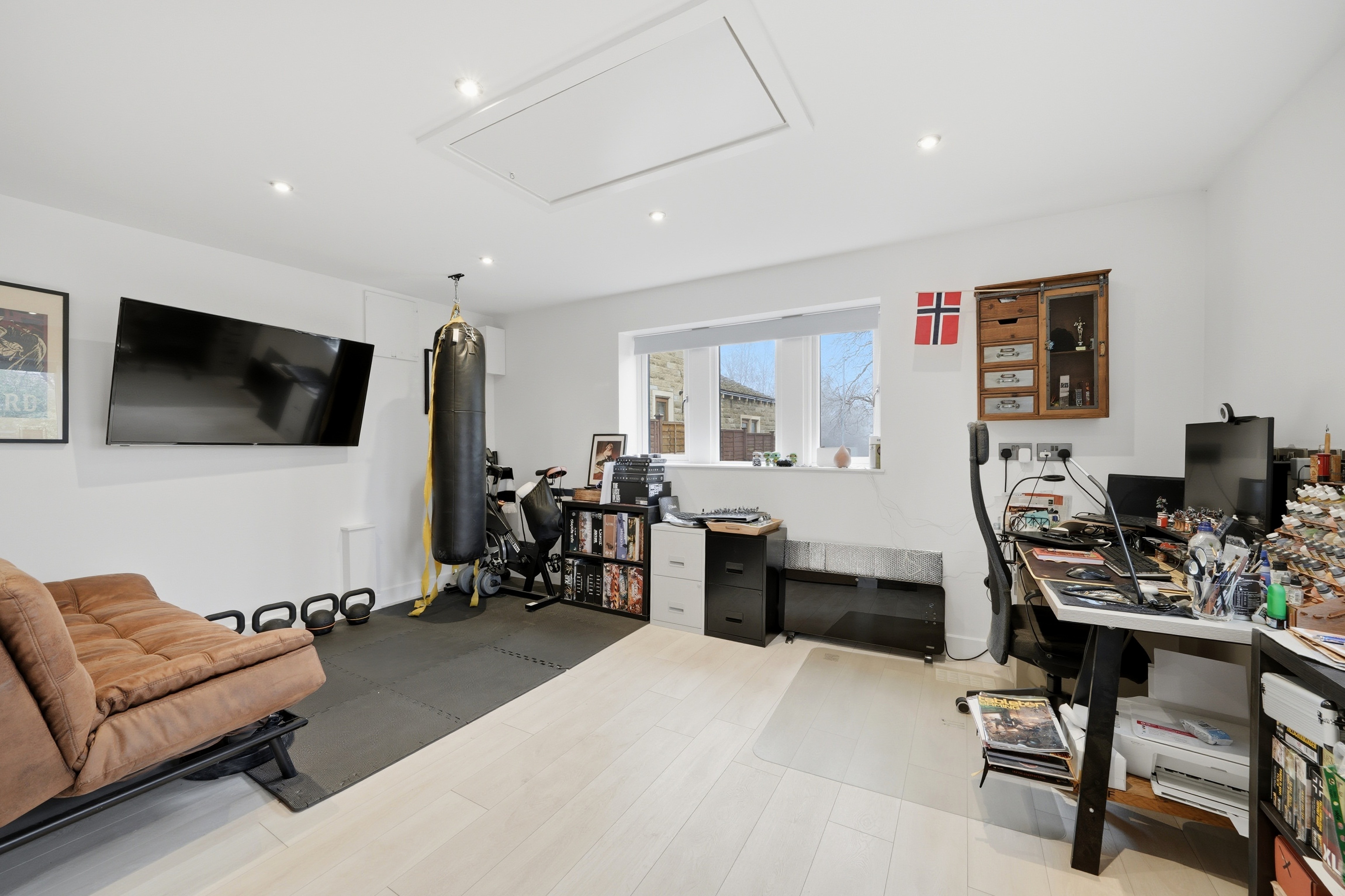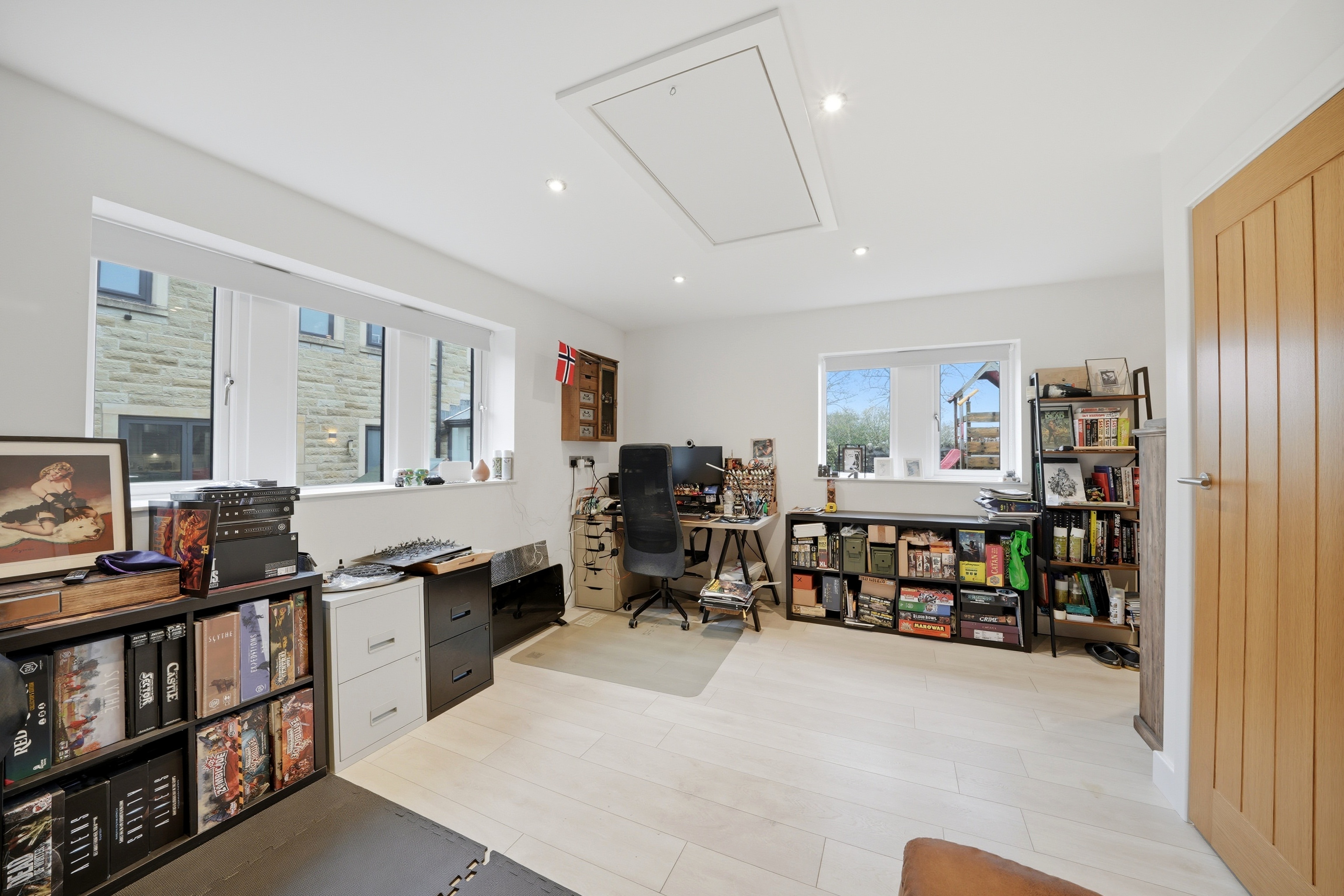 With dual aspect uPVC double glazed windows, inset LED downlighters, grey plank effect laminate flooring and with insulated walls and ceiling together with a loft access with fold down timber ladder leading to a centrally bordered loft space. To one side there is a door giving access to a storeroom.