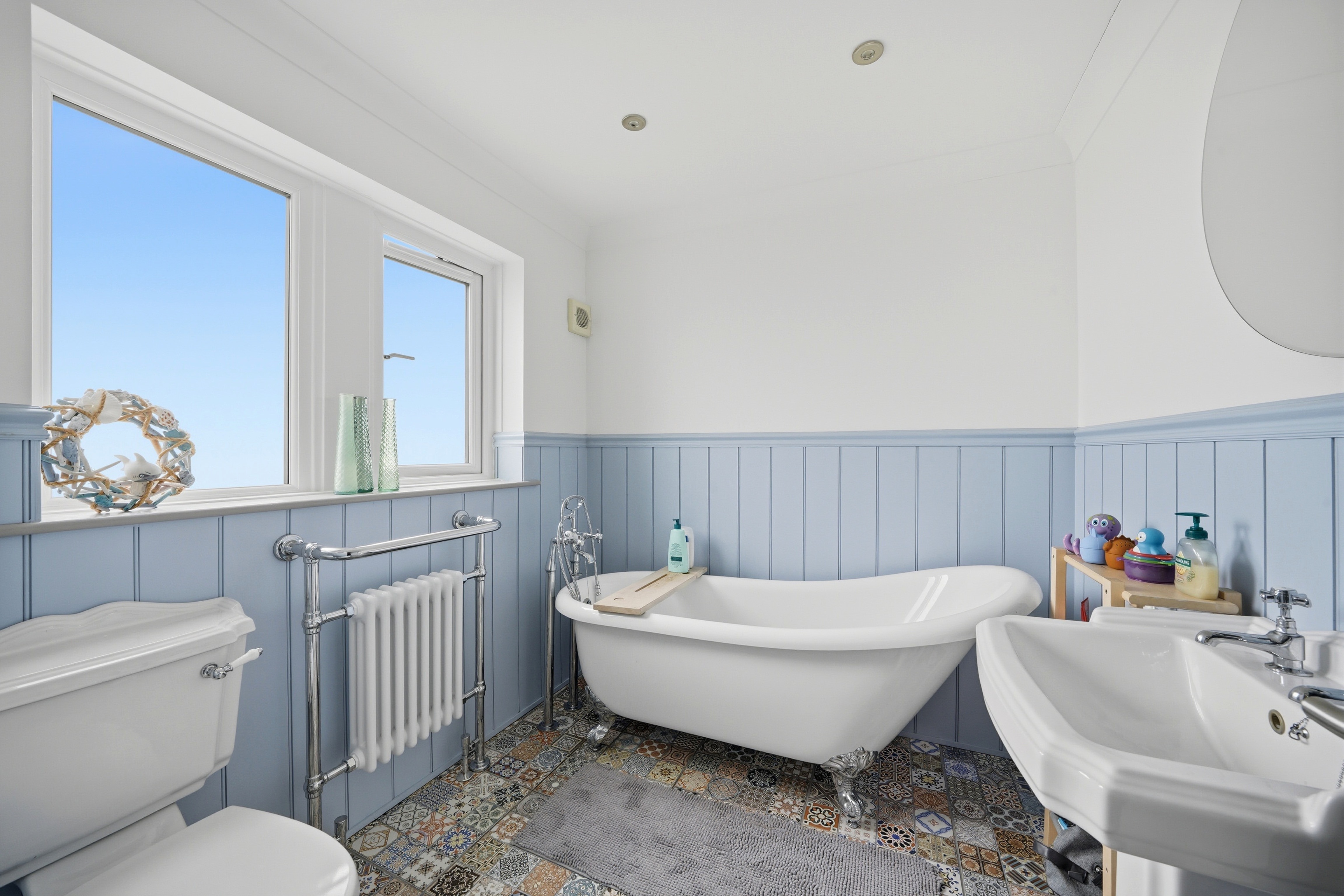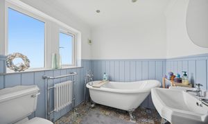With frosted uPVC double glazed window, inset LED downlighters, extractor fan, ceiling coving, two and grove panelled walls to dado height, tiled floor, chrome heated towel rail incorporating column radiator and fitted with a suite comprising free standing and slipper roll top bath resting on ball and claw feet with free standing chrome mixer tap incorporating hand spray, pedestal wash basin and low flush w.c.