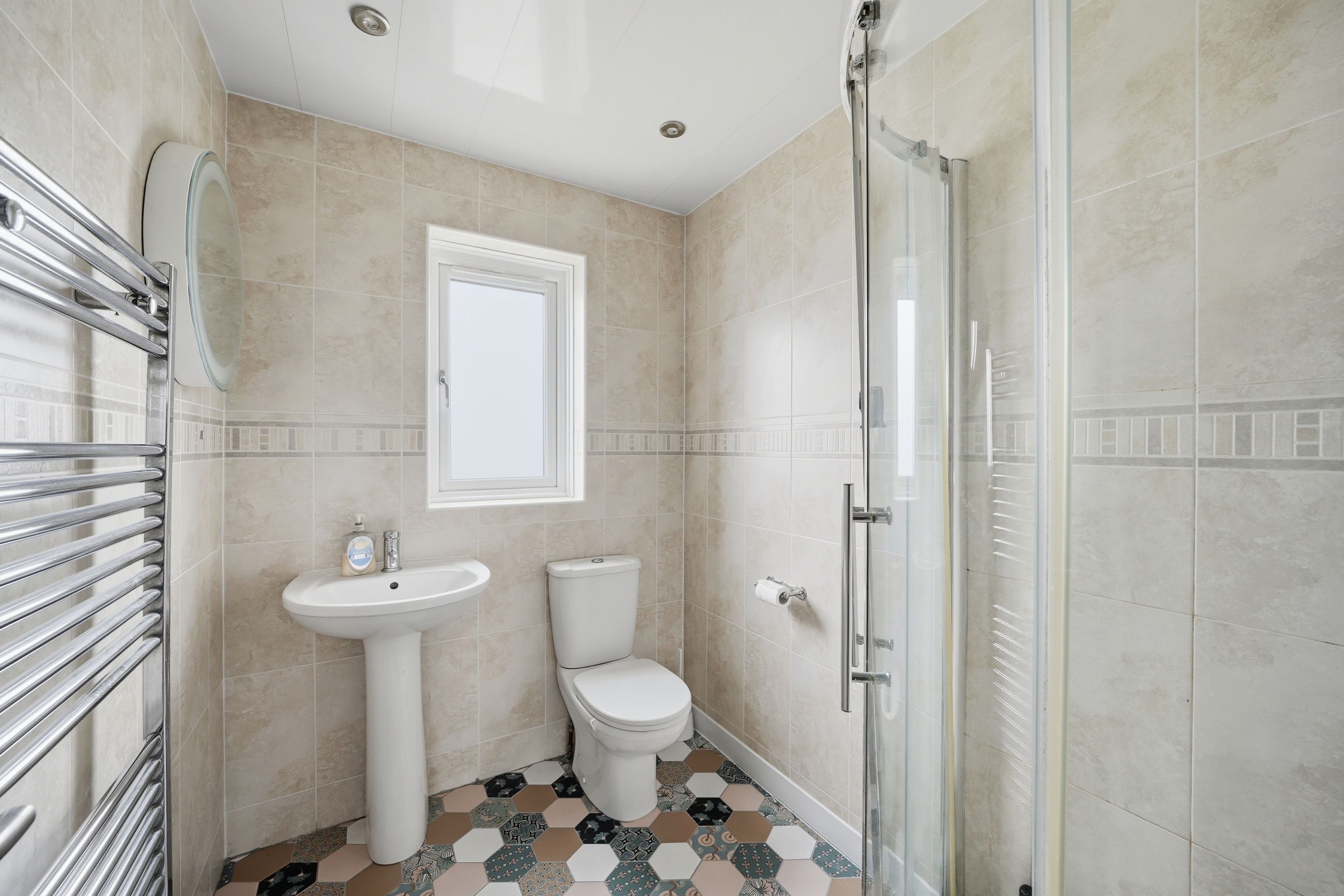 With a frosted uPVC double glazed window ,inset LED downlighters, extractor fan, floor to ceiling tiled walls, tiled floor, chrome ladder style heated towel rail and fitted with a suite comprising pedestal wash basin with chrome monobloc tap, low flush w.c and corner shower cubicle with chrome shower fitting.