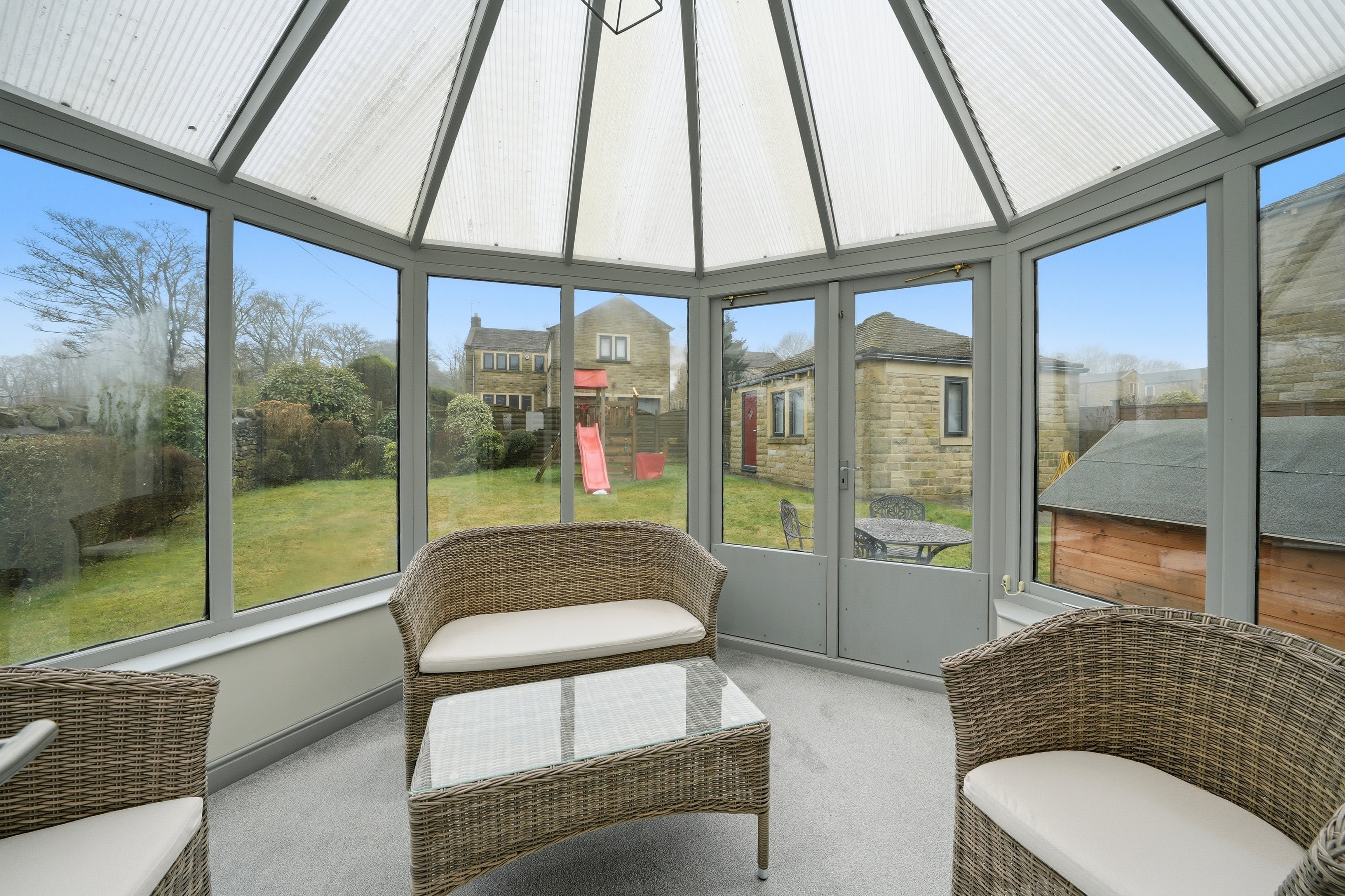 To the front of the property there is a lawned garden with planted trees, flowers and shrubs and bordered by a dry-stone wall. To the rear there is an outside cold-water tap, shaped lawned garden with a southerly aspect, flagged patio, planted trees and shrubs, timber fence and dry-stone wall boarder and the former stone built double garage which has now been converted to a home office, store and gym. To the rear of the office there is a lean-to timber shed.