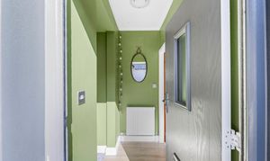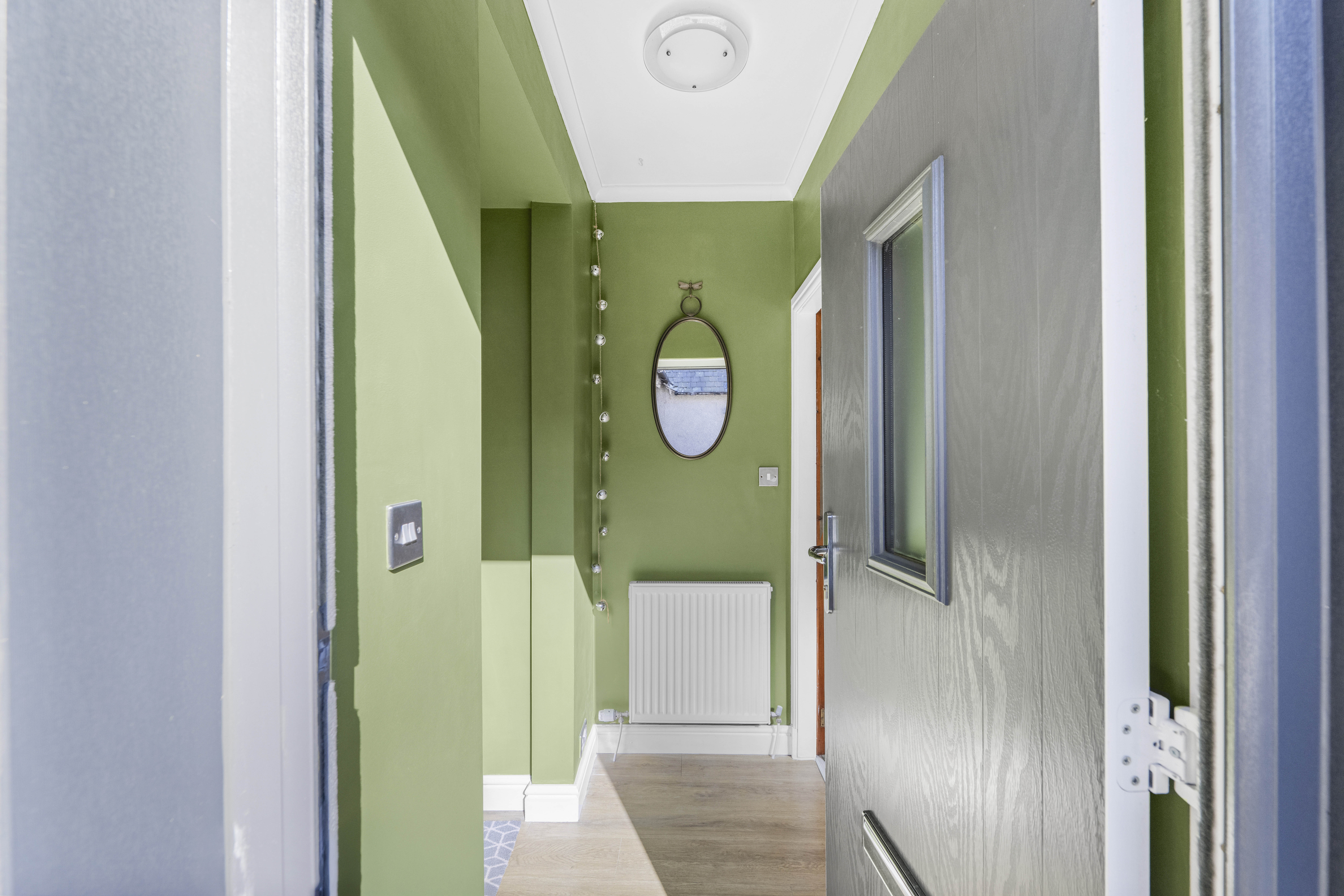 Composite door with opaque glazed inset into hallway. Door to bathroom and glazed door to lounge. Laminate flooring through hall, lounge, inner hall and WC. Radiator.