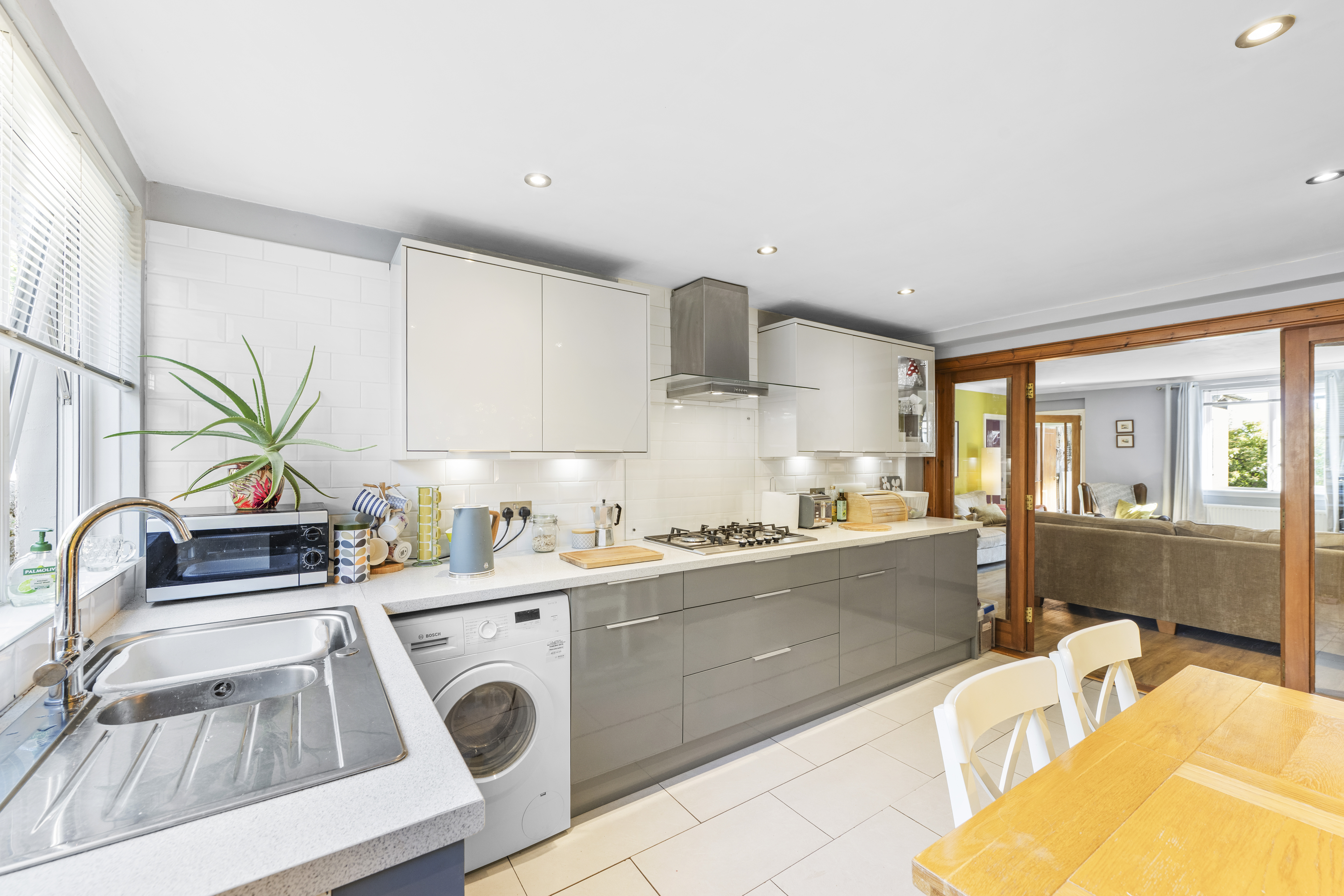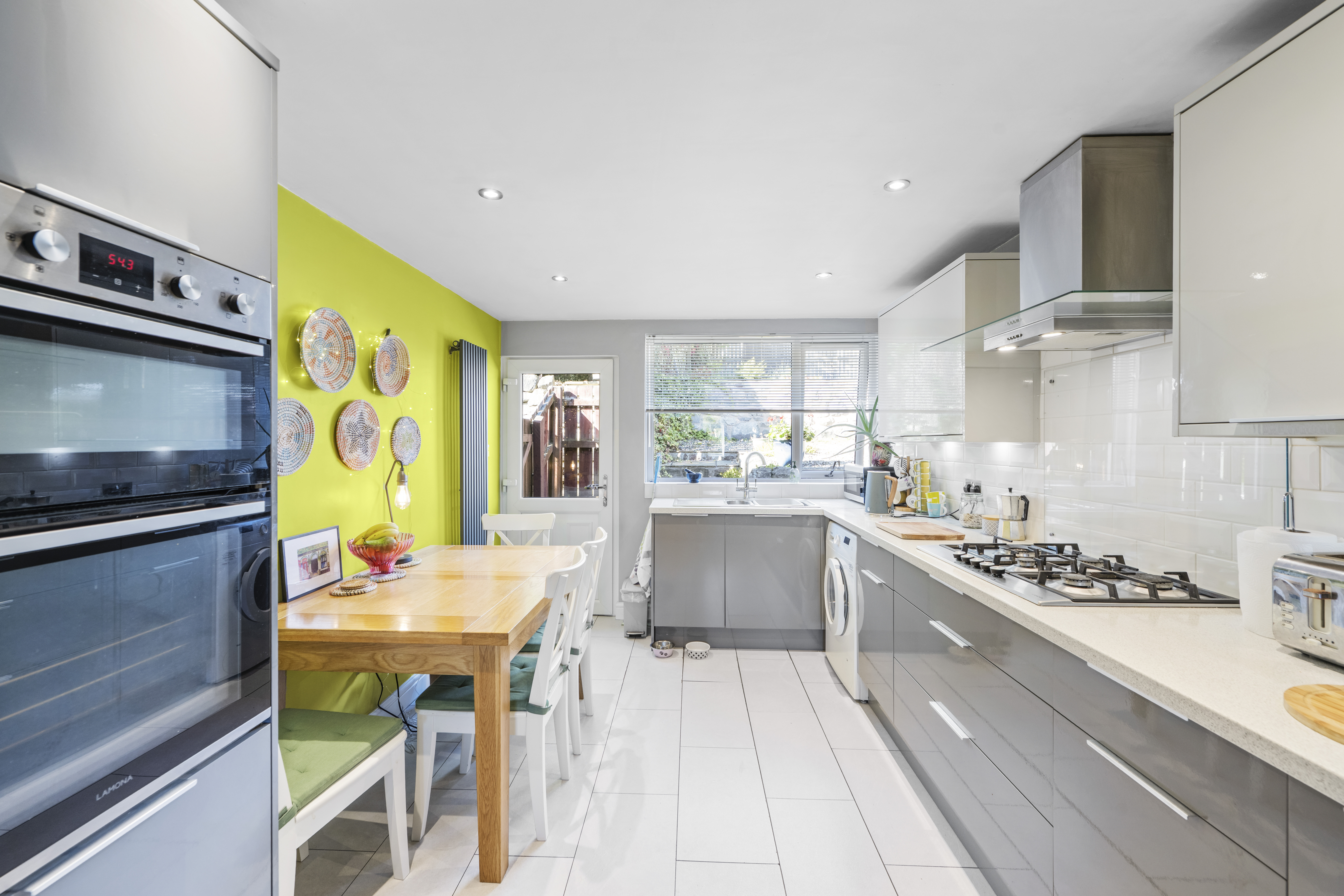Fitted with base and wall mounted units, drawers, five burner hob with glass splashback, cooker hood, wall mounted double oven, integrated fridge/freezer and dishwasher. UPVC/glazed door. Rear facing window with venetian blind. Designer vertical radiator.
