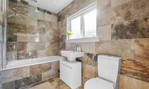 Fully tiled including floor and fitted with dual flush WC, pedestal wash hand basin with mixer tap and bath with shower incorporating rainfall head and glazed screen over. Opaque glazed window with roller blind. Chrome vertical radiator.