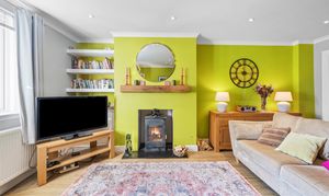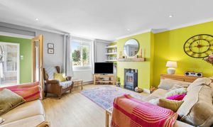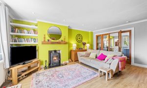 Spacious sitting room with front facing window and venetian blind. Four glazed doors to kitchen/dining room. Doors to bedroom one and inner hall. Log burner with marble hearth. Radiator, downlighters.