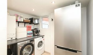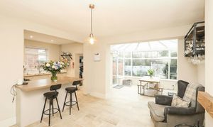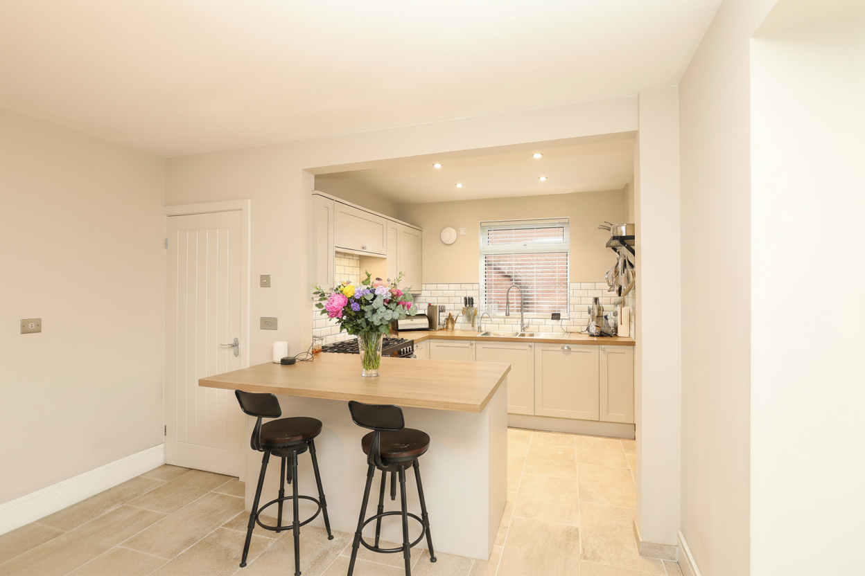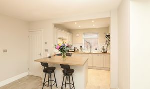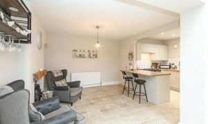 Upon entering, a welcoming hallway sets the tone for the space and quality found throughout. The heart of the property is the impressive open-plan living space to the rear. The contemporary kitchen is thoughtfully designed and fitted with a range of integrated appliances, a range cooker and a breakfast bar, providing both practicality and style for everyday living. The dining area creates a warm and inviting atmosphere, centred around a feature log-burning stove. This space flows seamlessly into a delightful garden room which enjoys views over the landscaped rear garden, an ideal setting for relaxing or entertaining. A separate utility room is conveniently positioned off the kitchen, providing the perfect place to keep everyday laundry discreetly tucked away.