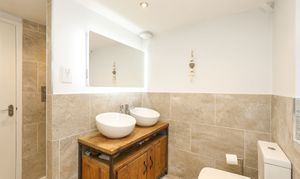 The first floor hosts three well-proportioned bedrooms, including two generous doubles and a comfortable single, offering flexibility for growing families or those requiring a home office. The bedrooms are complemented by a particularly impressive family bathroom, beautifully appointed and finished to a high standard. Featuring a stylish double vanity unit, a contemporary bath and a separate walk-in shower enclosure.