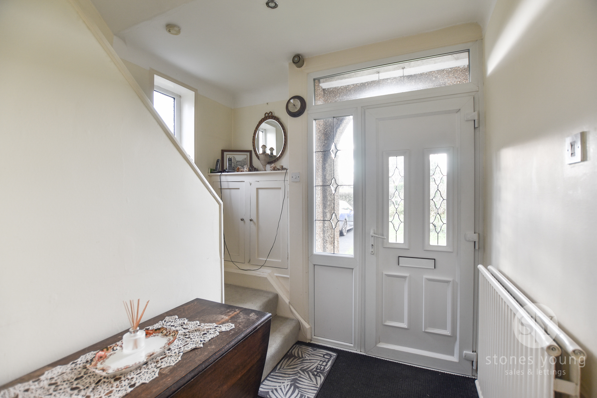 Carpet flooring, ceiling spotlights, stairs to first floor, double glazed uPVC front door, built in storage.