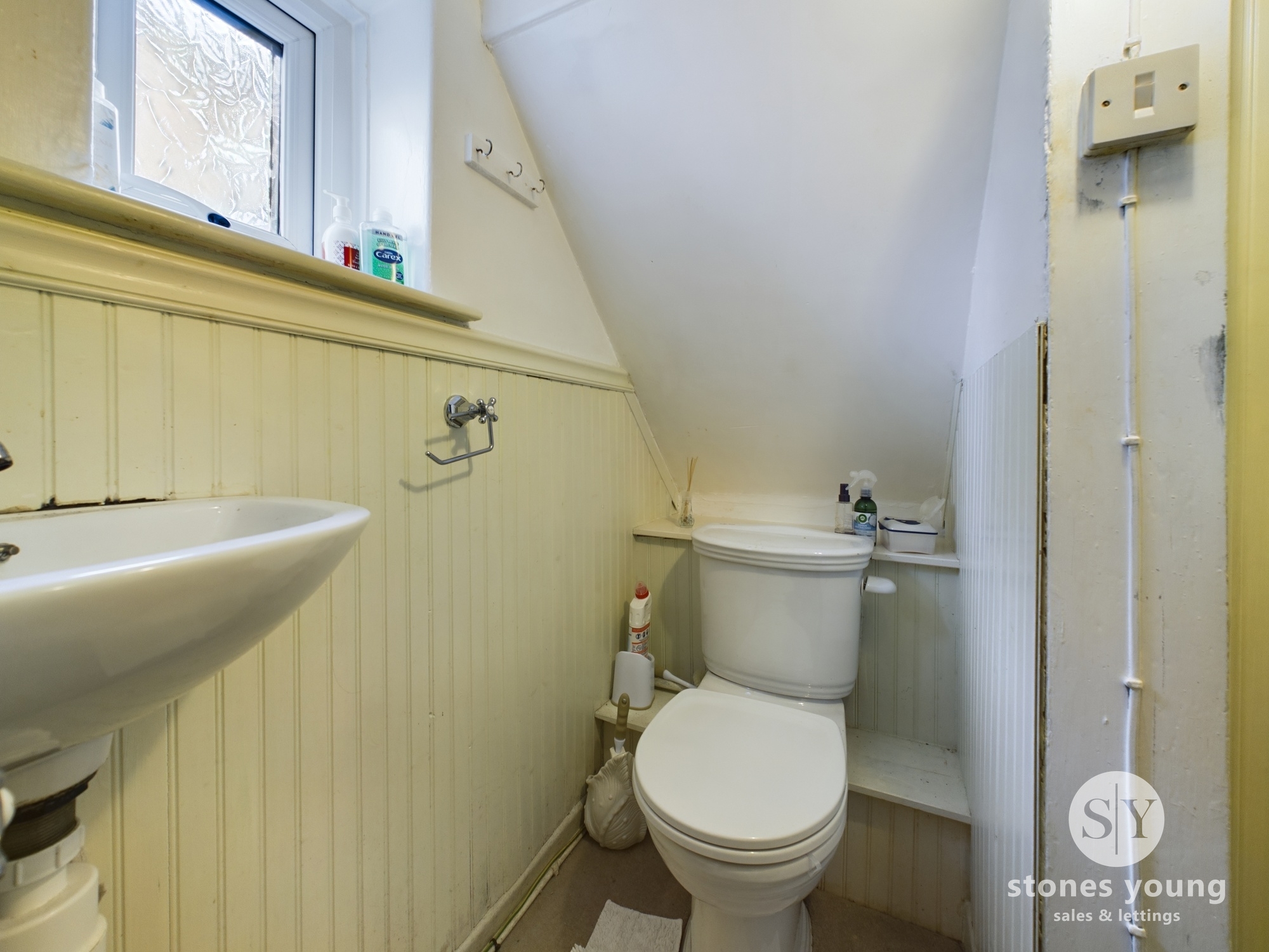 Carpet flooring, loft access, cupboard housing tank, uPVC double glazed window.